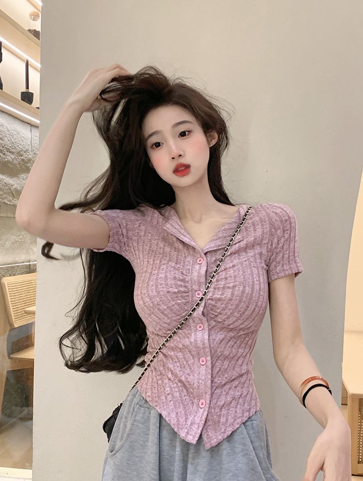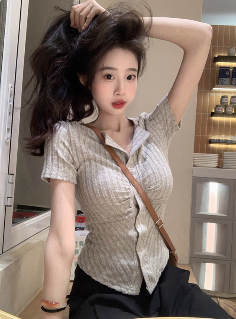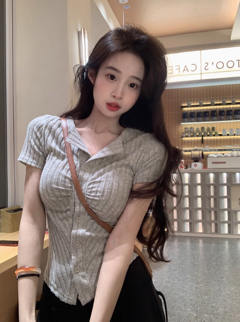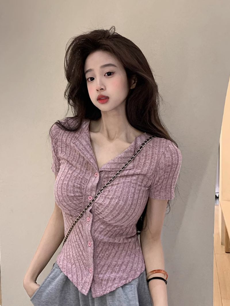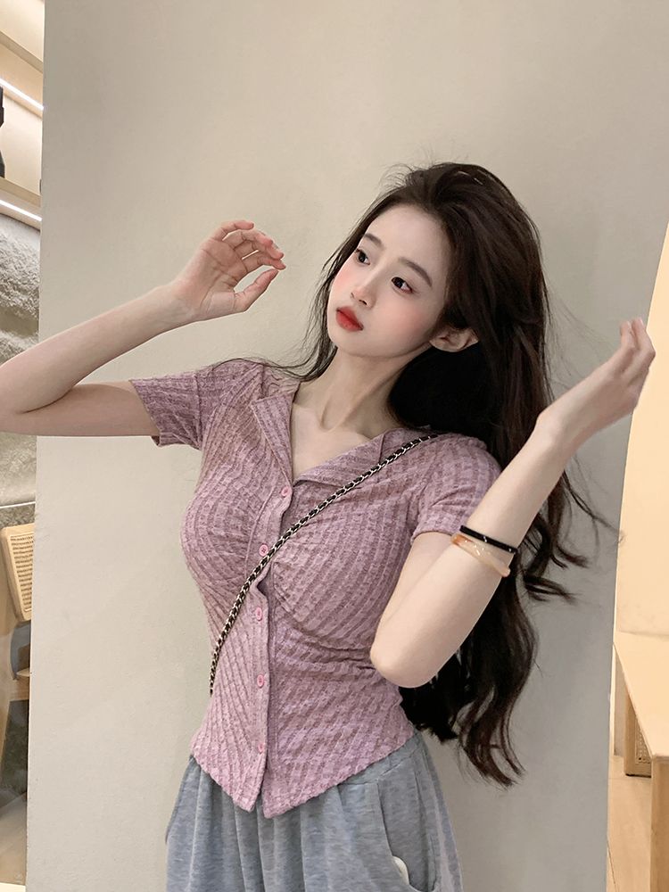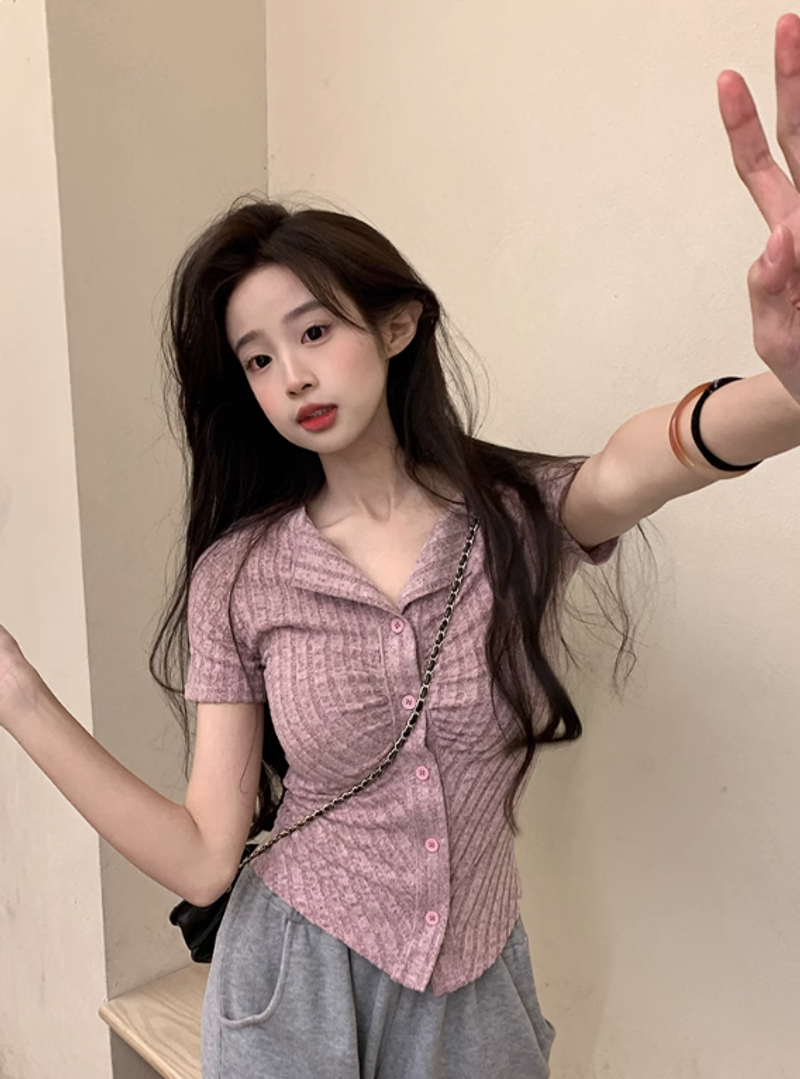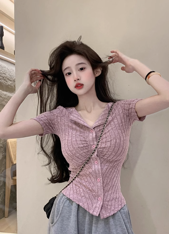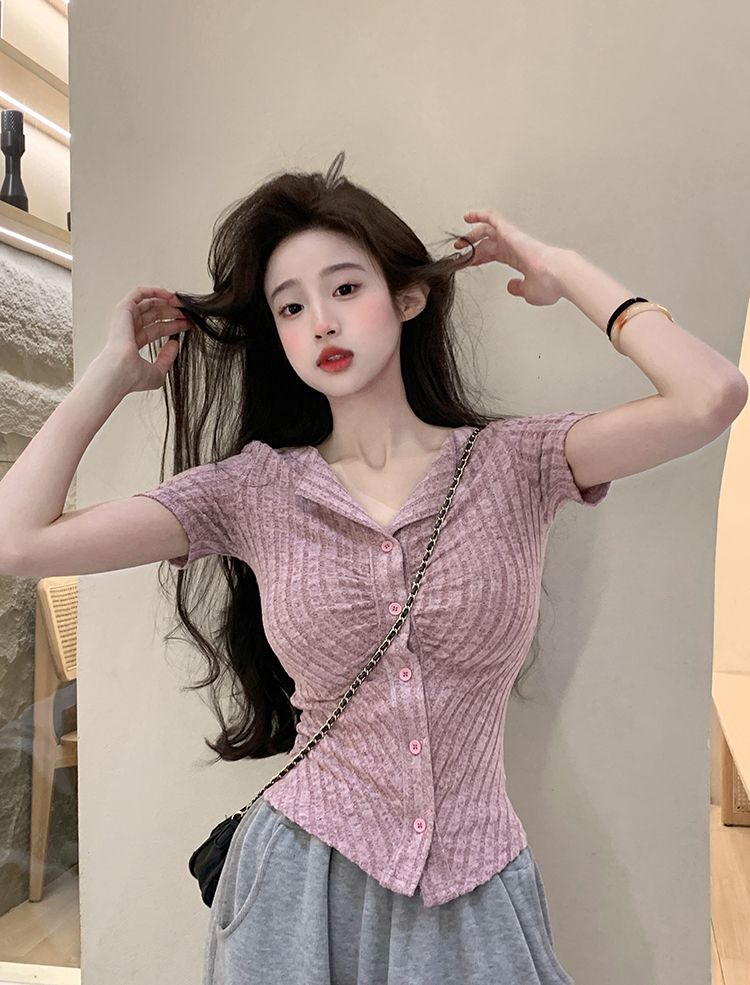 不規則V領冰絲針織短袖T恤女夏季短款小個子修身純欲甜辣收腰上衣