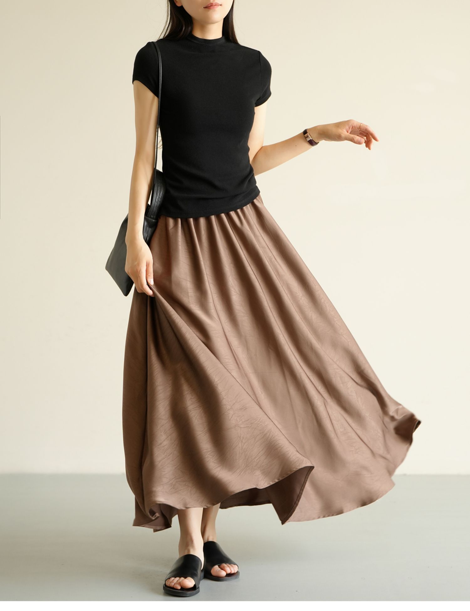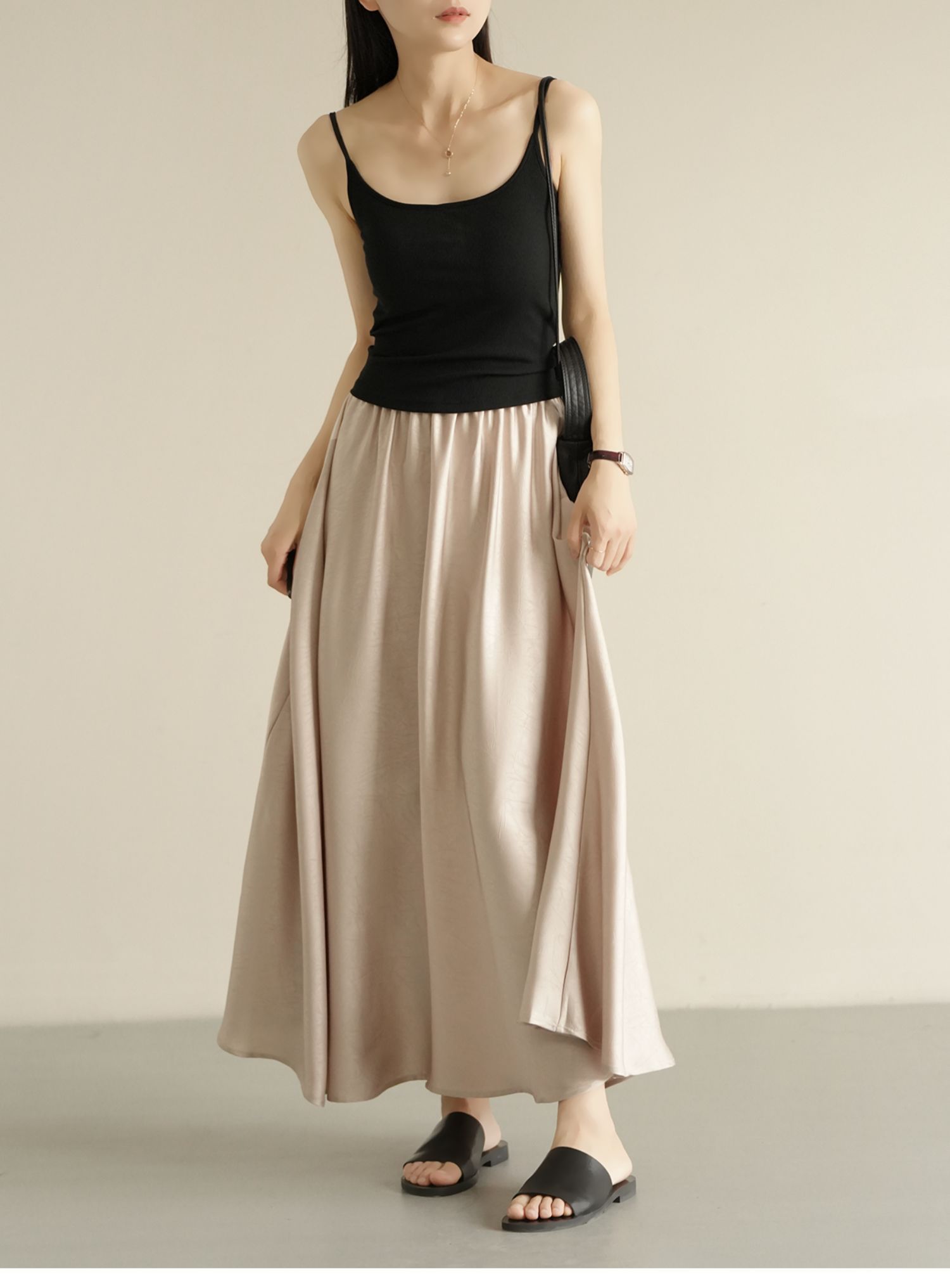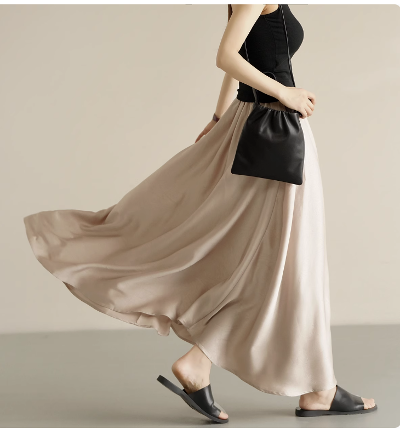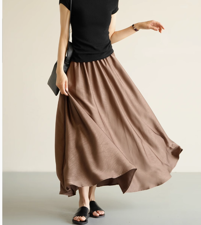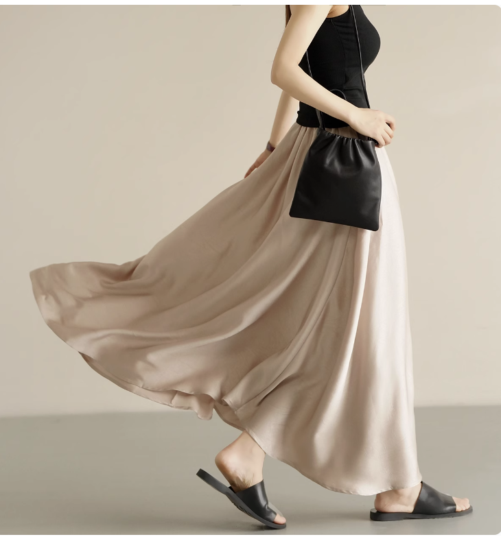 絲滑緞面 女士純色半身裙 高腰A字中長裙 氣質顯瘦裙子 夏款女裝