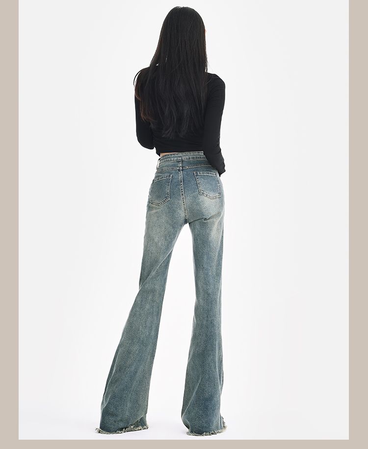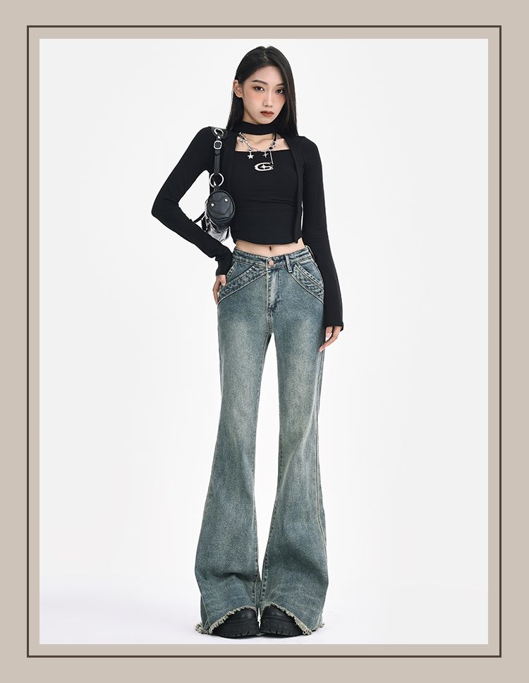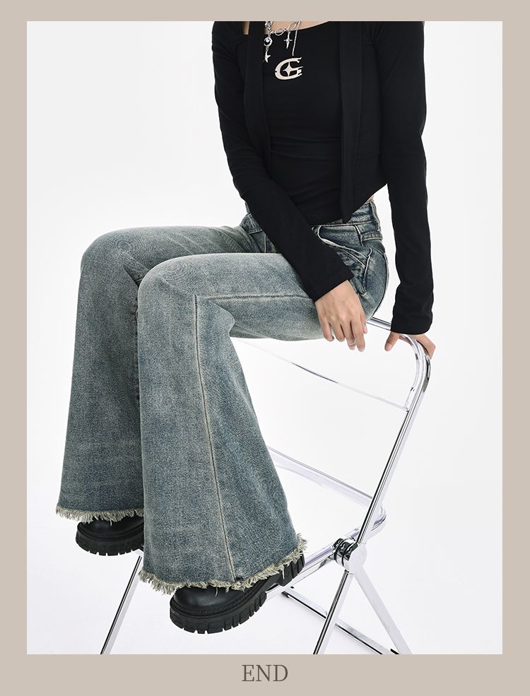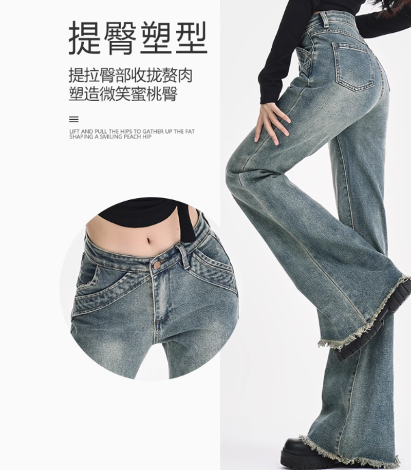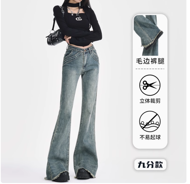 復古設計感毛邊微喇叭牛仔褲女春夏美式低腰辣妹拼接彈力拖地長褲