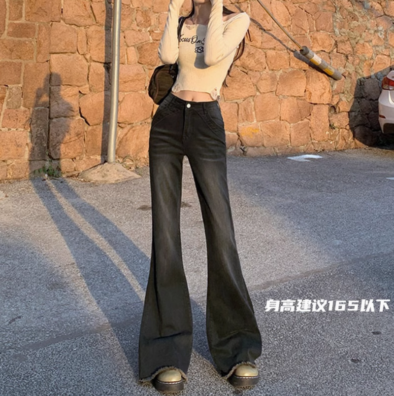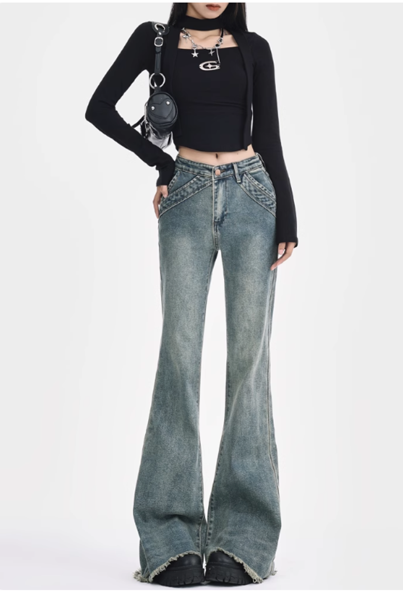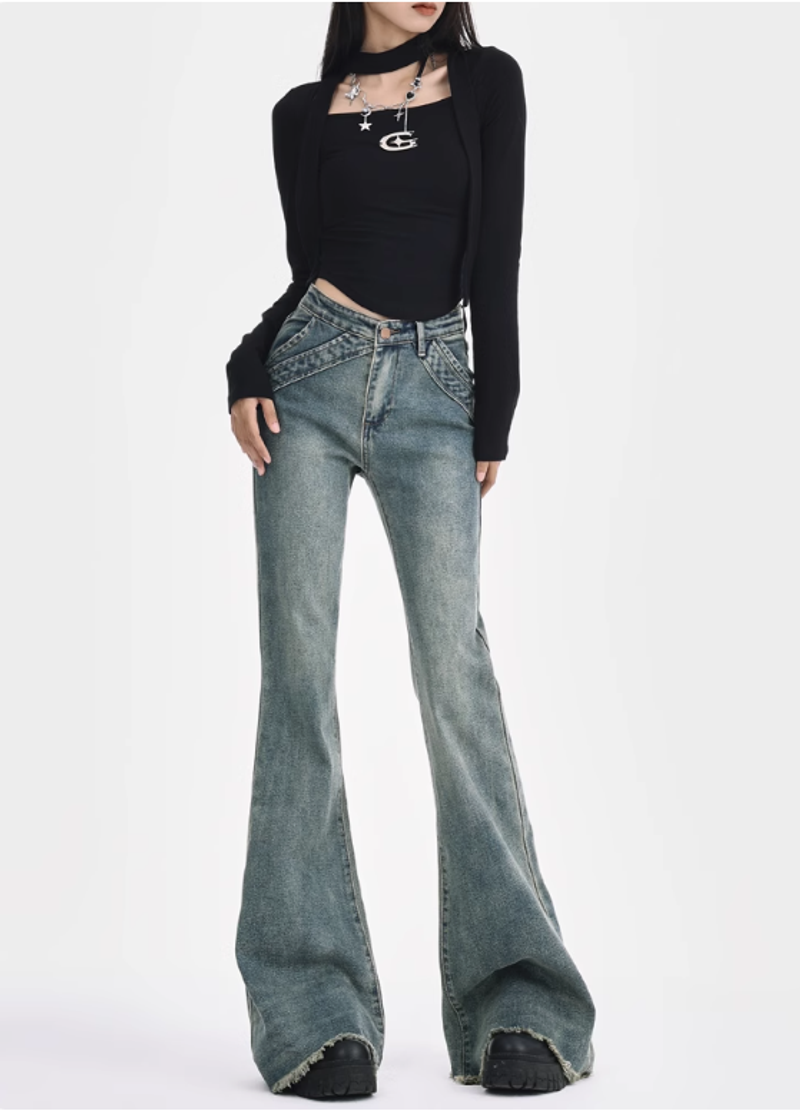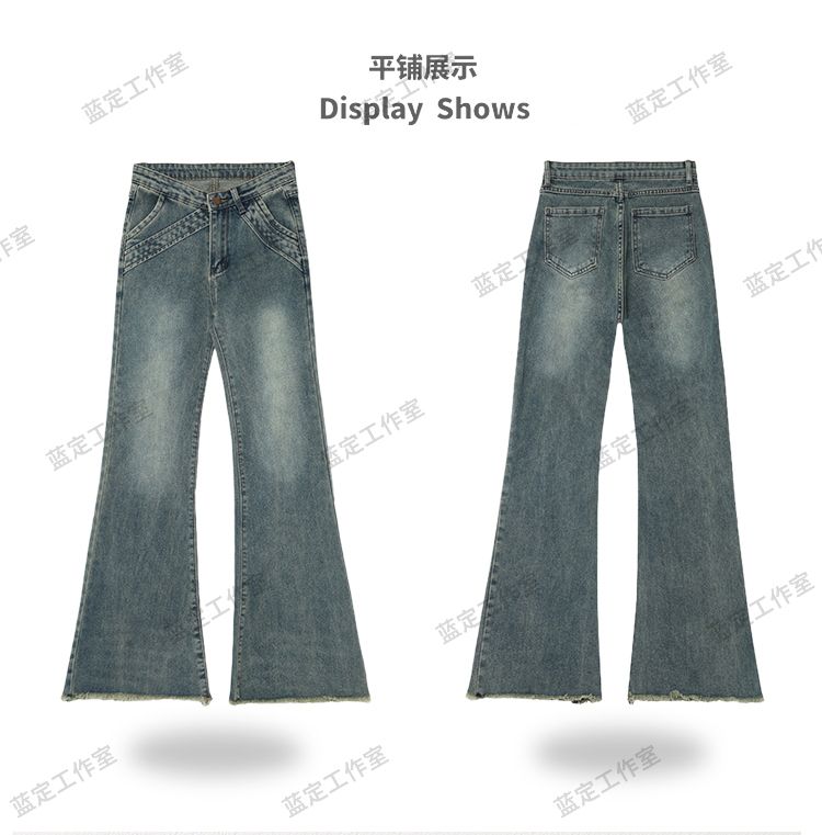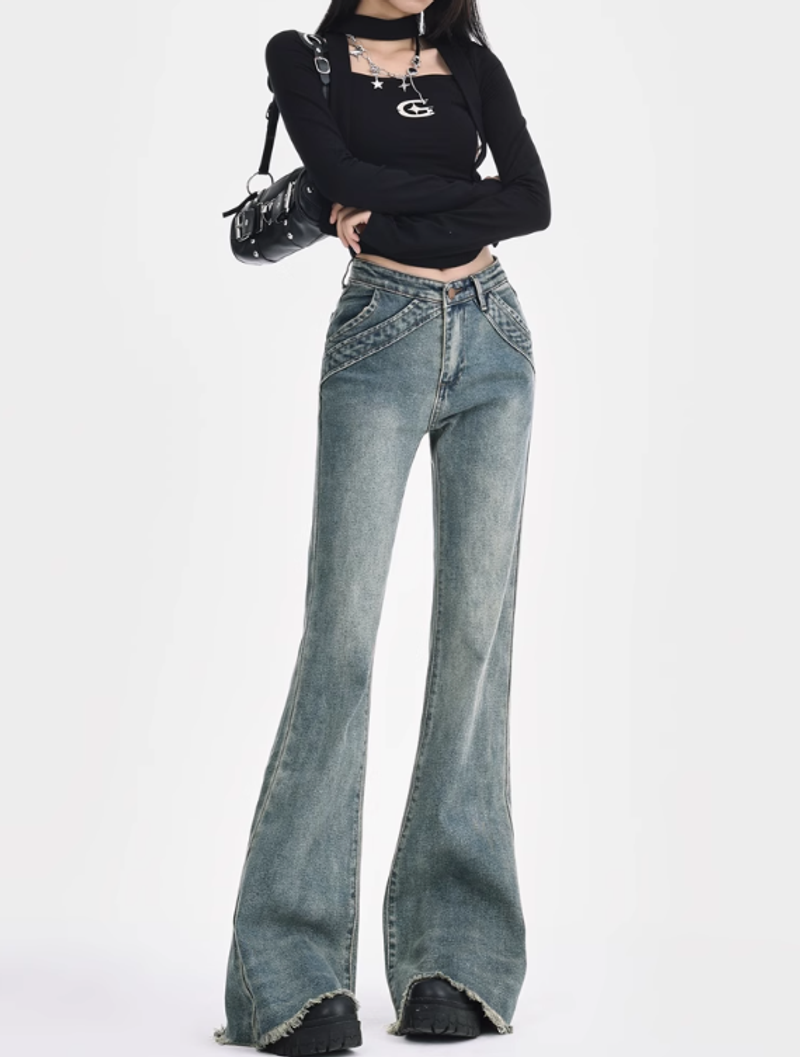 復古設計感毛邊微喇叭牛仔褲女春夏美式低腰辣妹拼接彈力拖地長褲