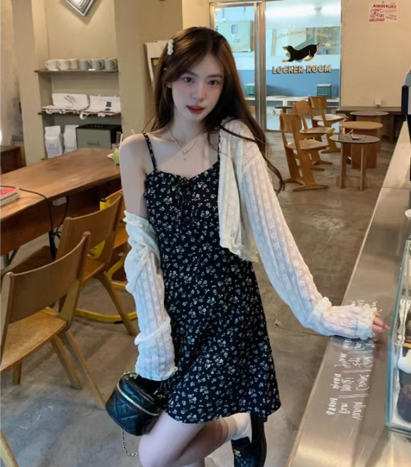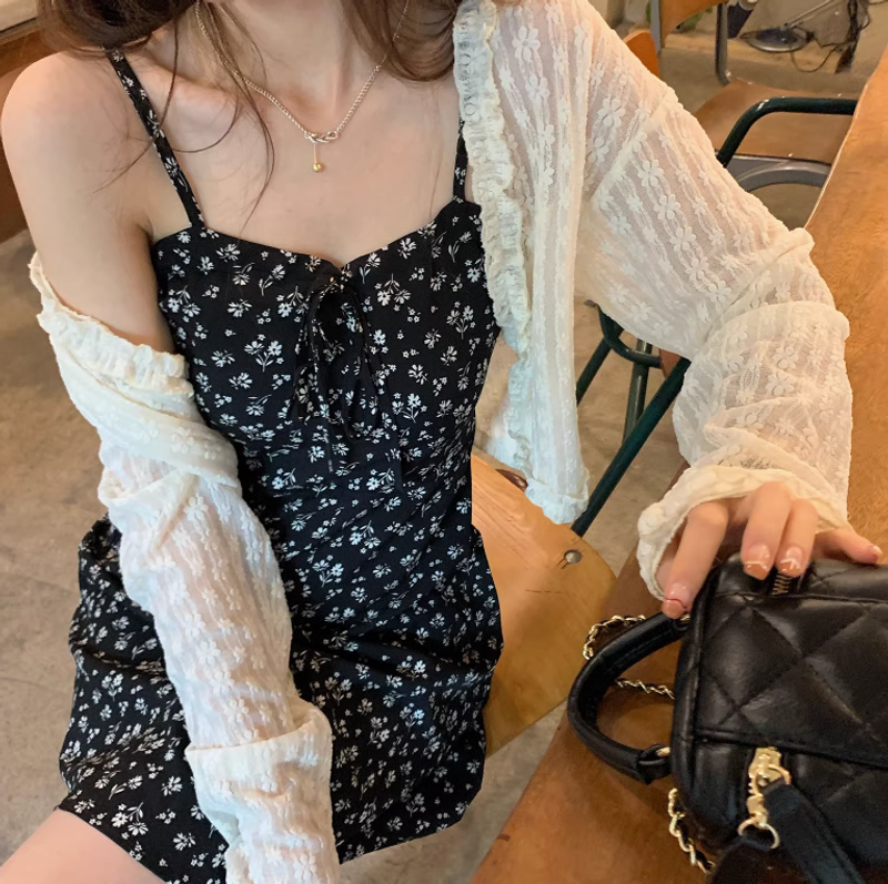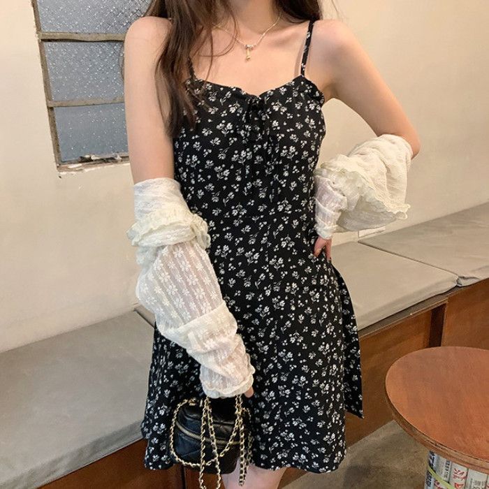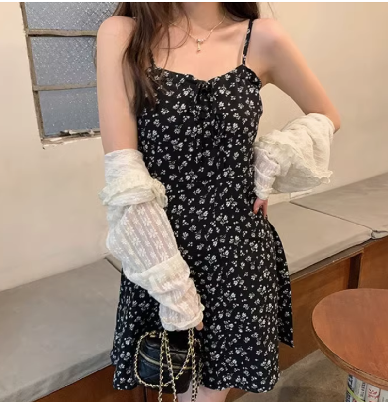 夏款胖mm法式別緻黑色碎花吊帶裙大碼純欲甜辣風顯瘦雪紡連衣裙女