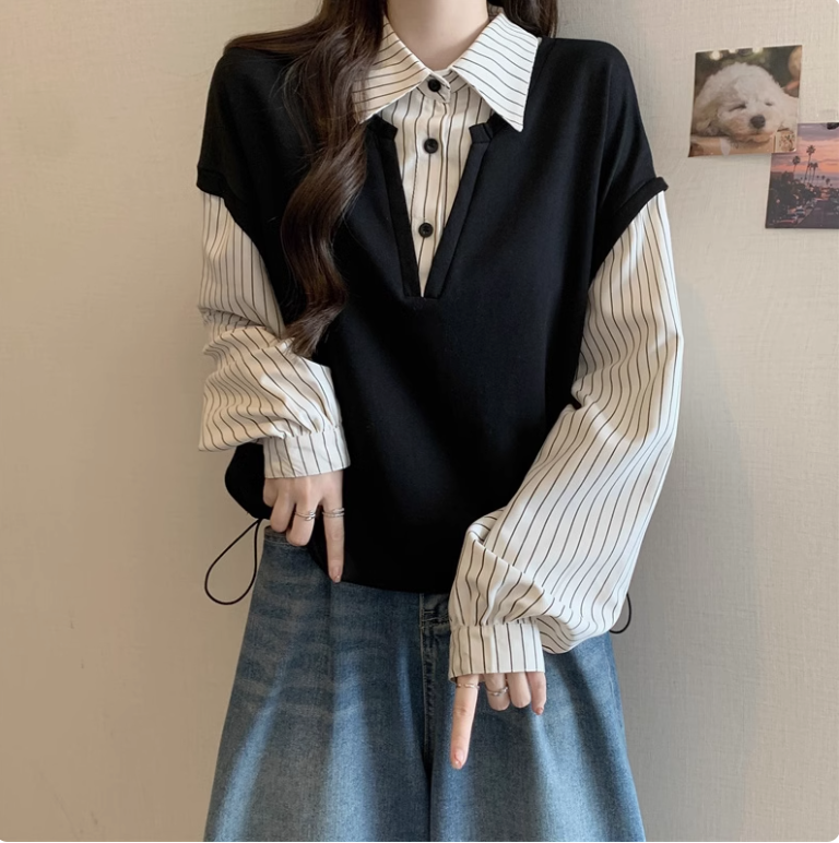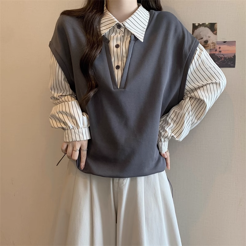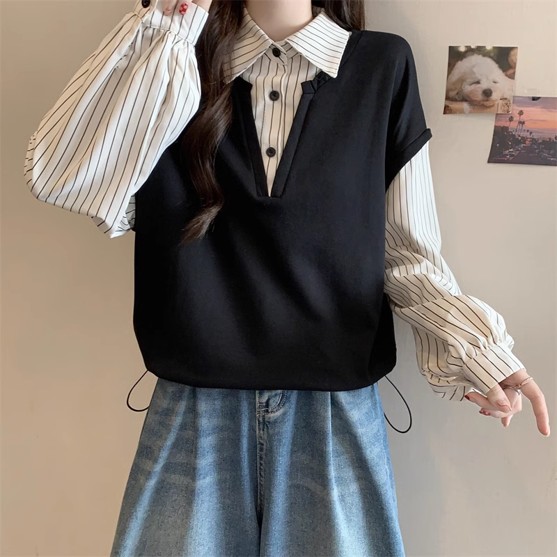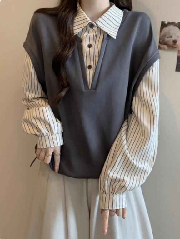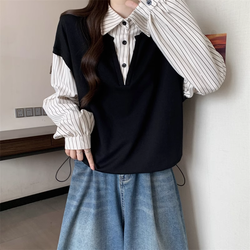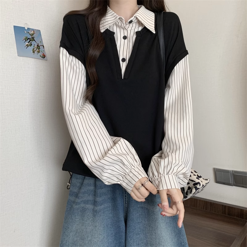 大碼女裝洋氣獨特條紋POLO領長袖襯衫春季胖mm顯瘦寬鬆假兩件上衣