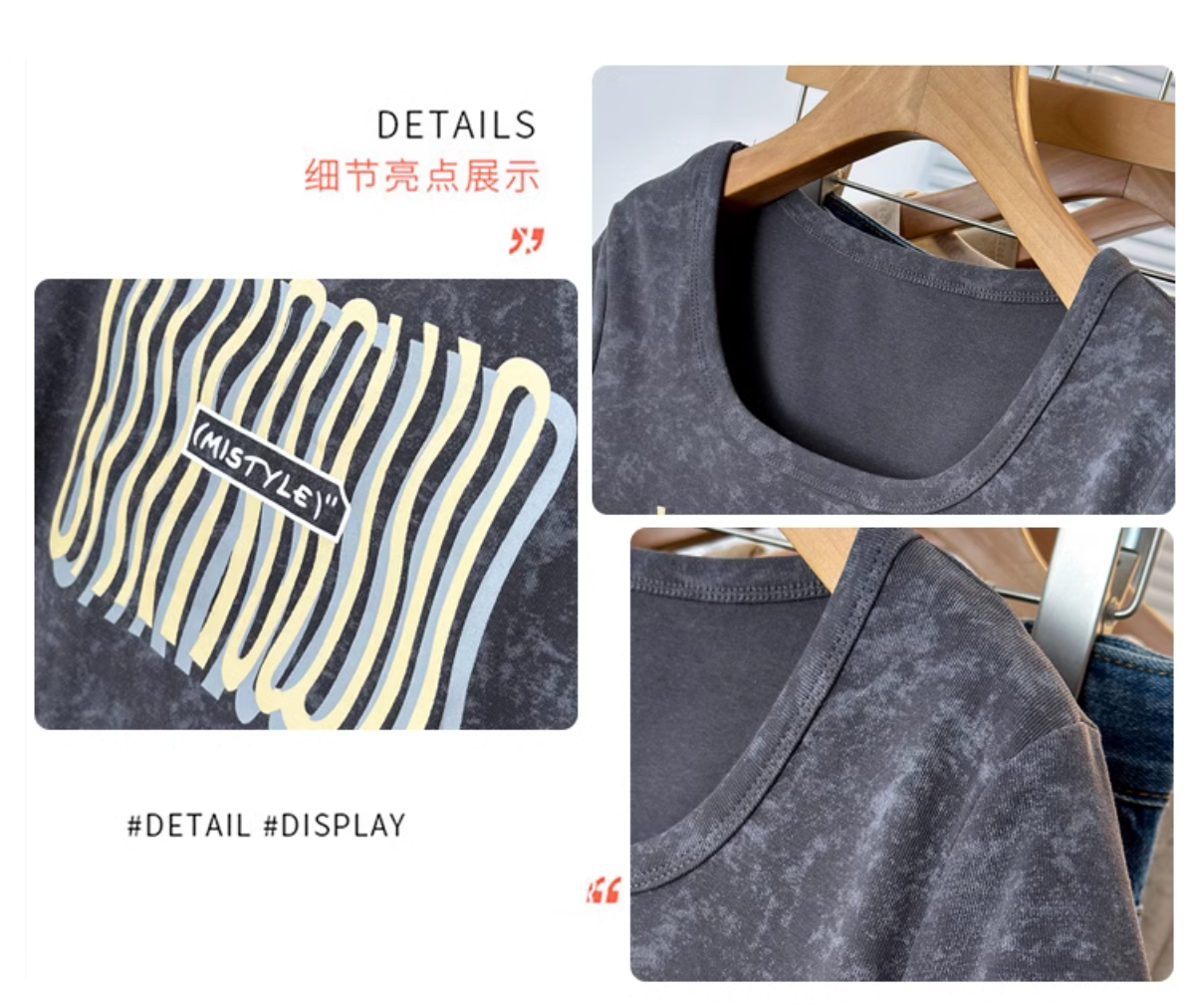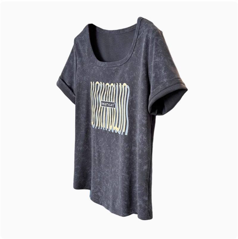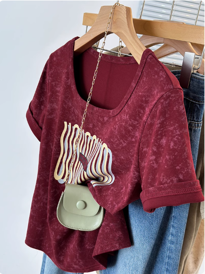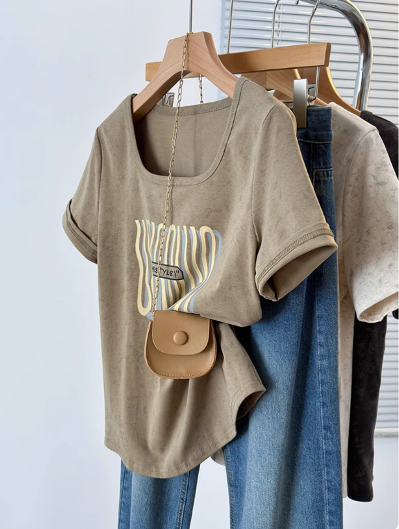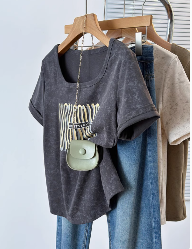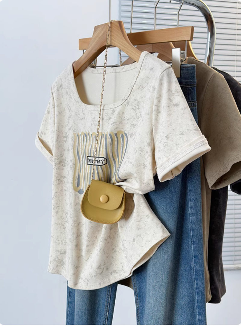 大碼美式復古正肩短袖t恤女夏季胖mm遮肚子甜辣短款扎染方領上衣