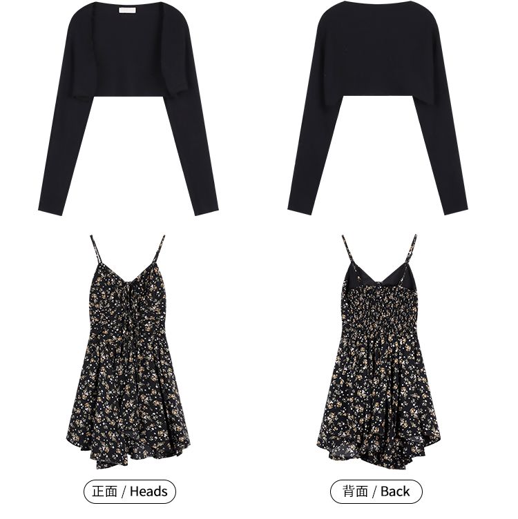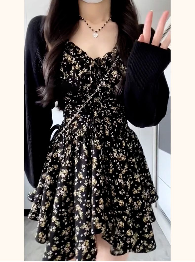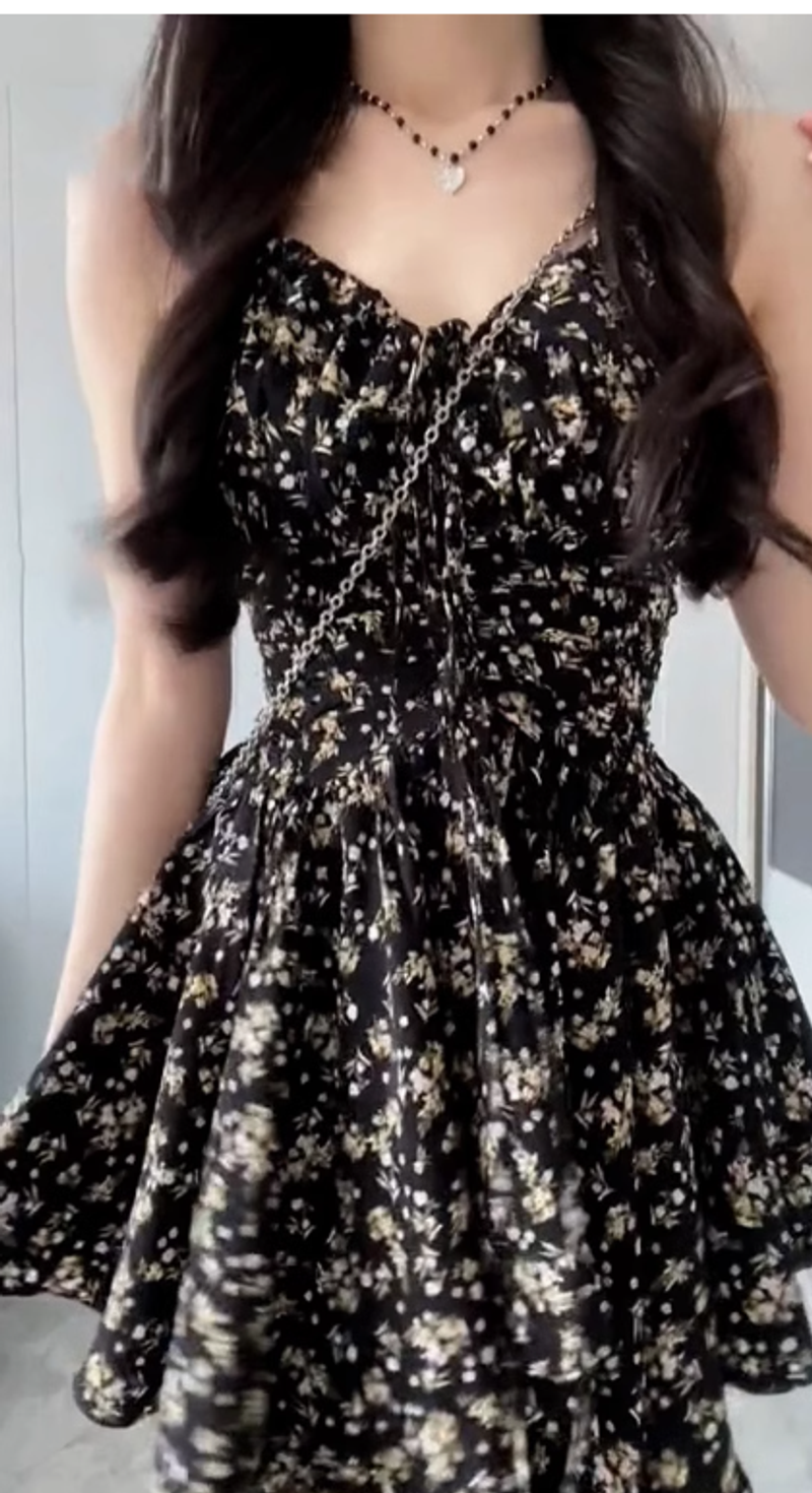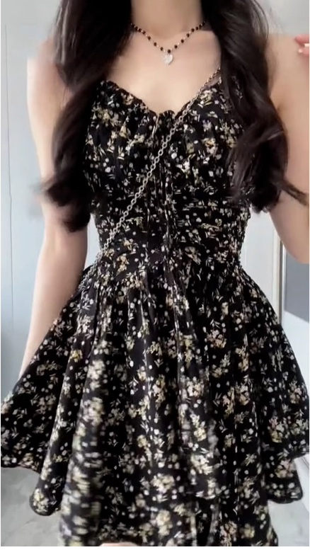 小個子黑色v領碎花吊帶連衣裙子女夏季穿搭2025新款掐腰短裙