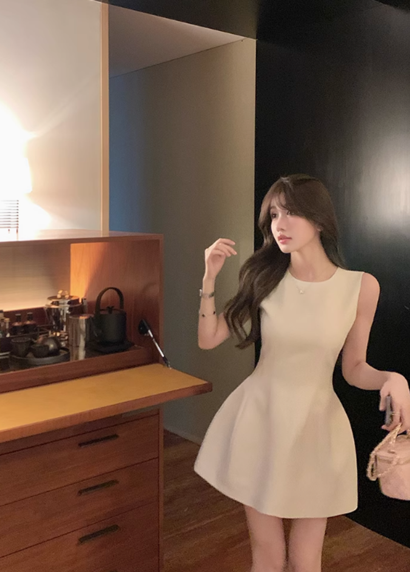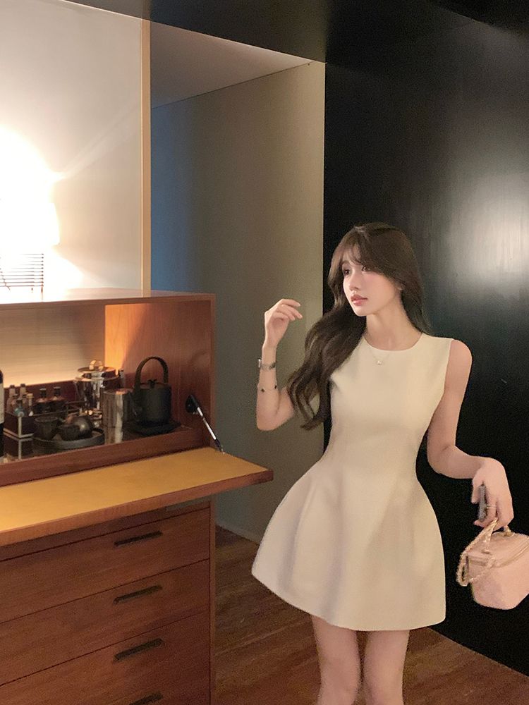 愉悅愉悅圓領白色無袖連衣裙女夏季法式氣質收腰修身短款背心裙子