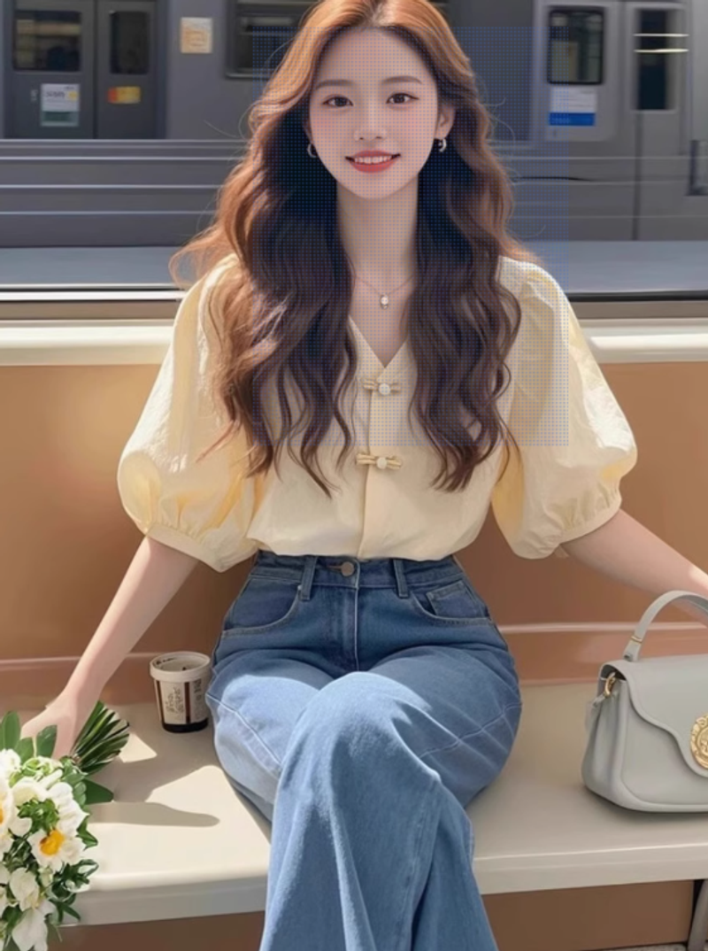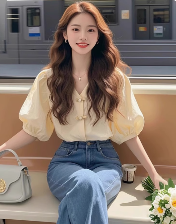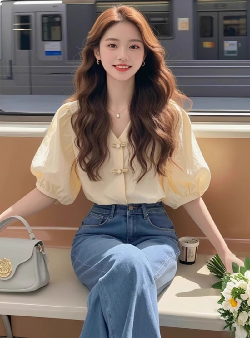 新中式杏色短袖襯衫女夏季輕奢高級感溫柔氣質法式泡泡袖盤扣上衣