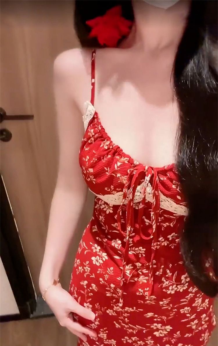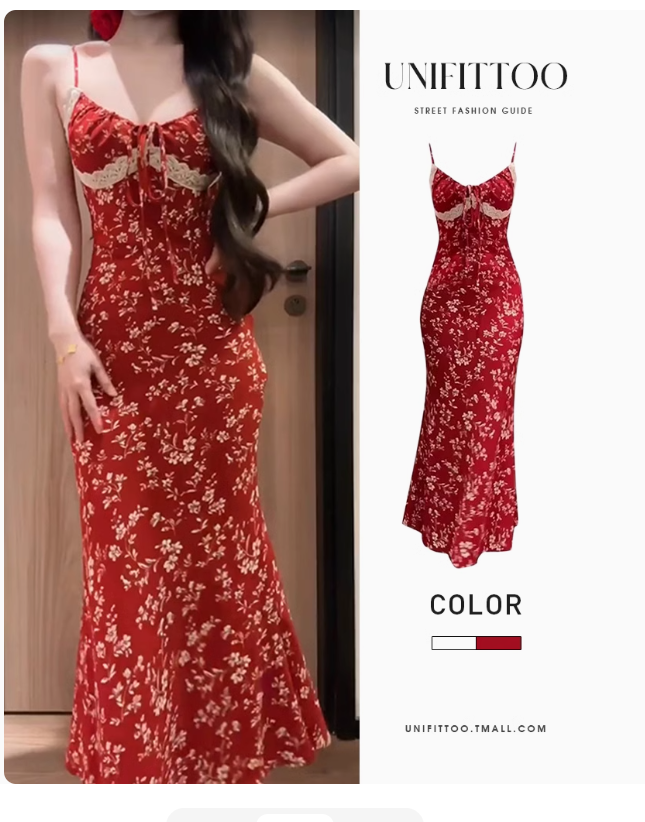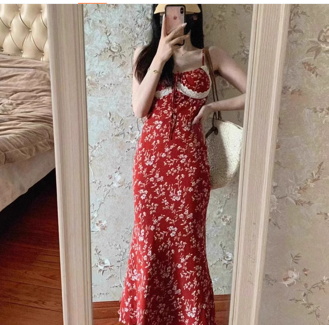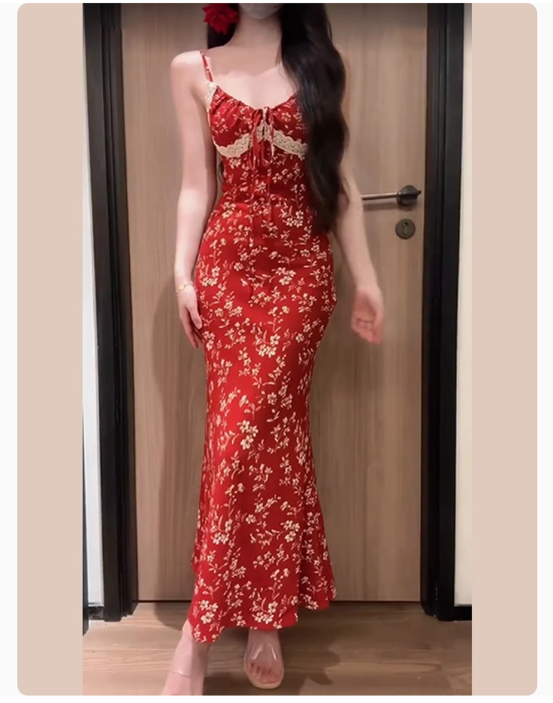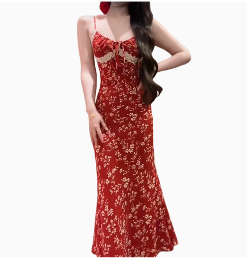新中式紅色碎花吊帶長裙子2025新款夏季絕美海邊度假風連衣裙女裝