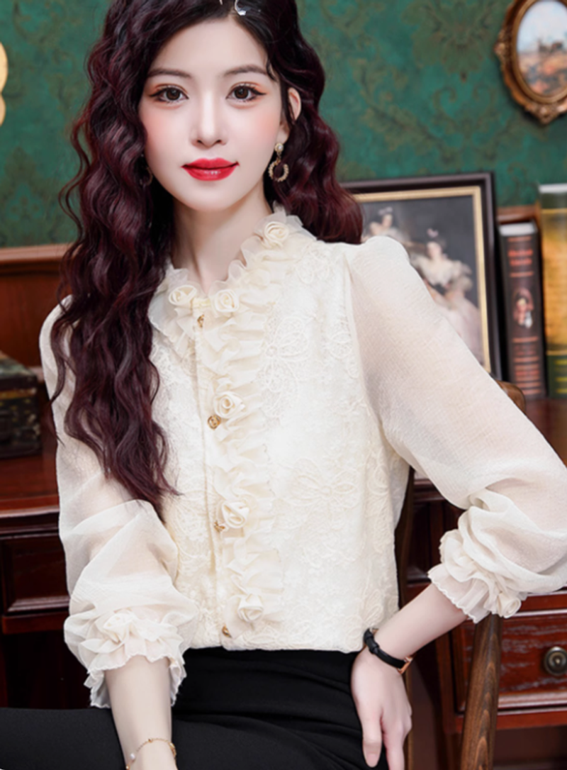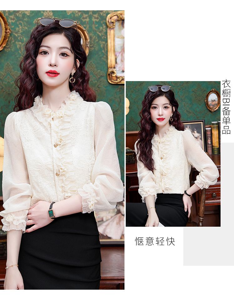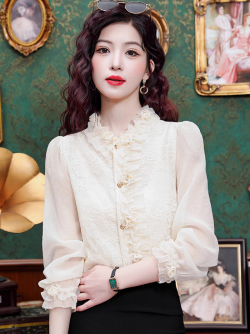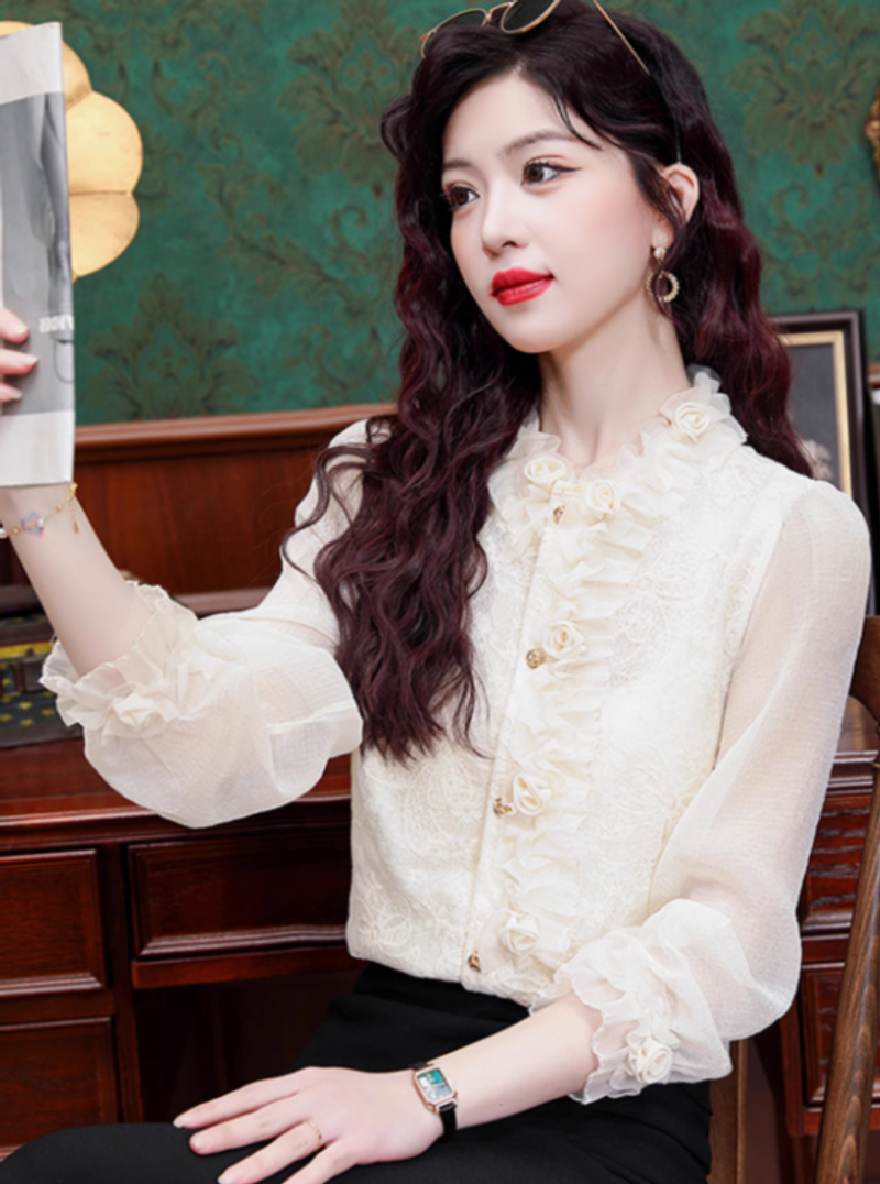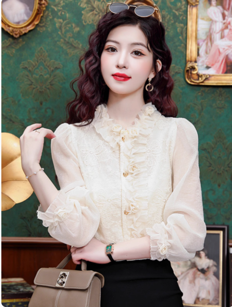 杭州高端大牌真絲襯衫女士長袖小衫洋氣木耳邊刺繡時尚桑蠶絲上衣