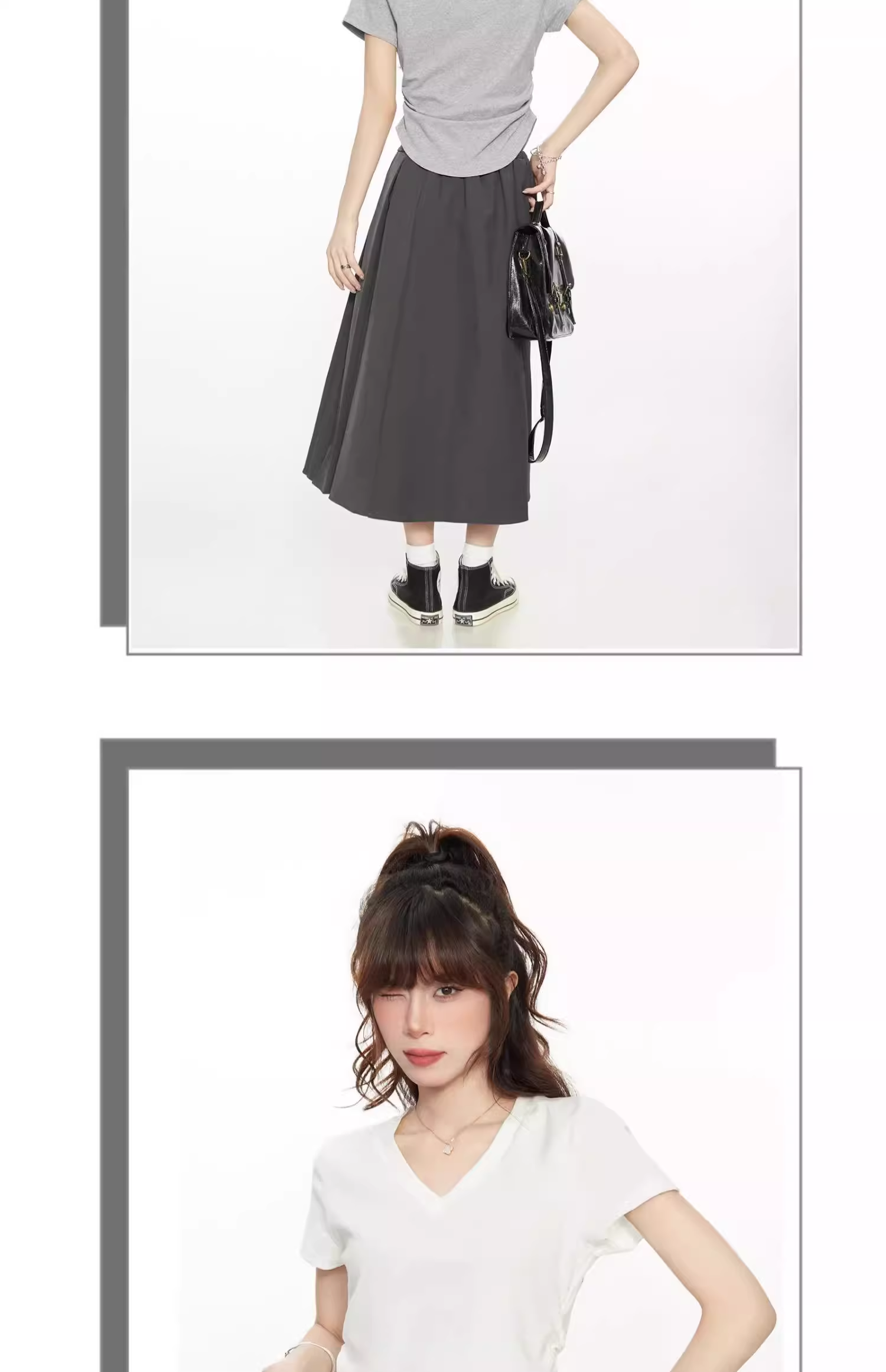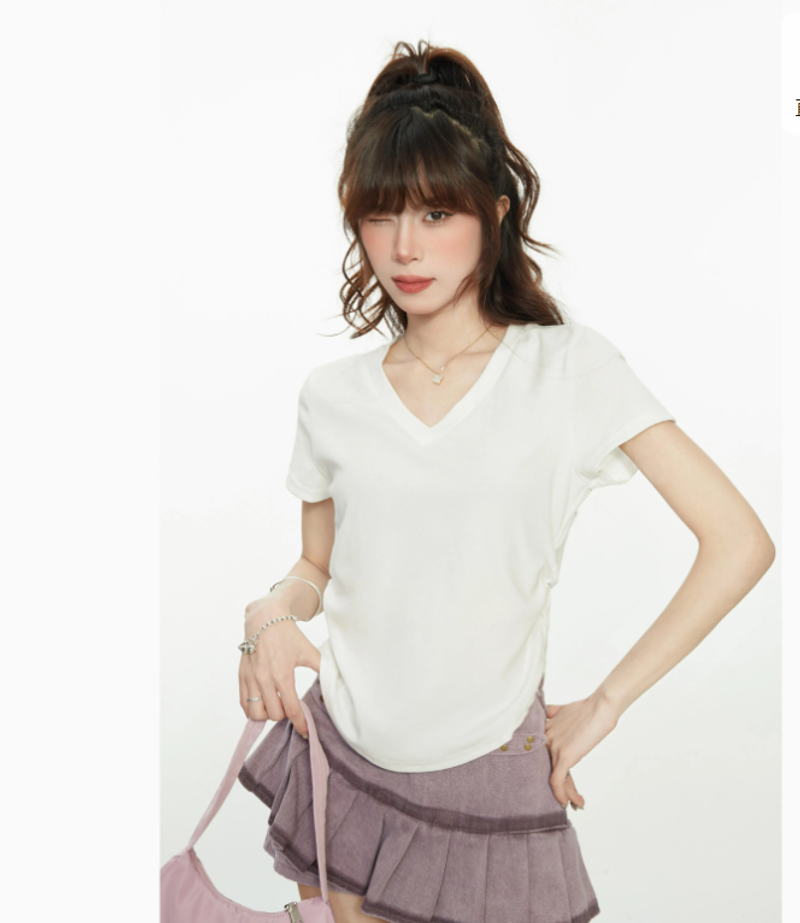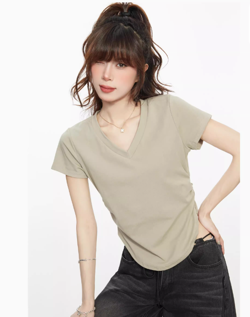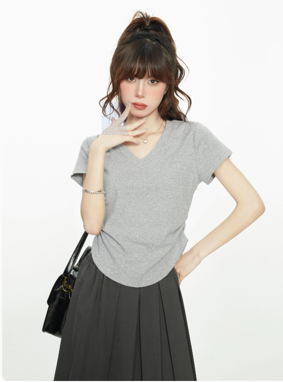 法式掐腰淺灰色v領正肩短袖t恤女款夏季美式爵士收腰修身短款上衣