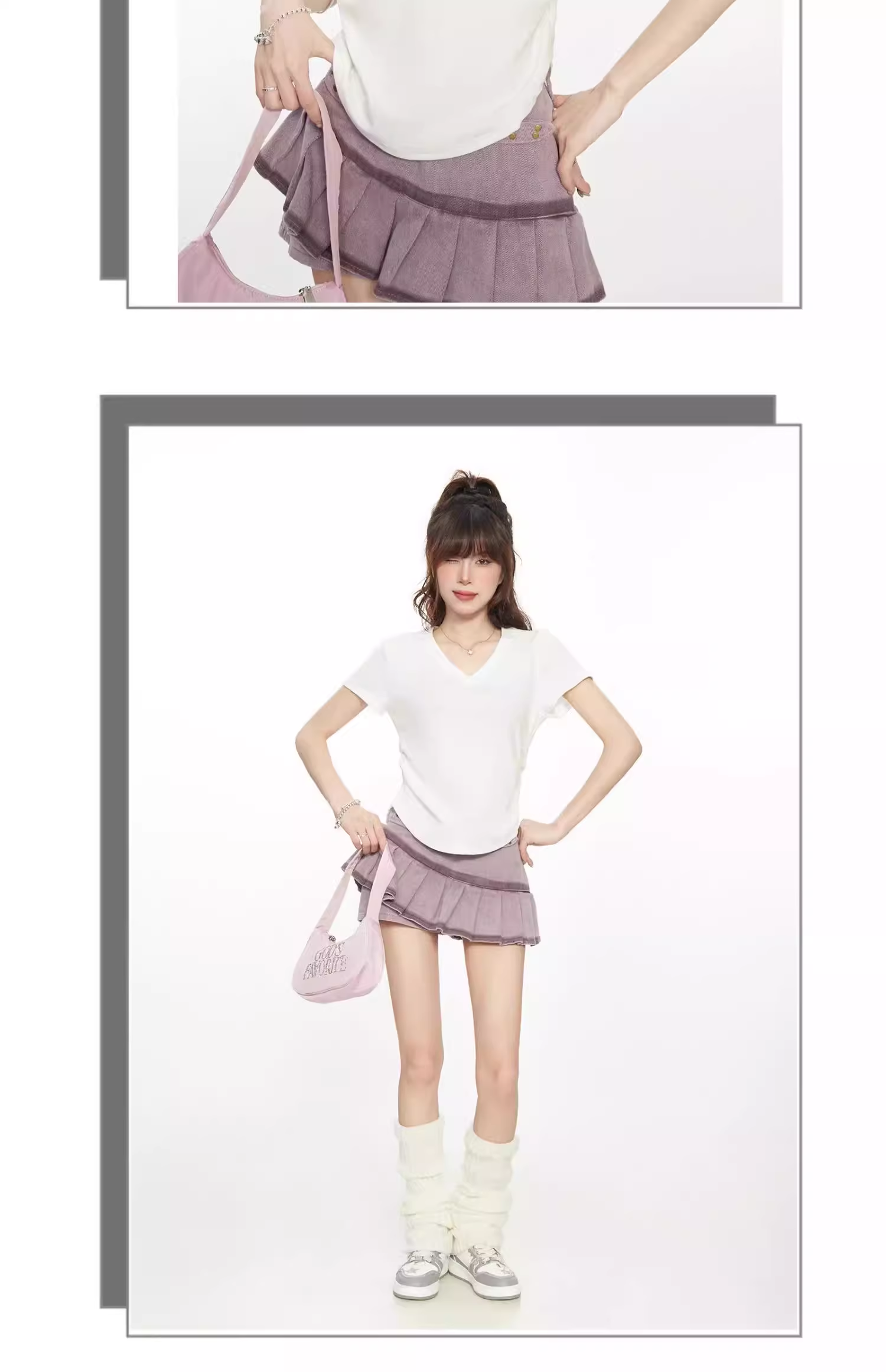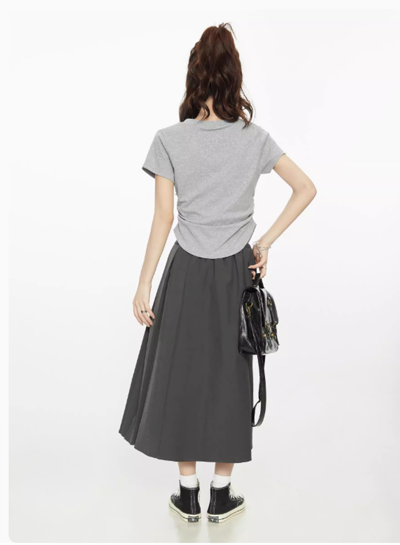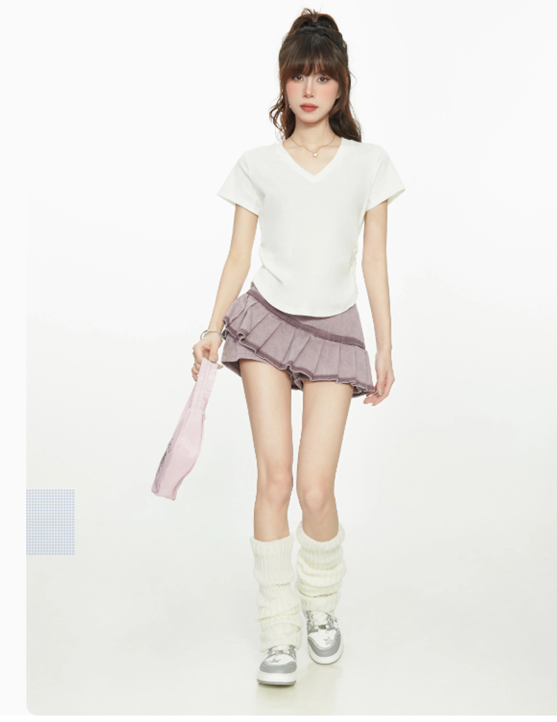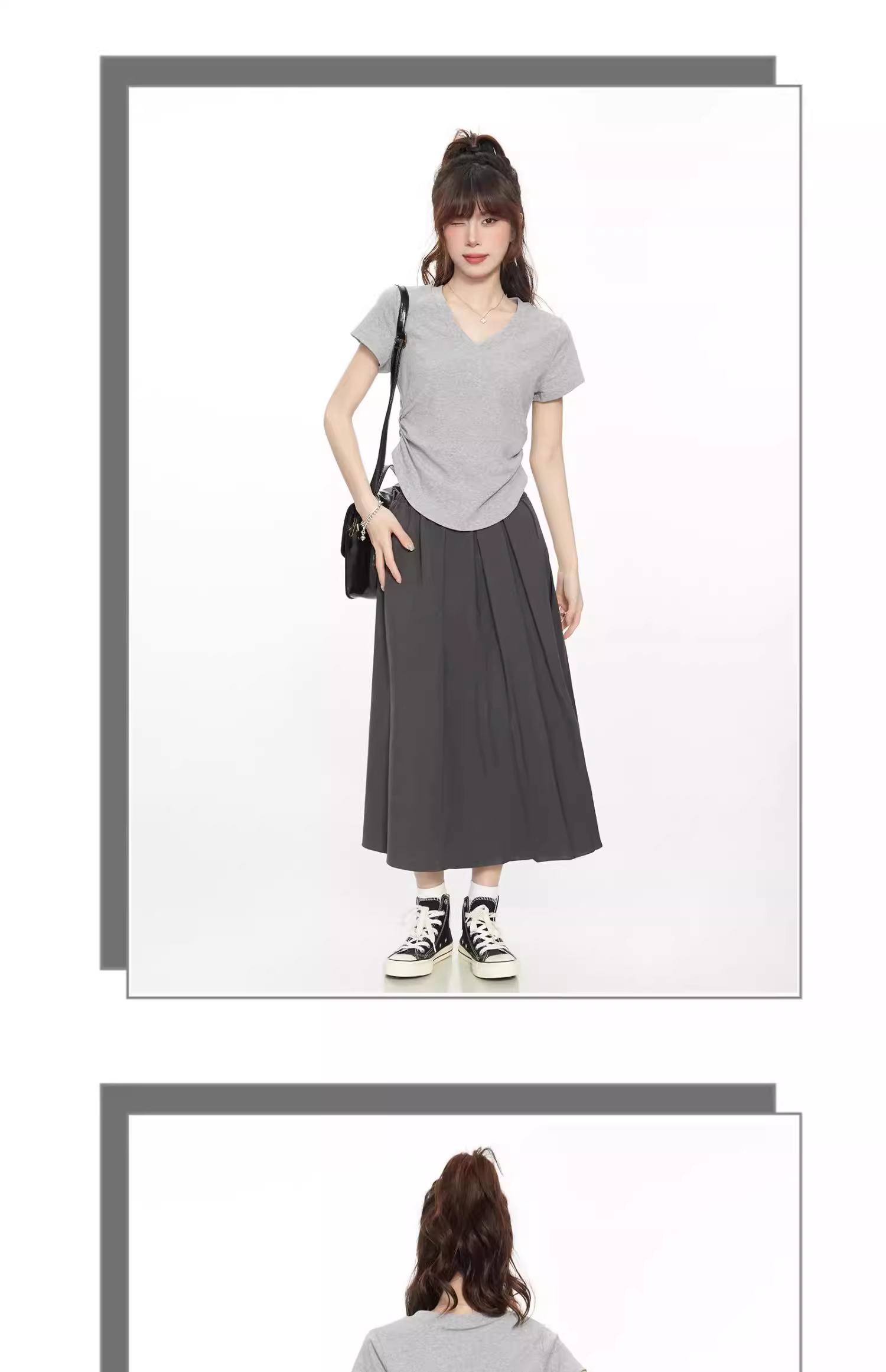 法式掐腰淺灰色v領正肩短袖t恤女款夏季美式爵士收腰修身短款上衣