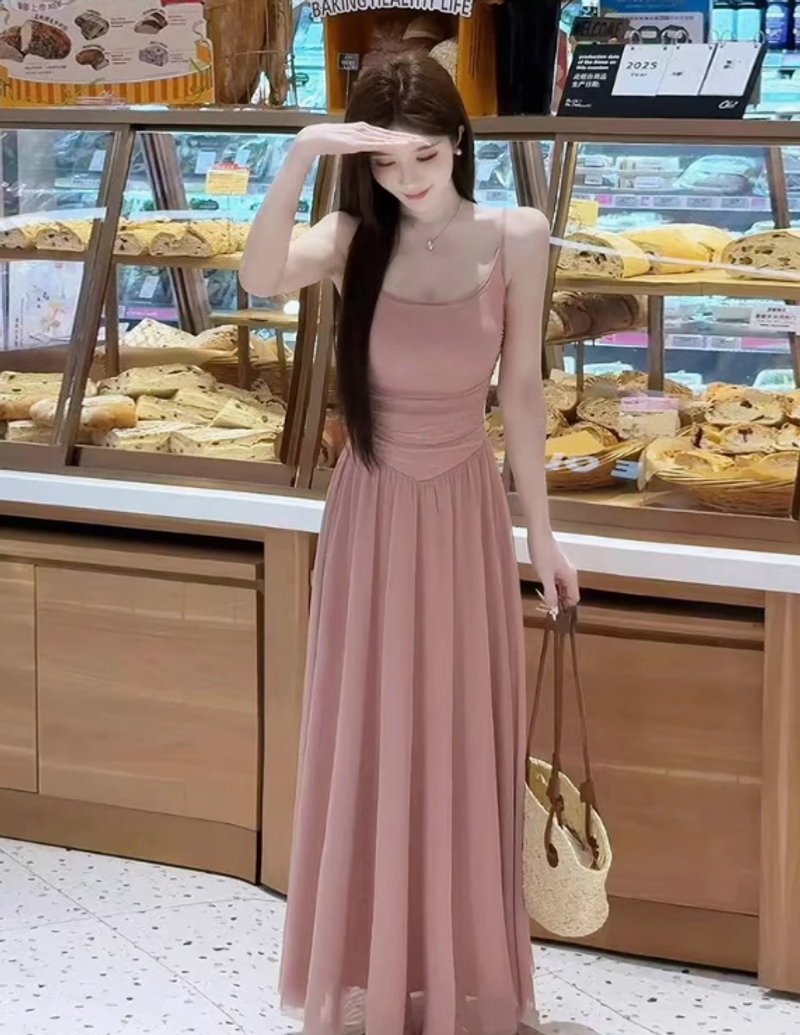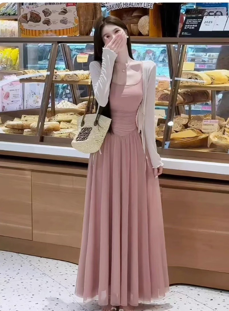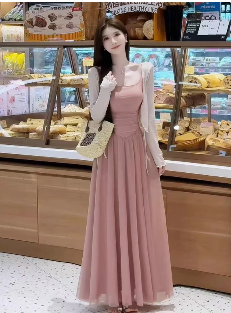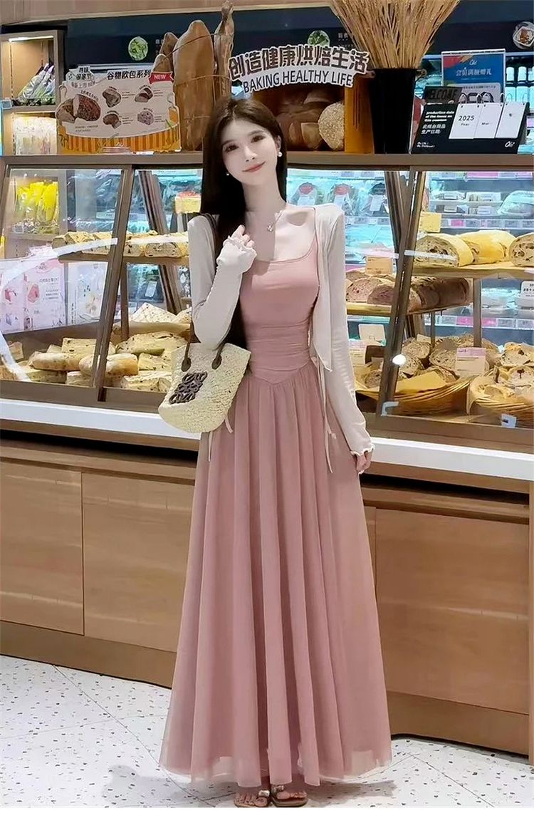 法式粉色吊帶連衣裙子女夏季2025初春裝新款收腰長裙開春穿搭套裝