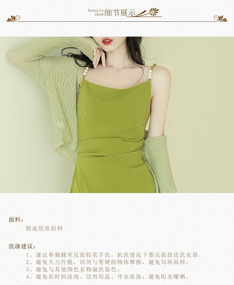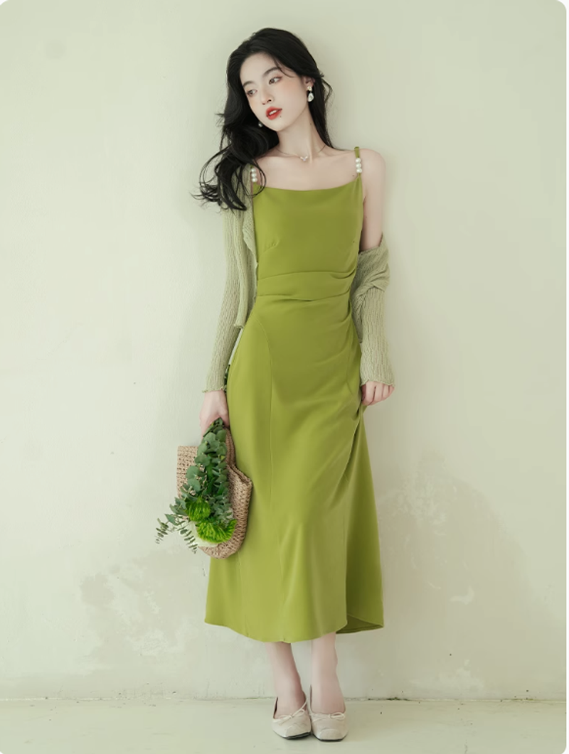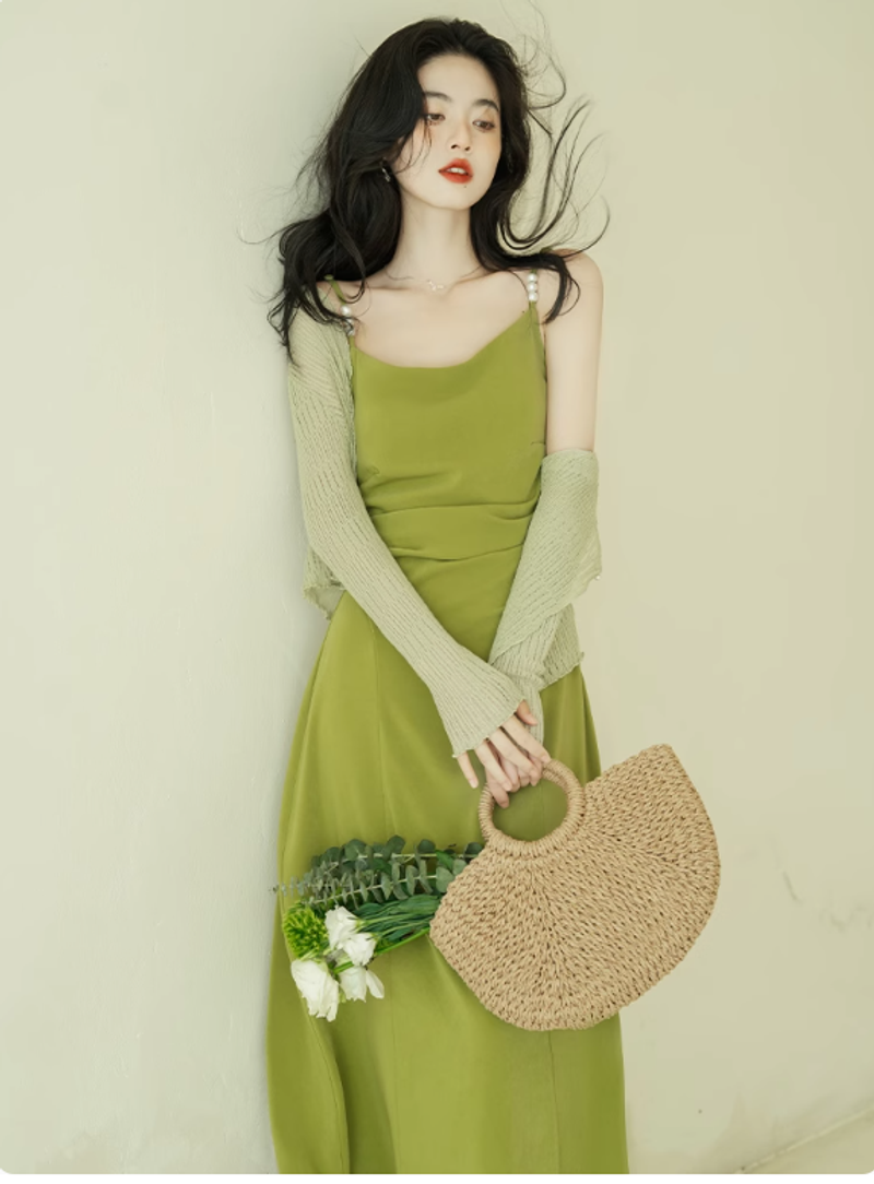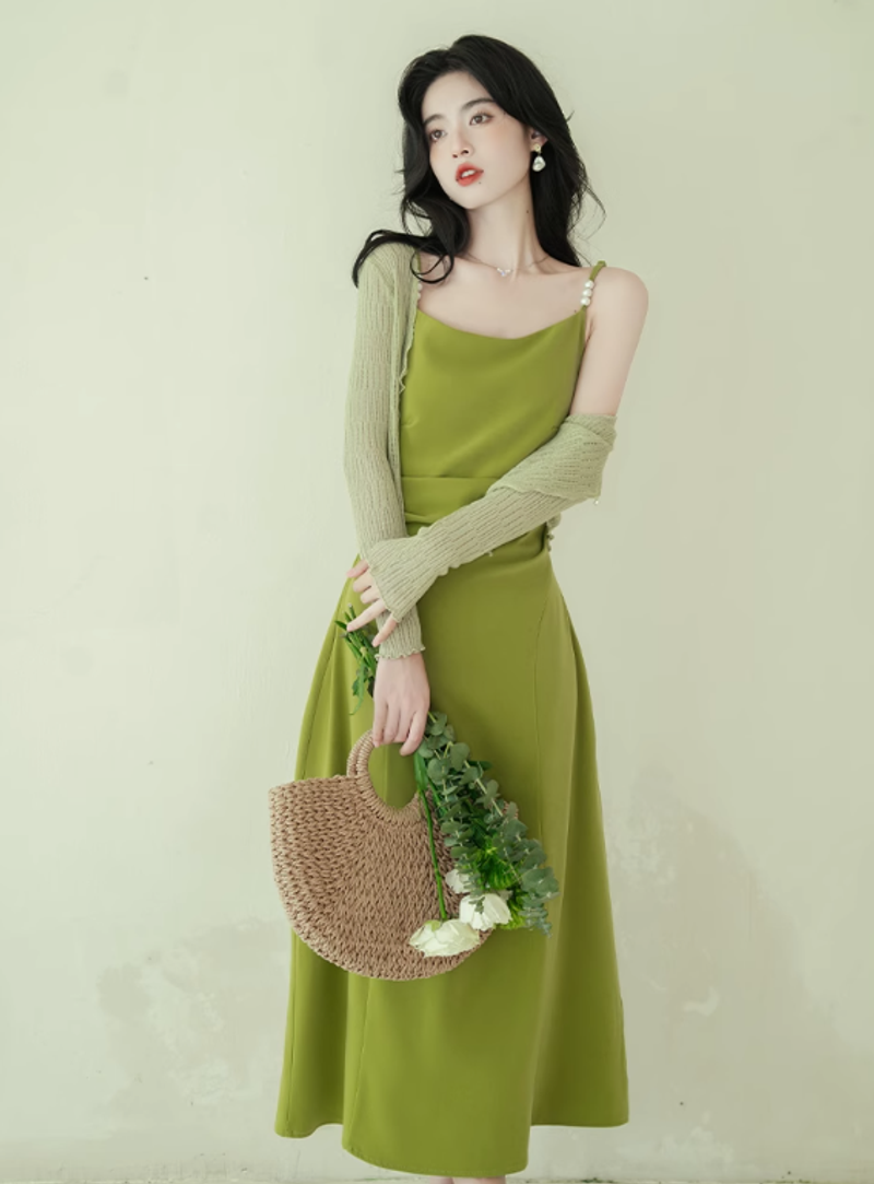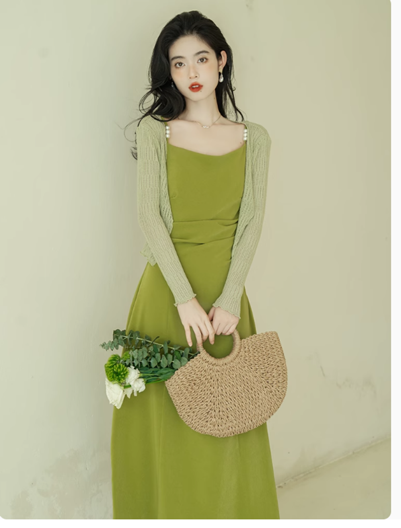 法式綠色連衣裙夏季2025新款高級感氣質絕美超仙吊帶開衫兩件套裝