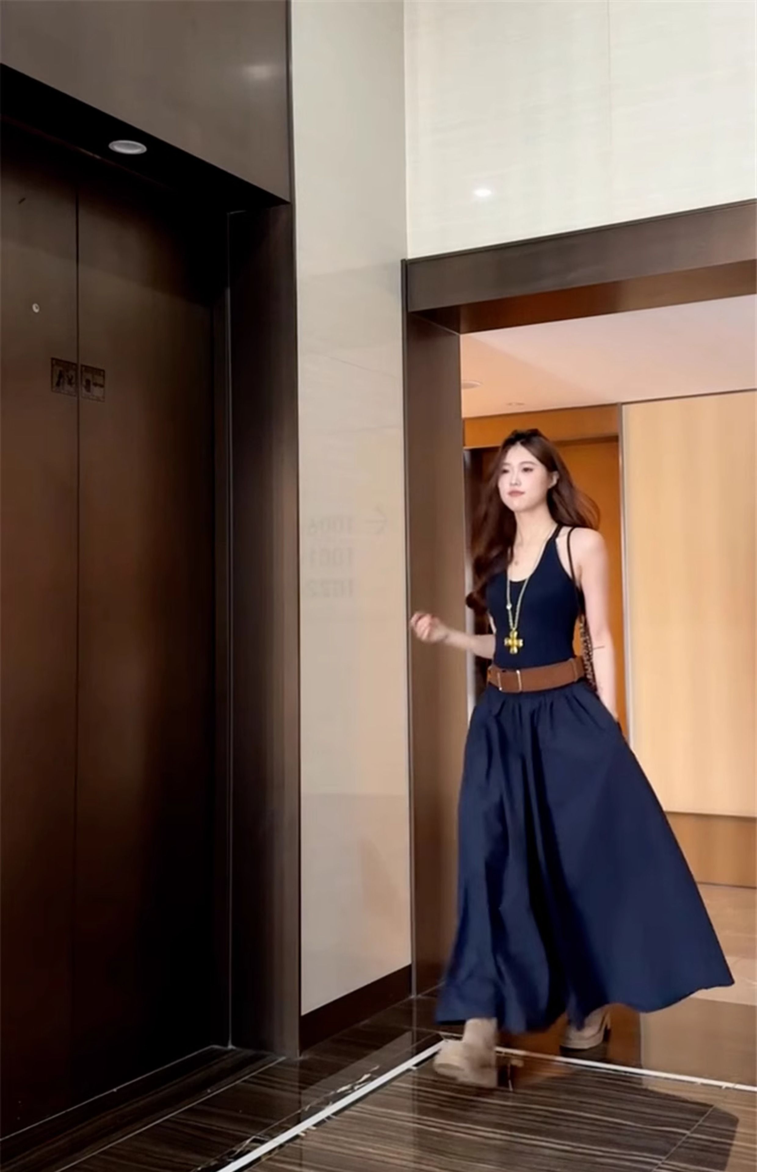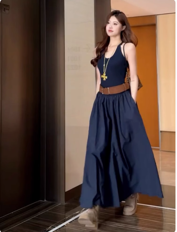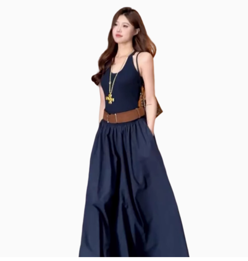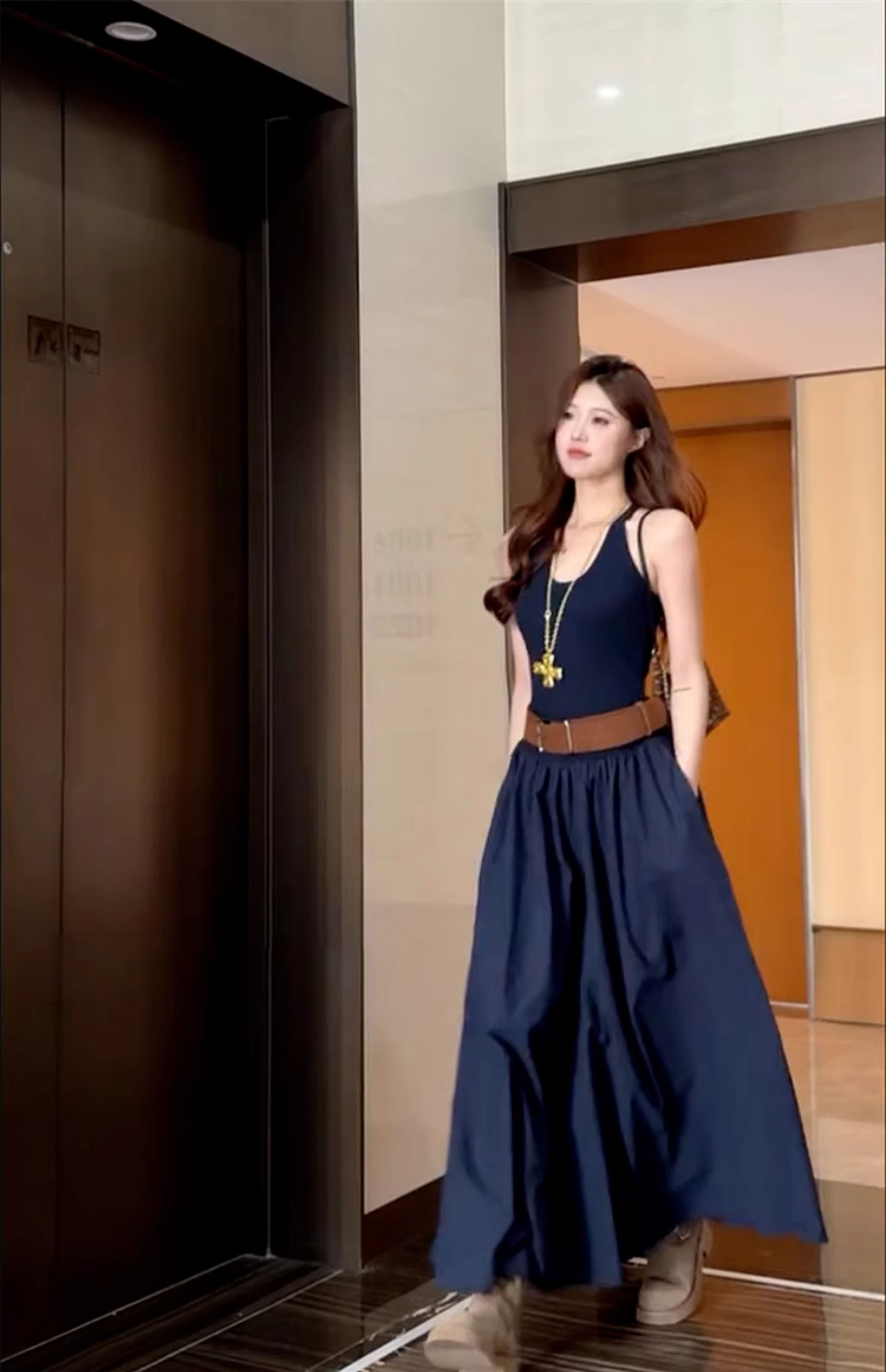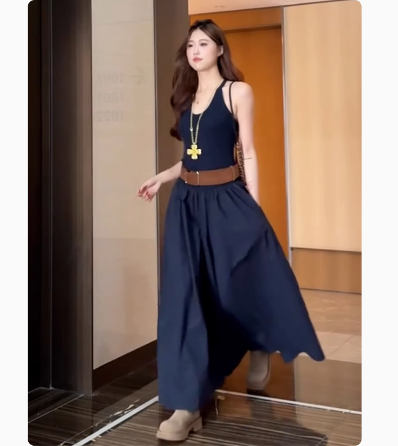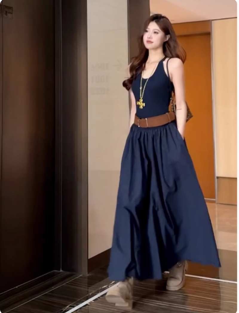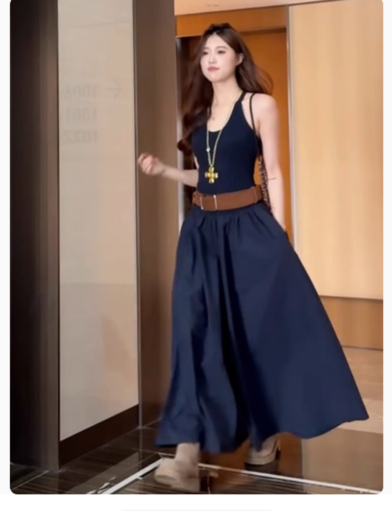 法式藍色掛脖吊帶連衣裙子女夏季2025年新款絕美海邊度假御姐長裙