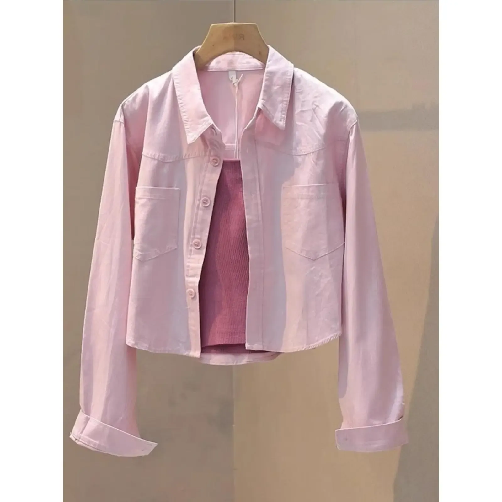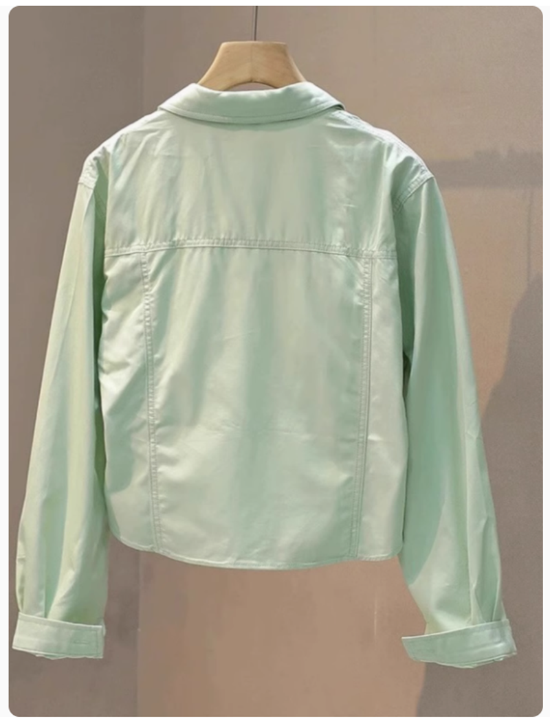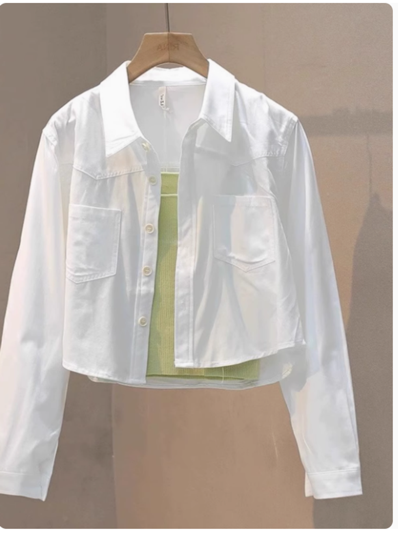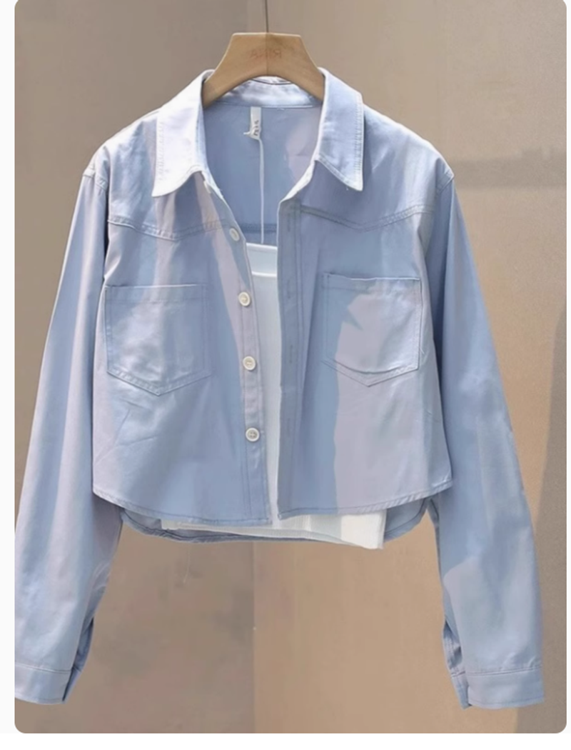 淺水藍色襯衫工裝外套女春秋長袖小個子防曬襯衣短款寬鬆chic上衣