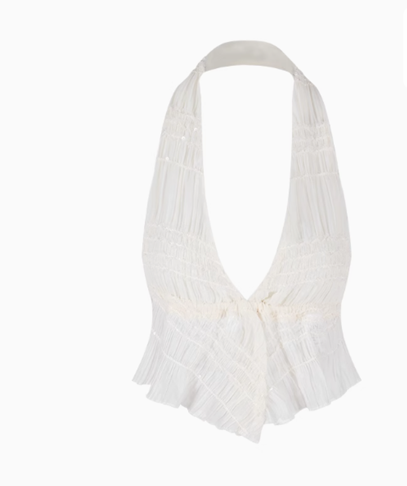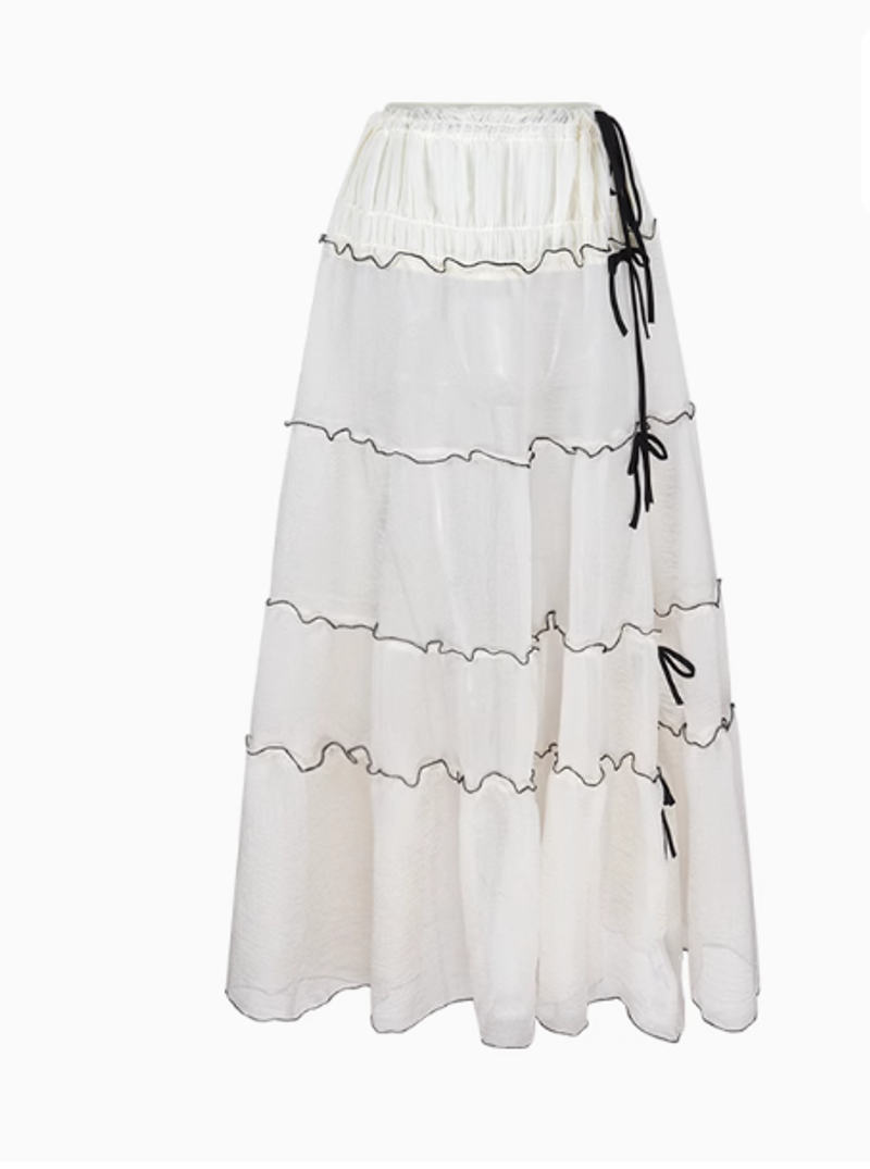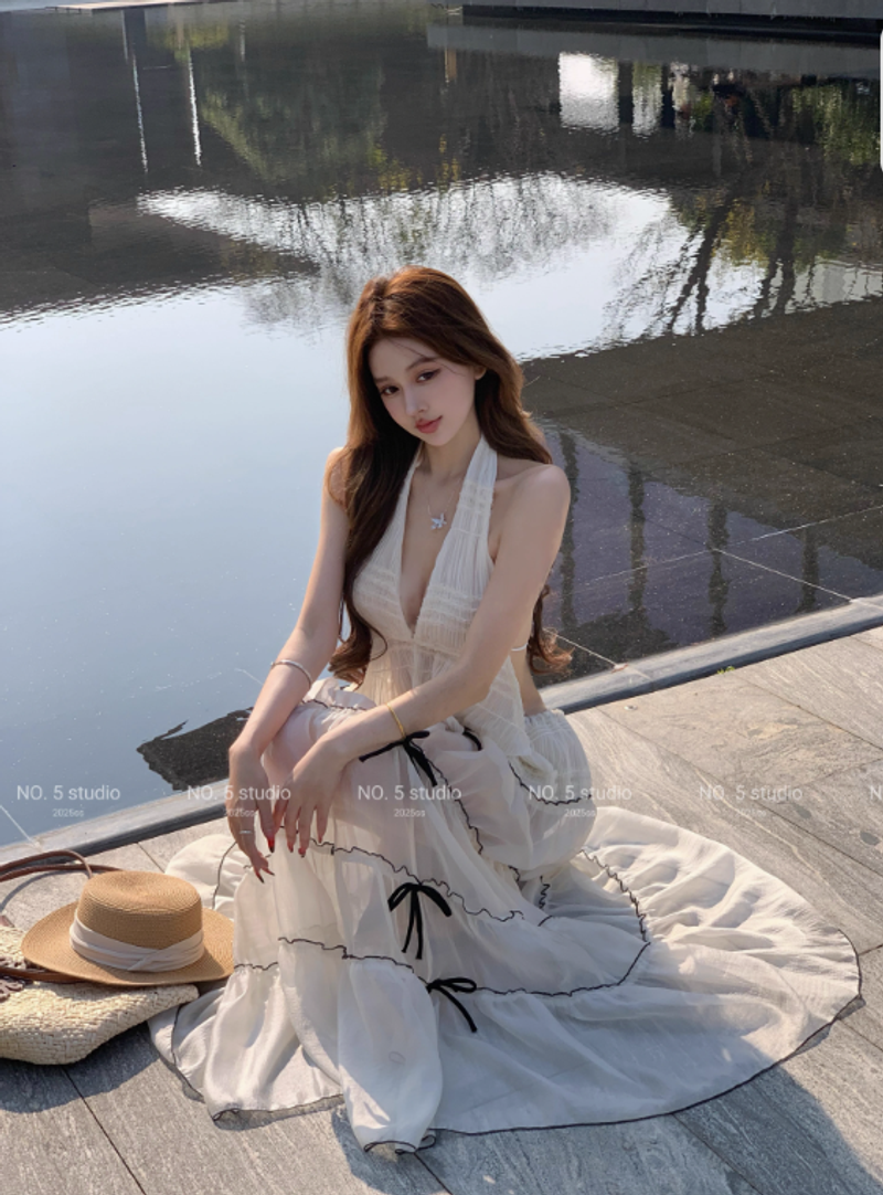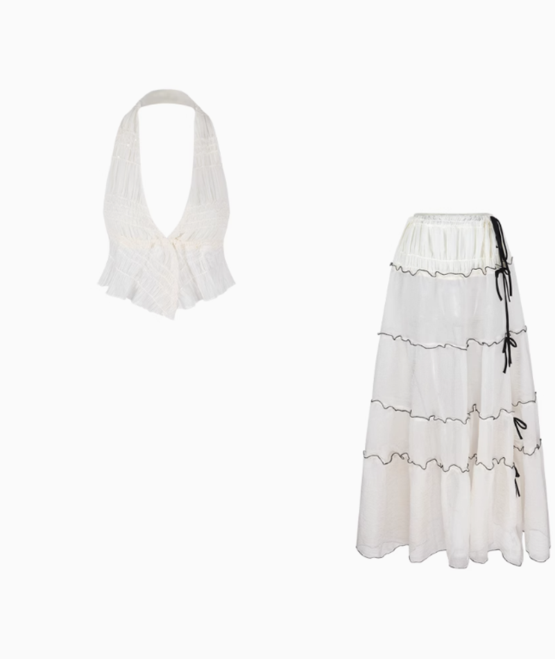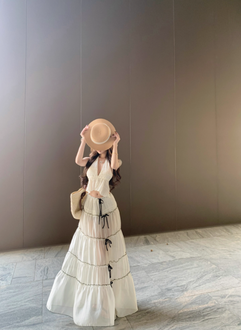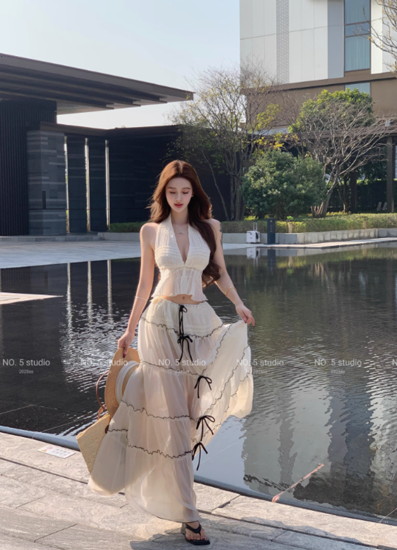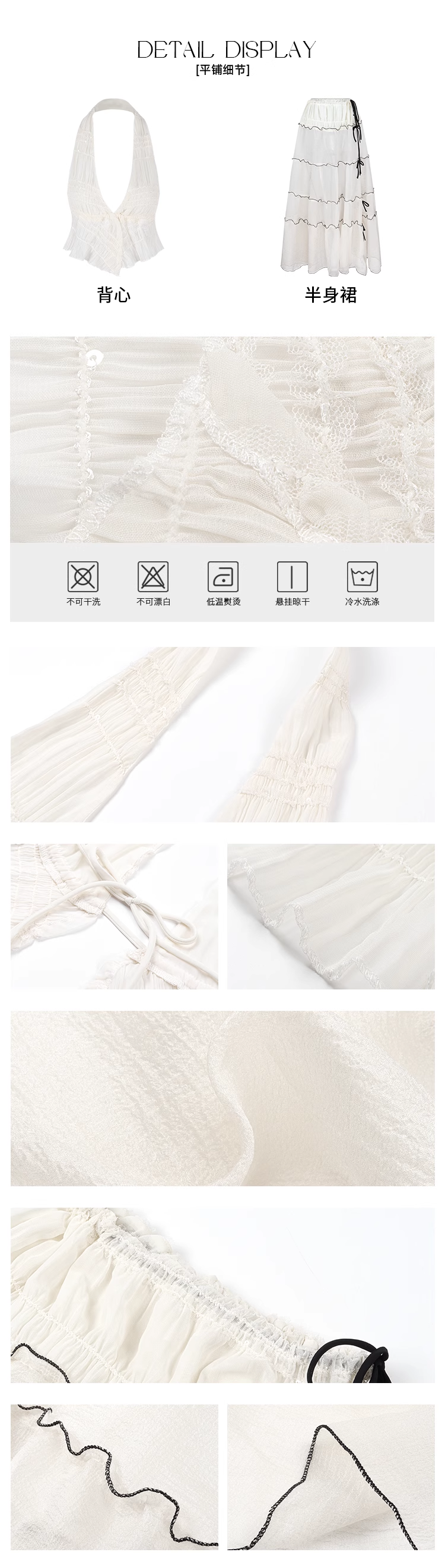 海邊度假風穿搭套裝純欲v領掛脖背心女夏季網紗高腰半身裙兩件套