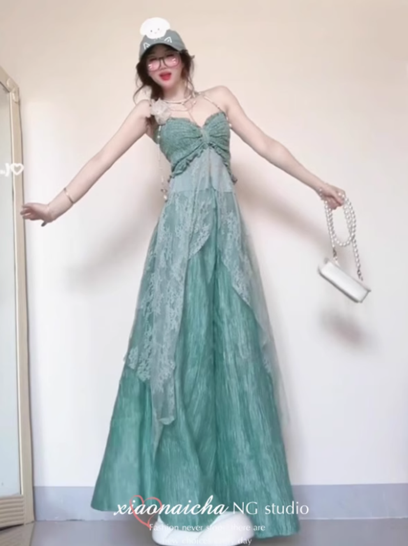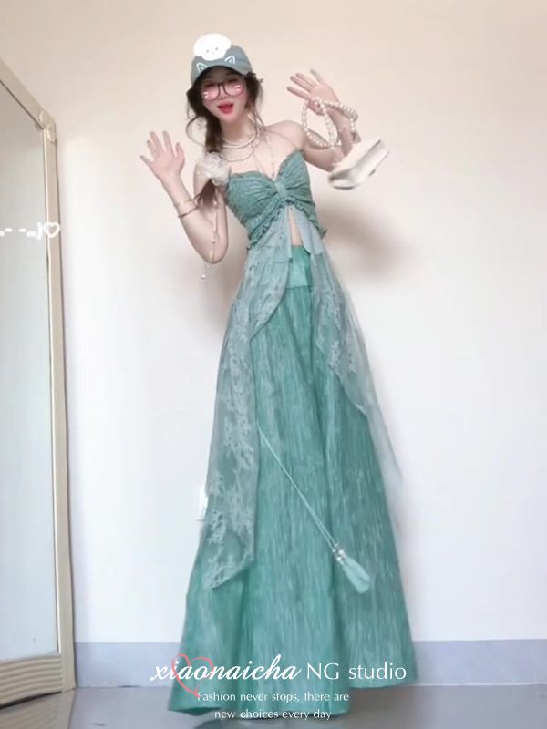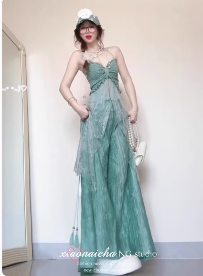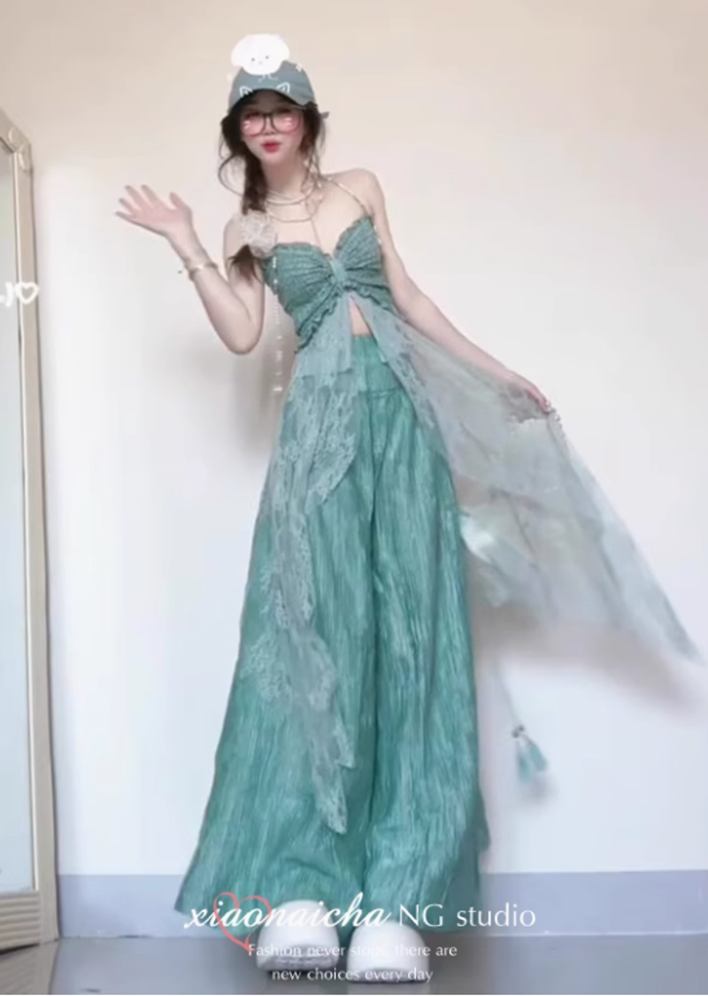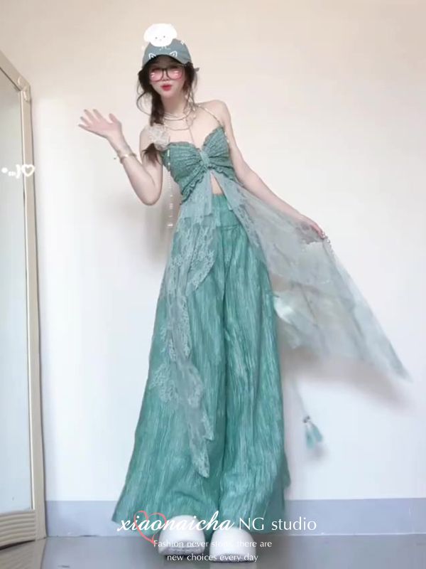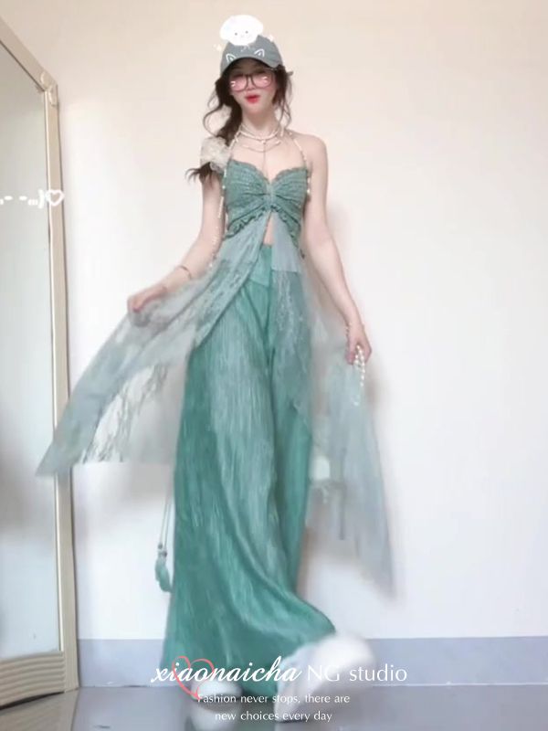 海邊度假風薄荷綠吊帶上衣女夏季2025新款設計感高腰闊腿褲兩件套