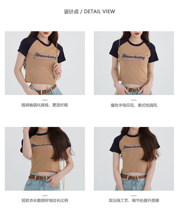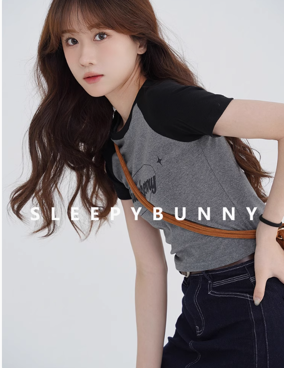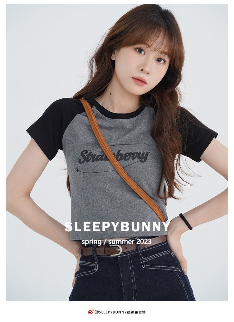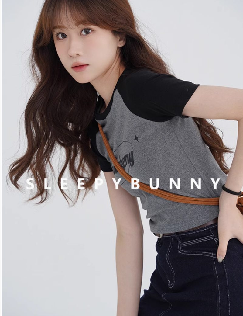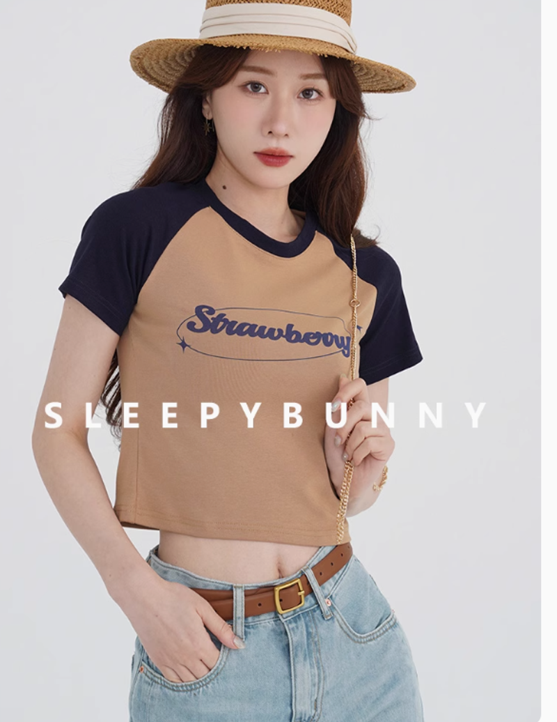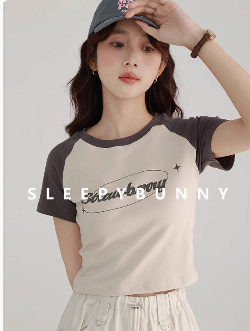瞌睡兔 短袖露臍上衣夏季美式復古小個子辣妹正肩印花修身短款T恤