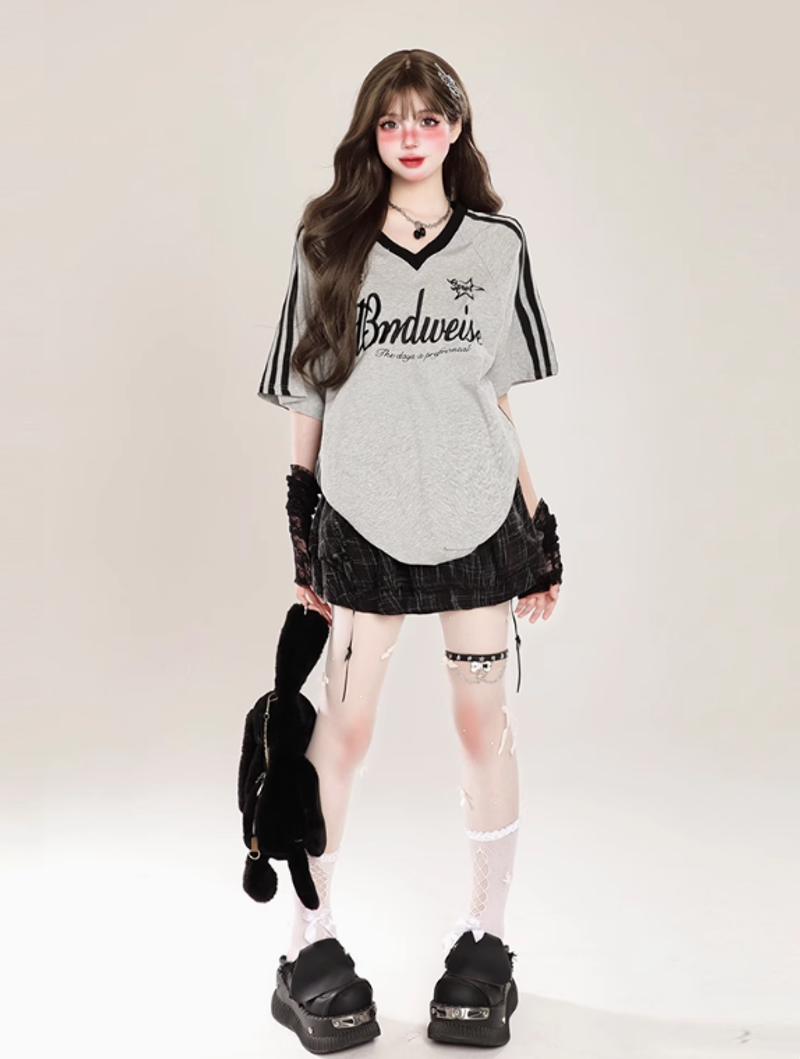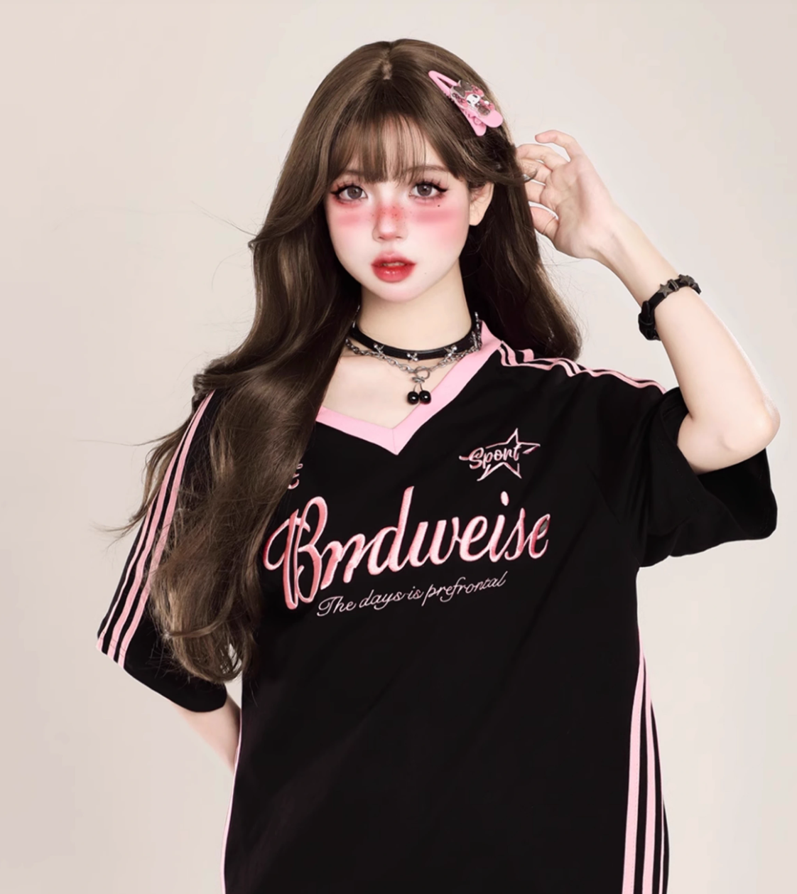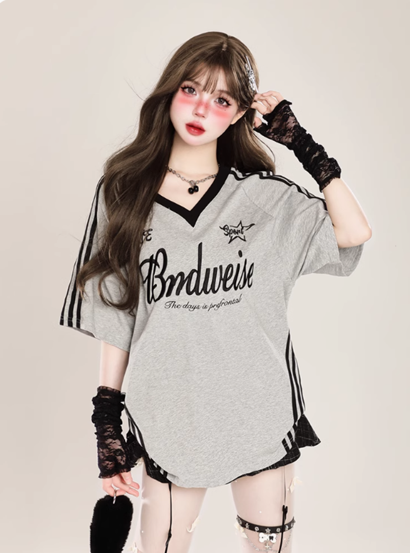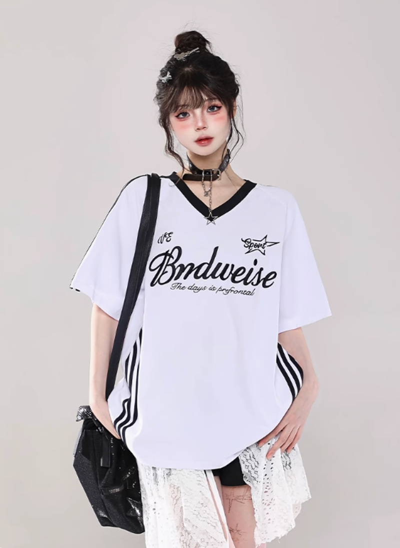 美式復古潮流撞色拼接v領寬松短袖t恤女夏季oversize休閒半袖上衣