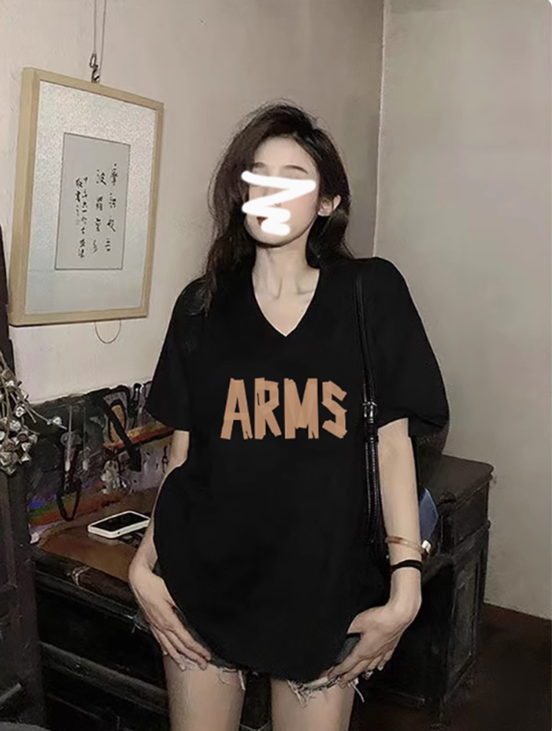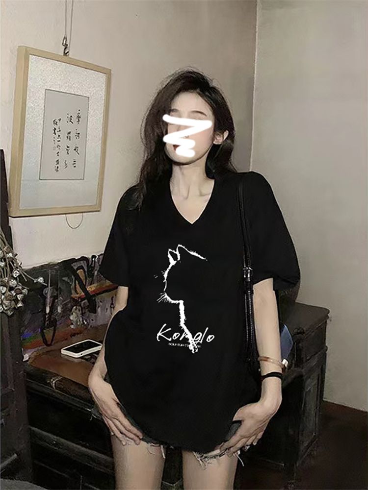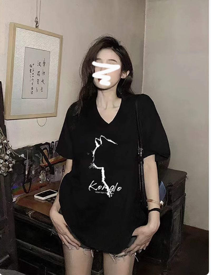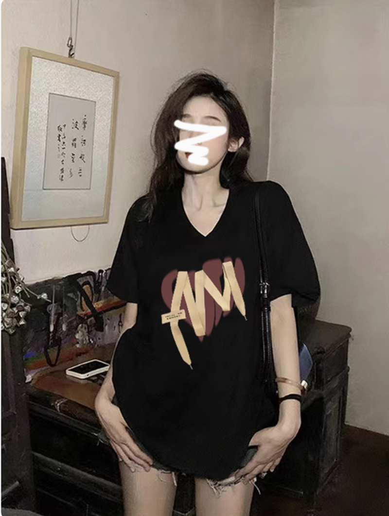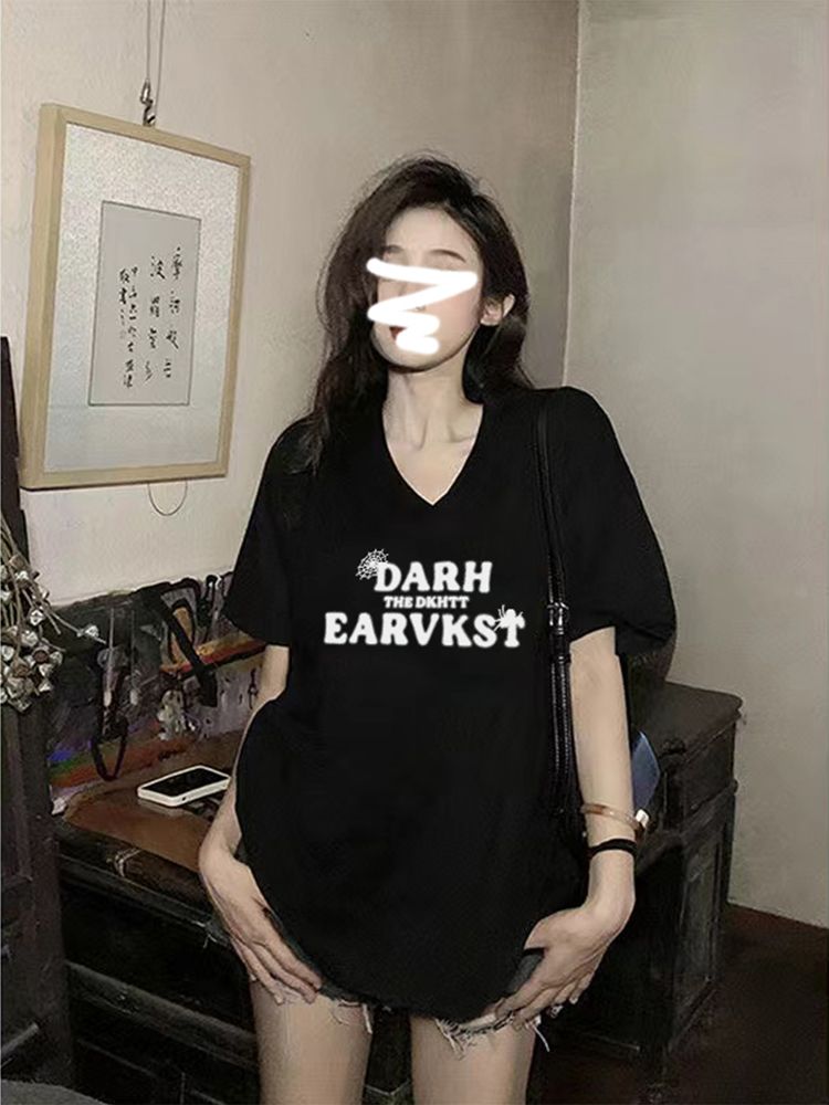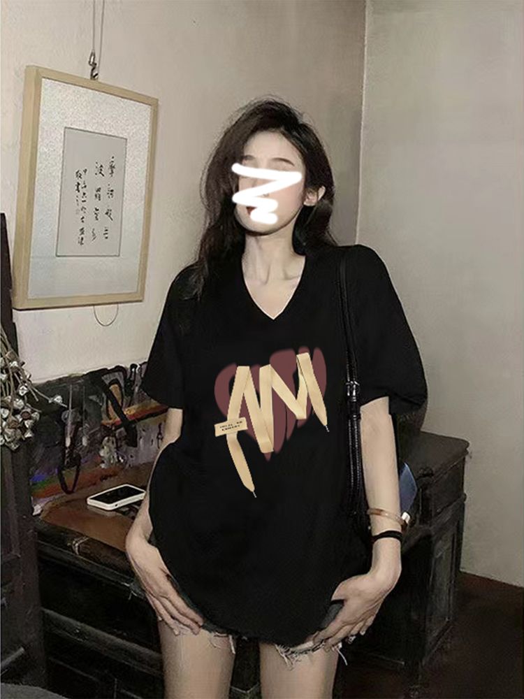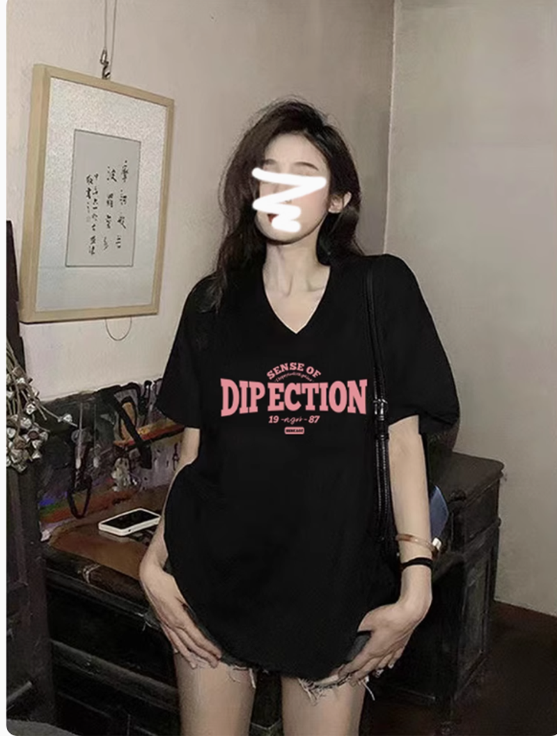 美式復古v領正肩寬鬆短袖t恤女純棉夏季大碼女裝胖mm遮肚顯瘦上衣