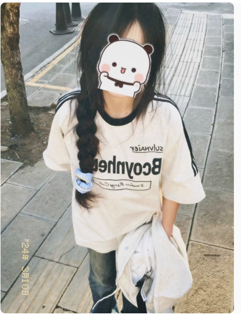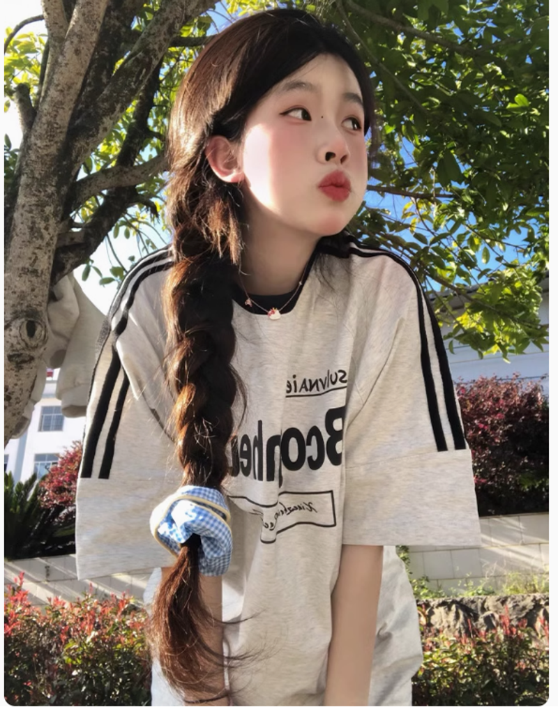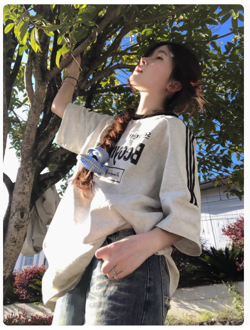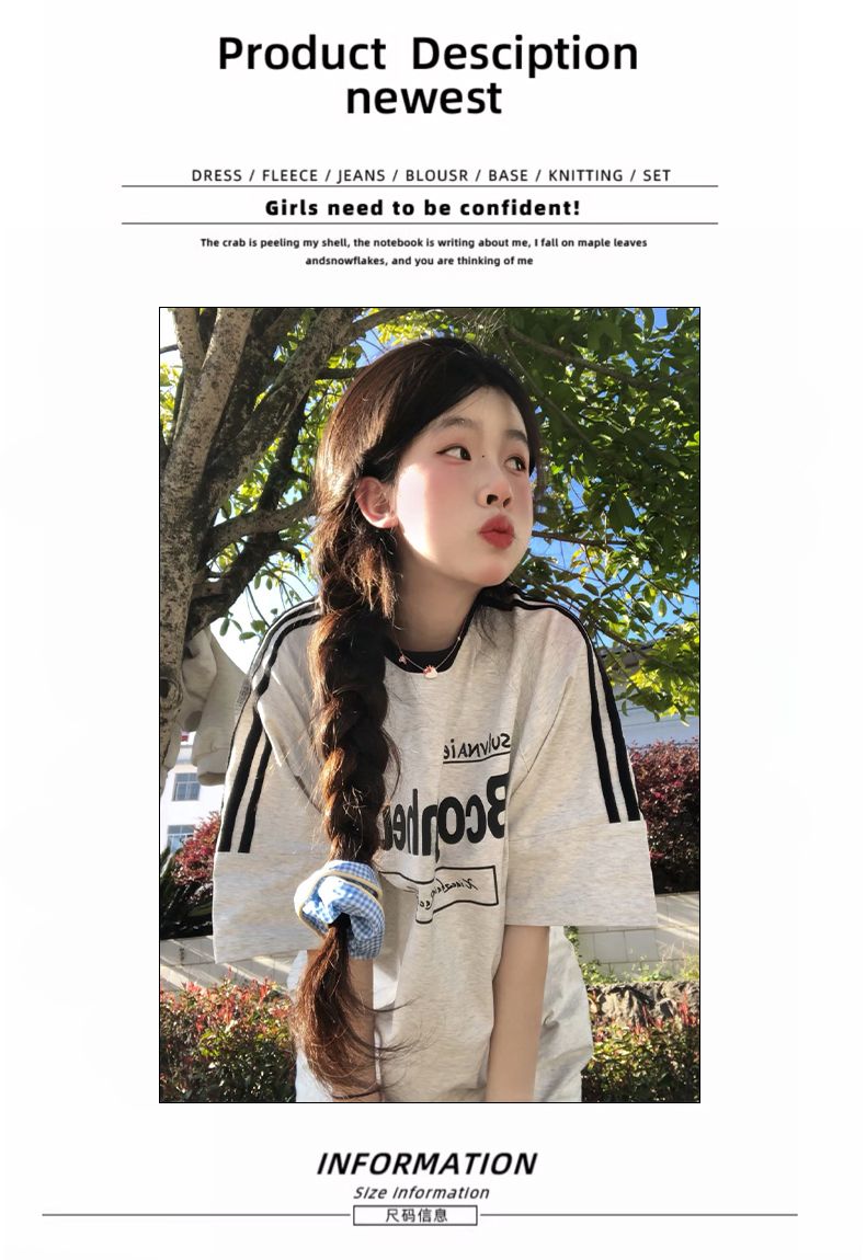美式撞色短袖t恤女夏季國潮復古oversize學院風條紋插肩半袖上衣