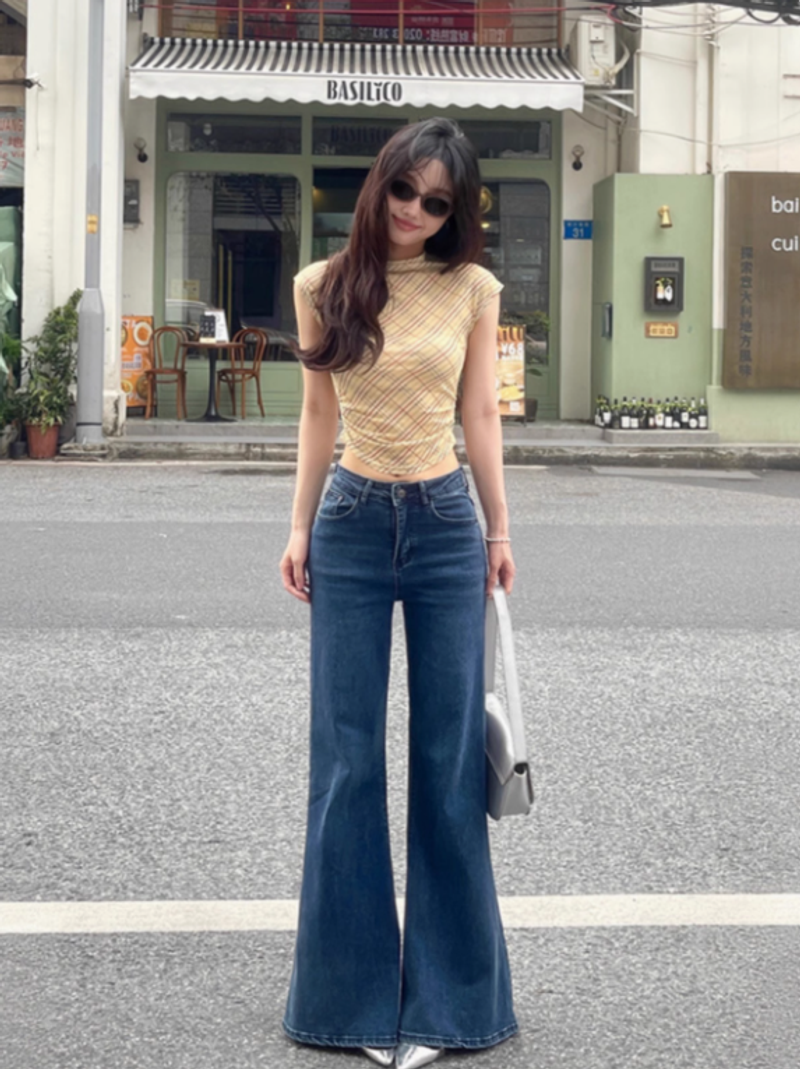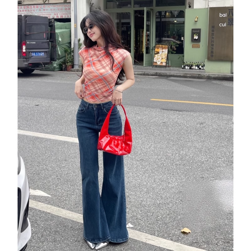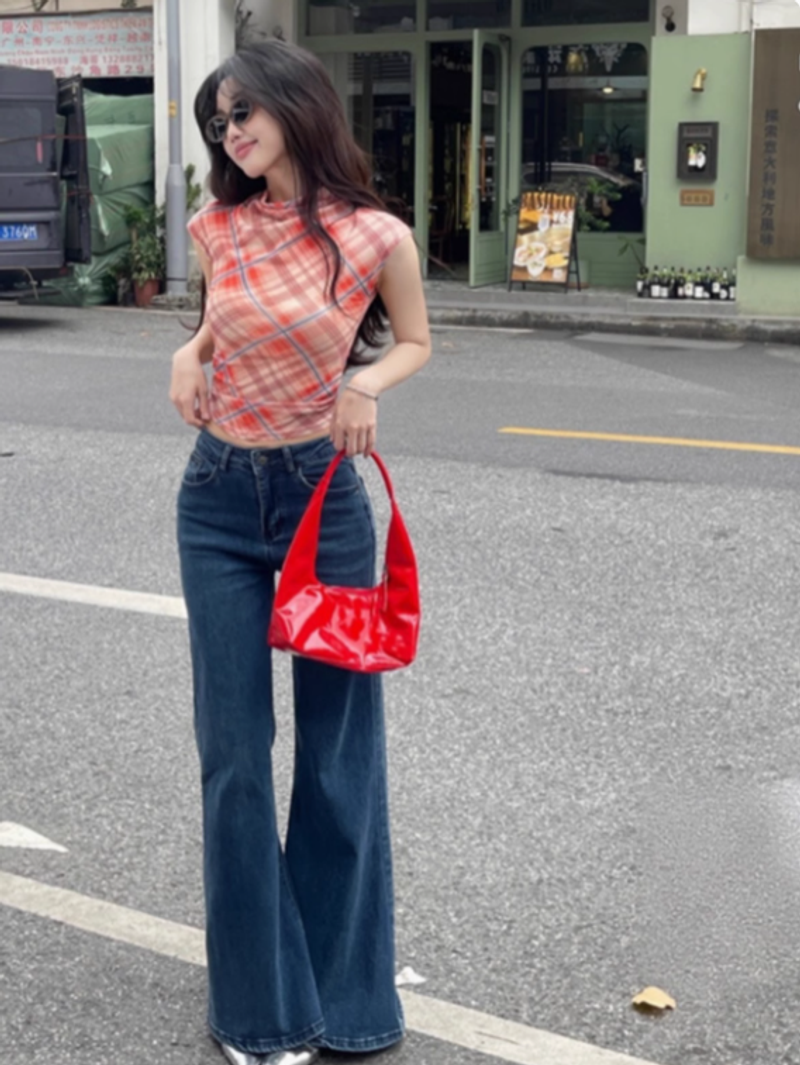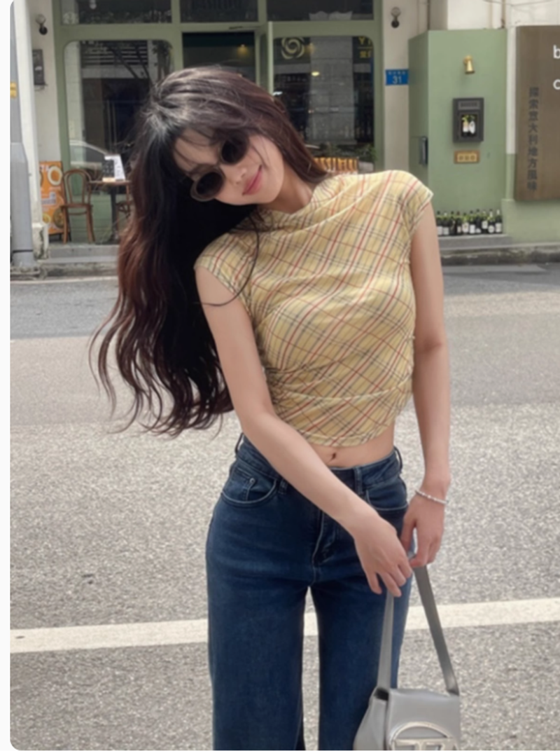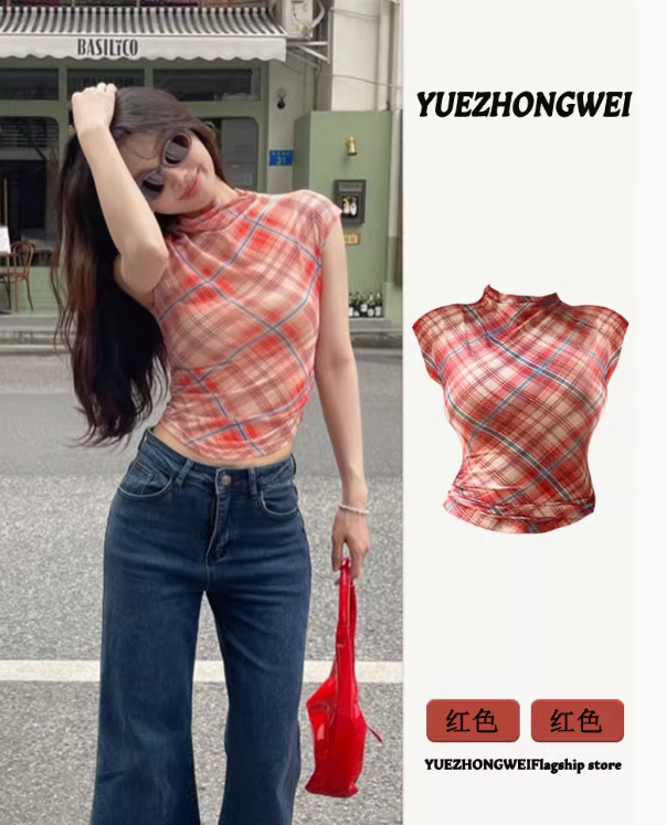 美式辣妹微透網紗紅色格子正肩短袖T恤女夏季修身短款甜辣小上衣