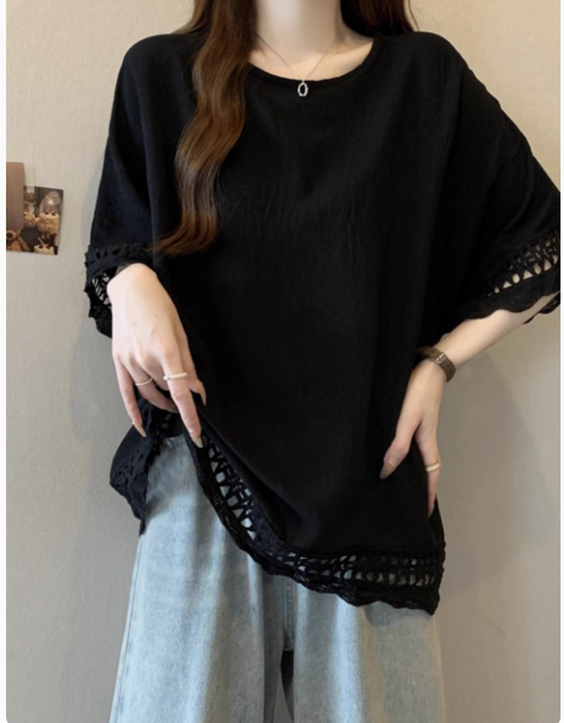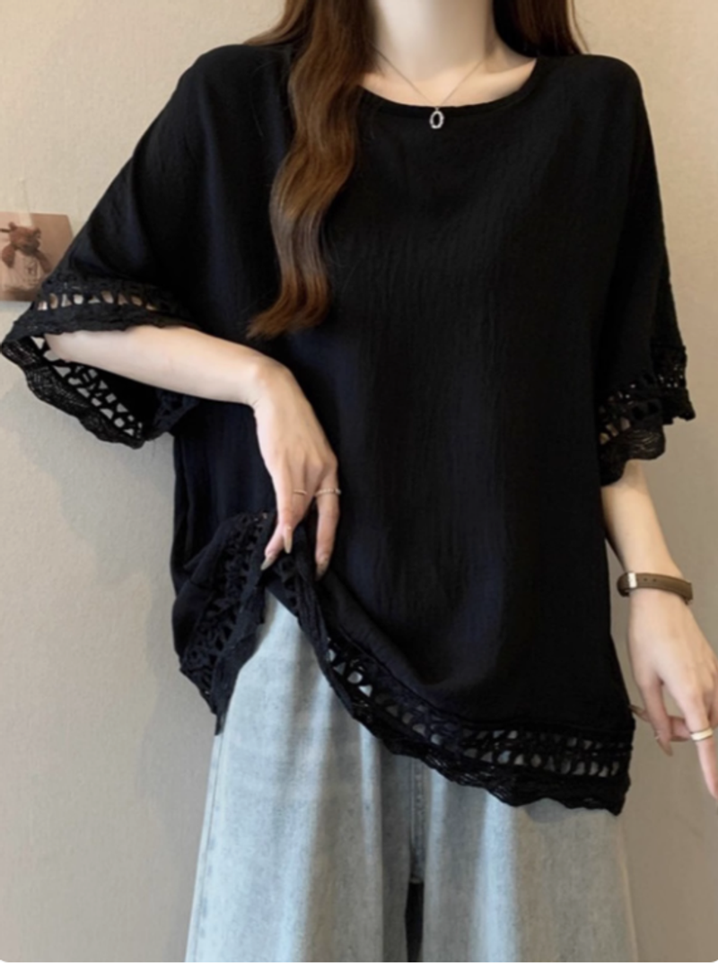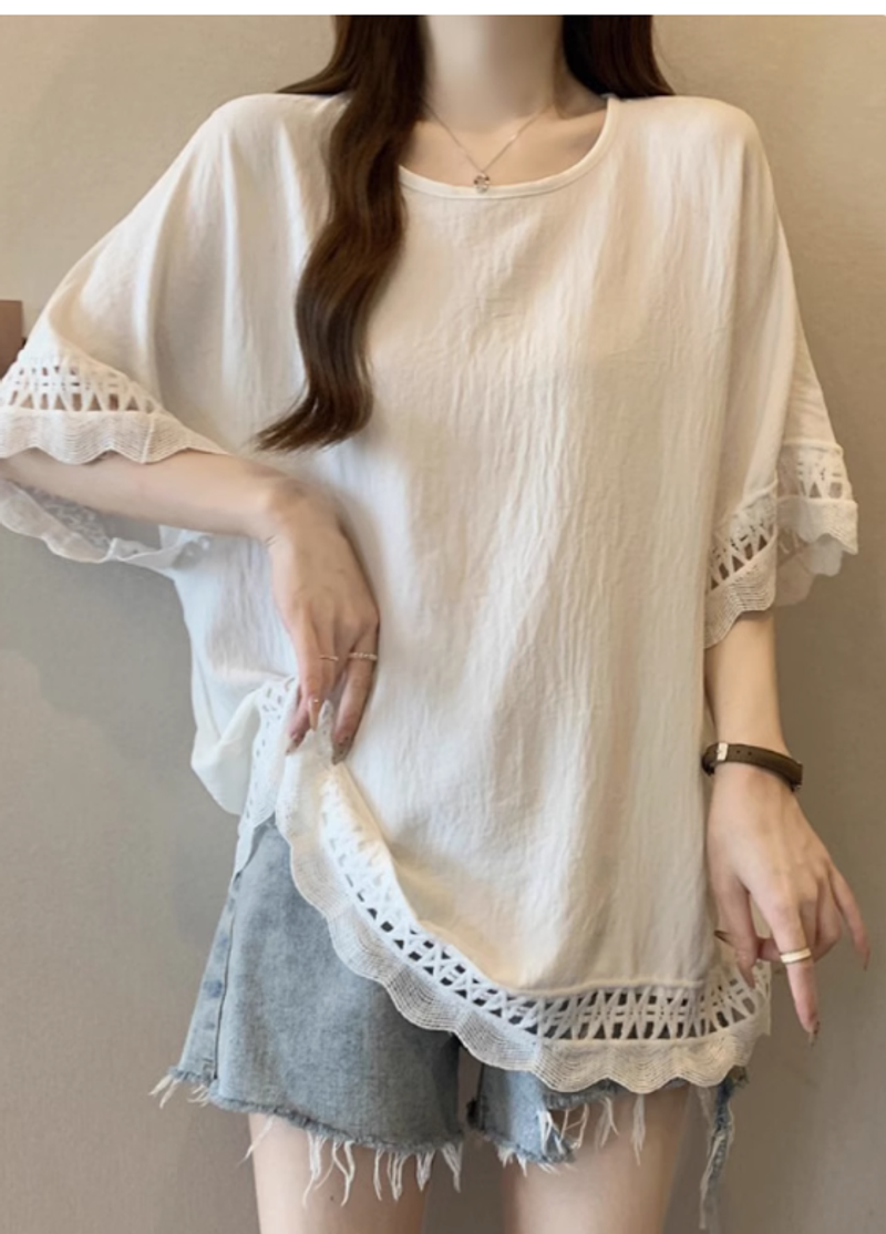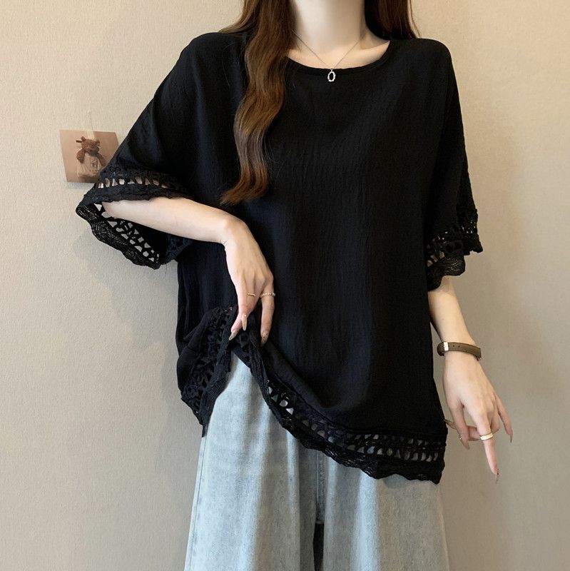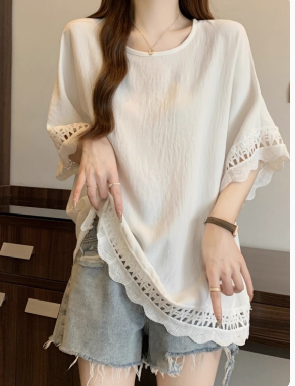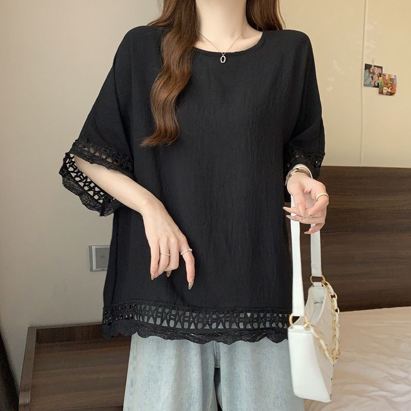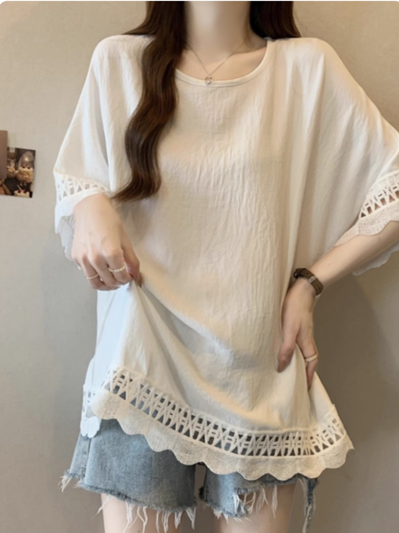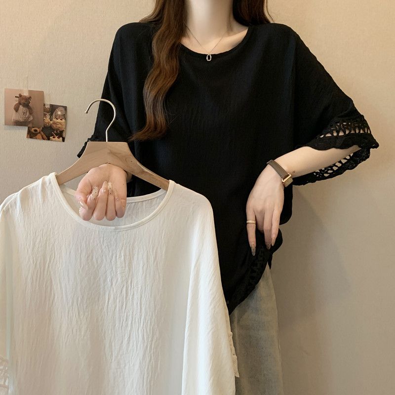 蕾絲鏤空肌理感慵懶風短袖t恤女2025夏季大碼微胖妹妹遮肚子上衣