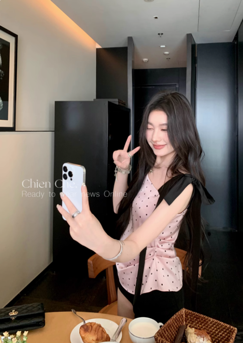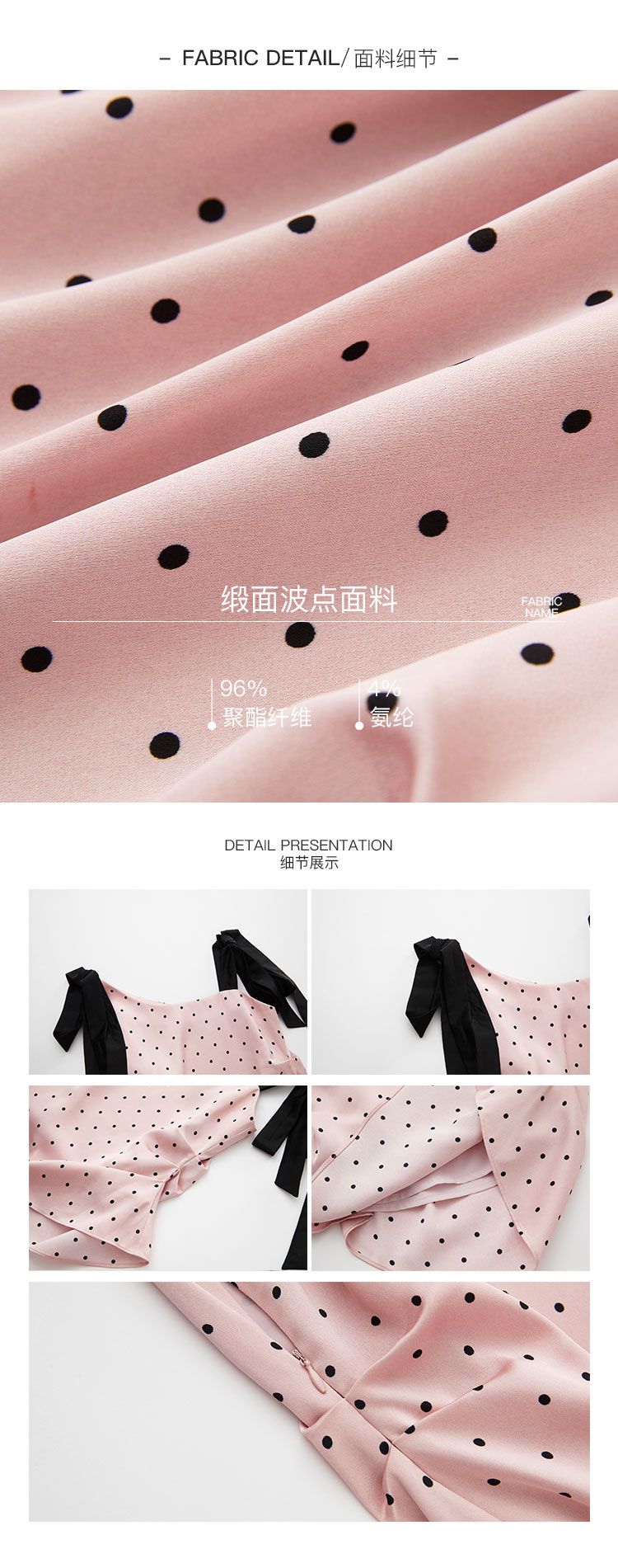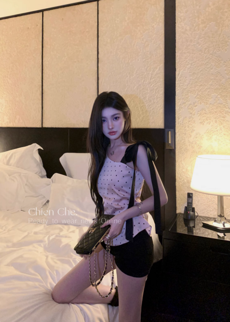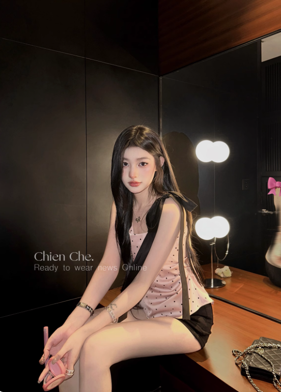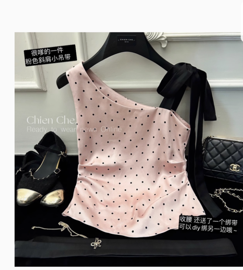 車遲恩Chien 純欲風無袖上衣夏 性感顯瘦粉色波點斜肩吊帶背心女
