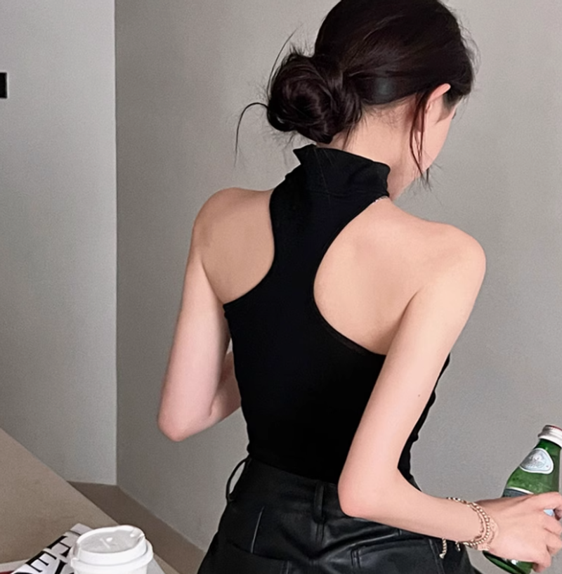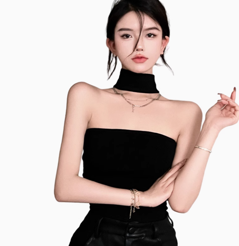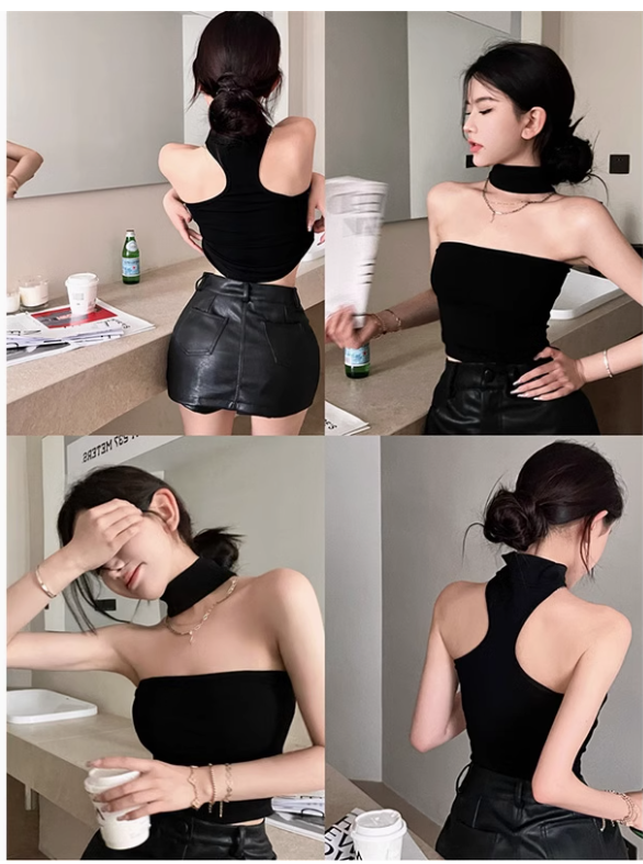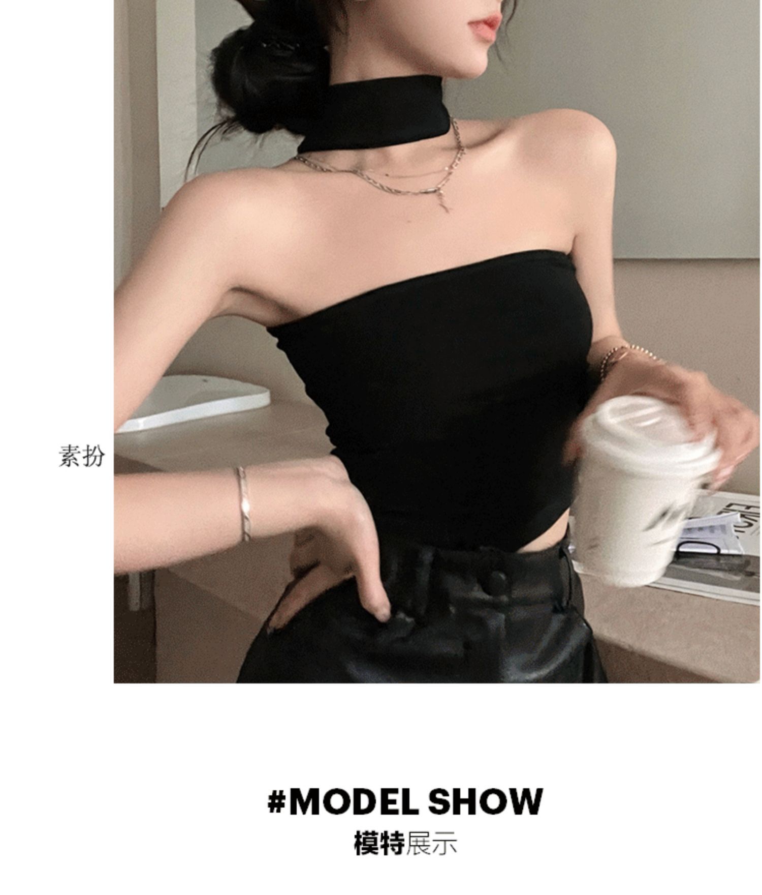 辣妹黑色掛脖吊帶背心女內搭外穿抹胸裹一字肩修身純欲性感短上衣