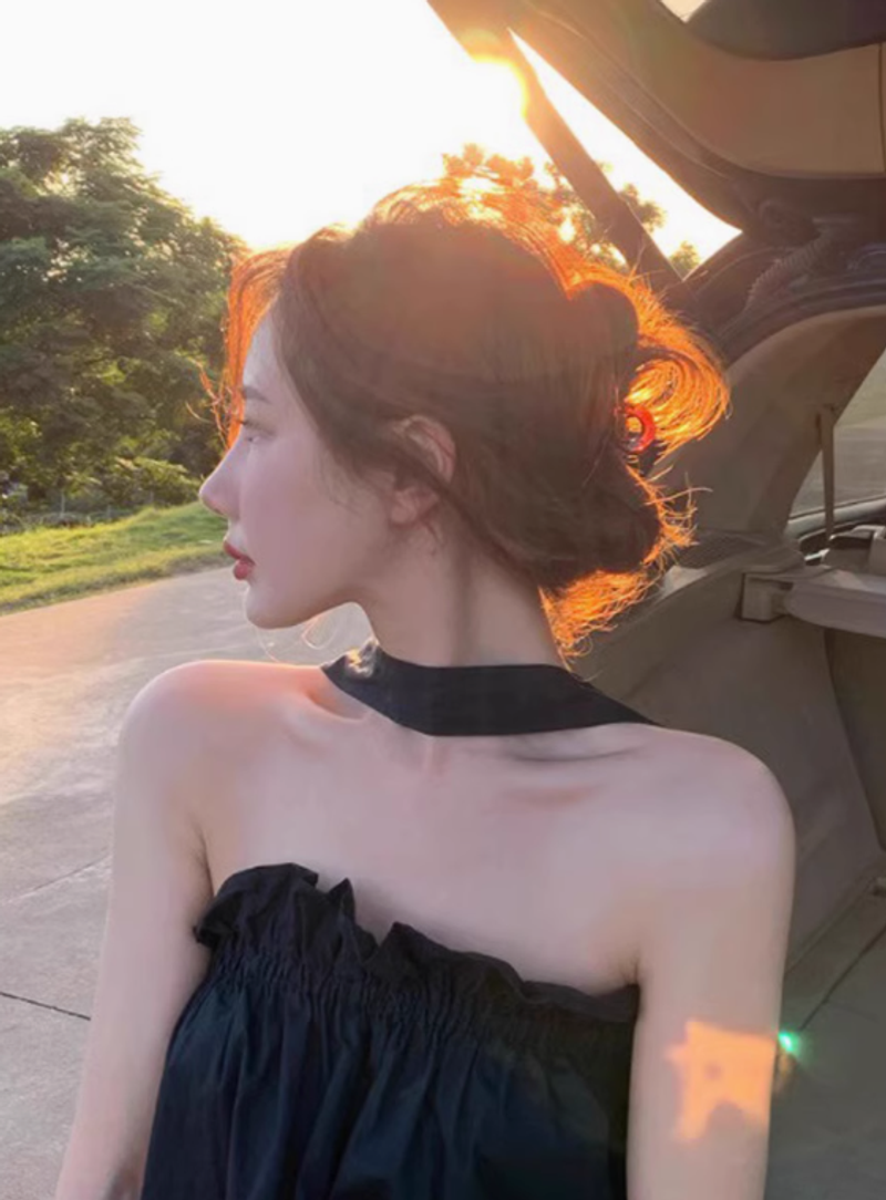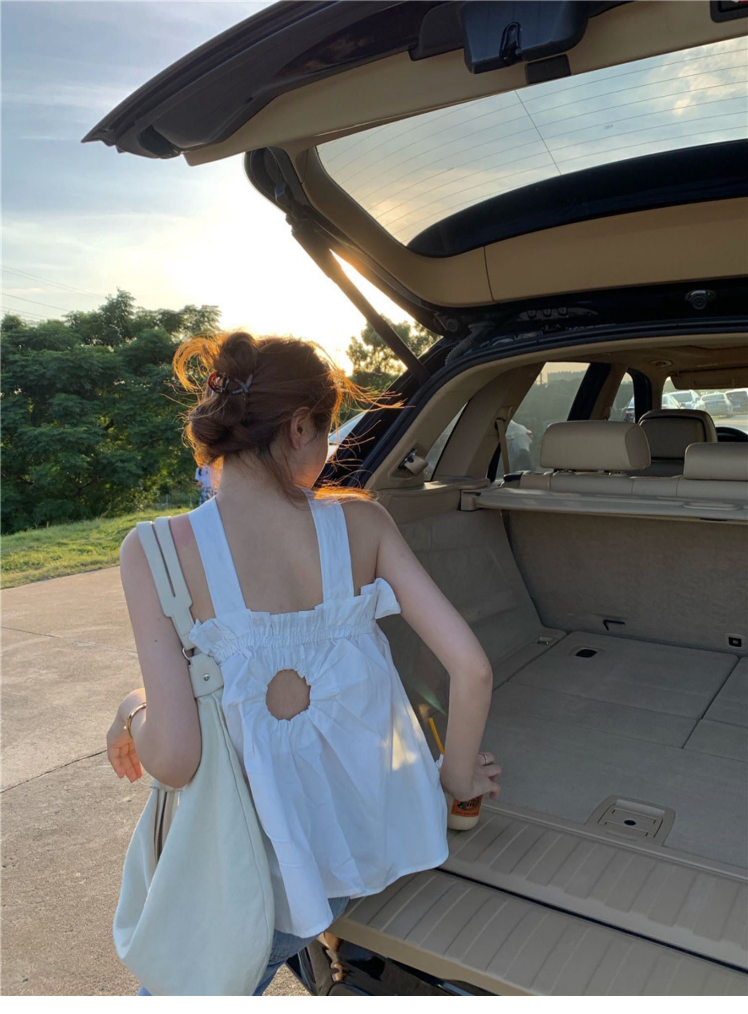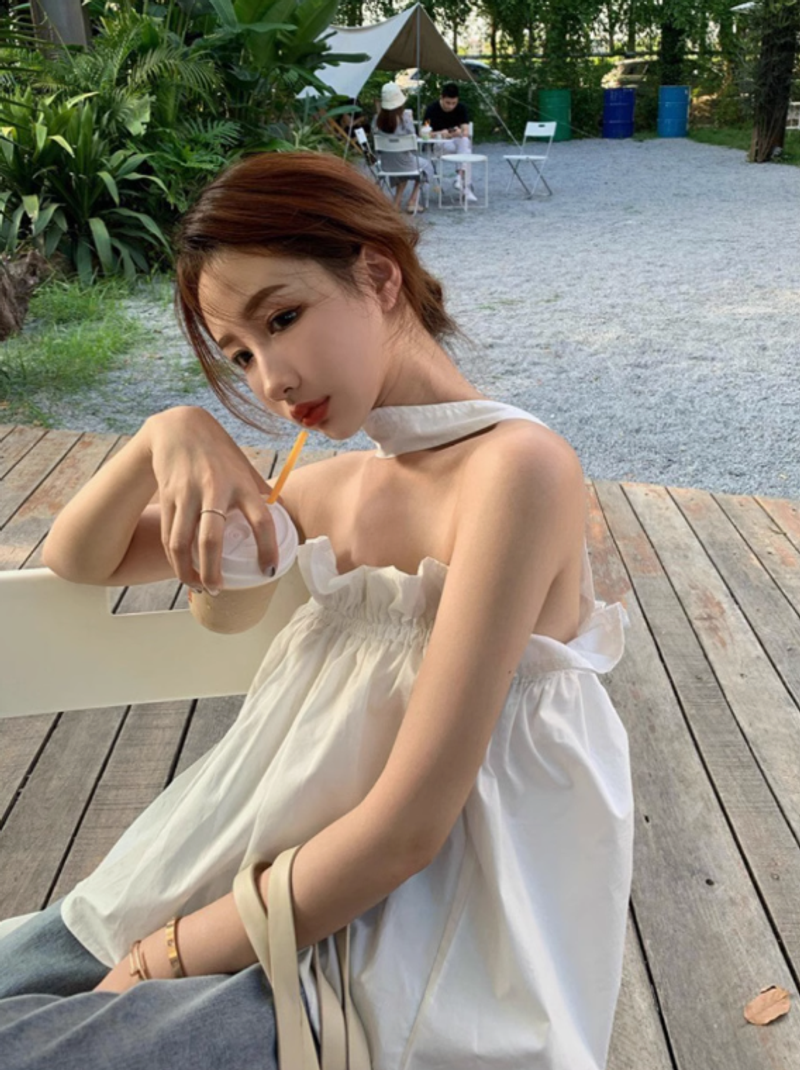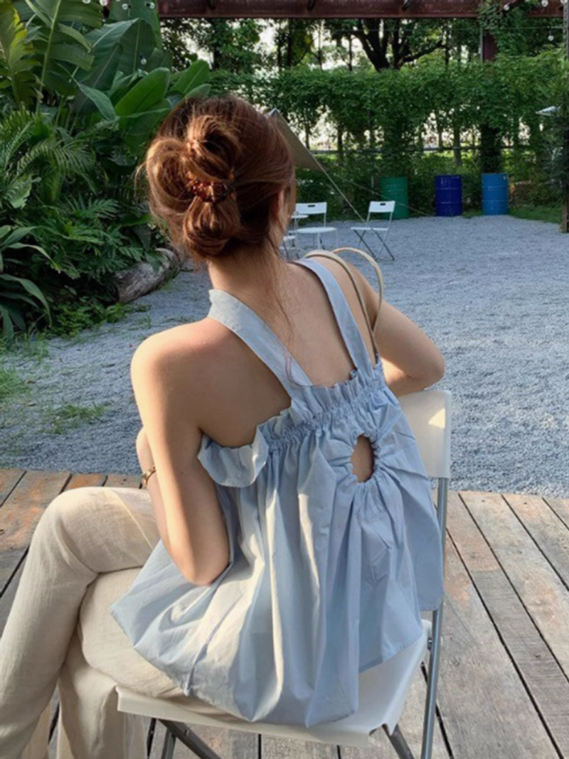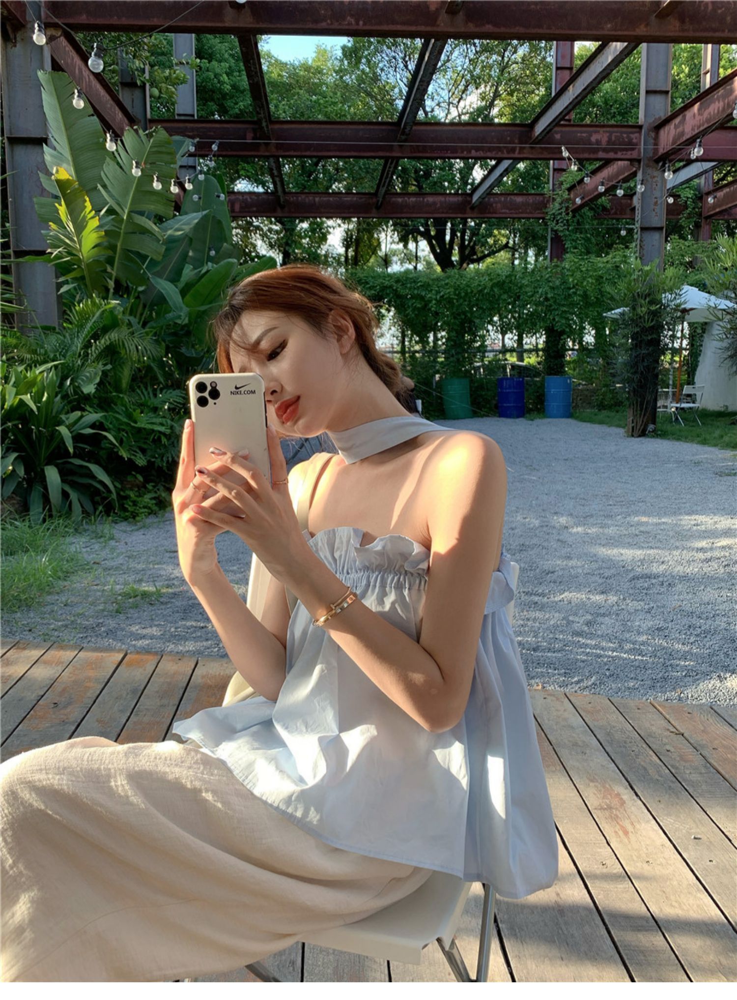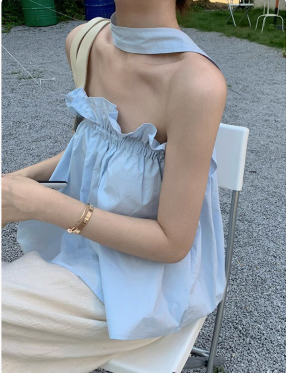 韓版甜美木耳邊掛脖吊帶背心女夏寬鬆褶皺減齡休閒高級感抹胸上衣