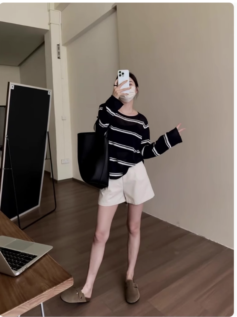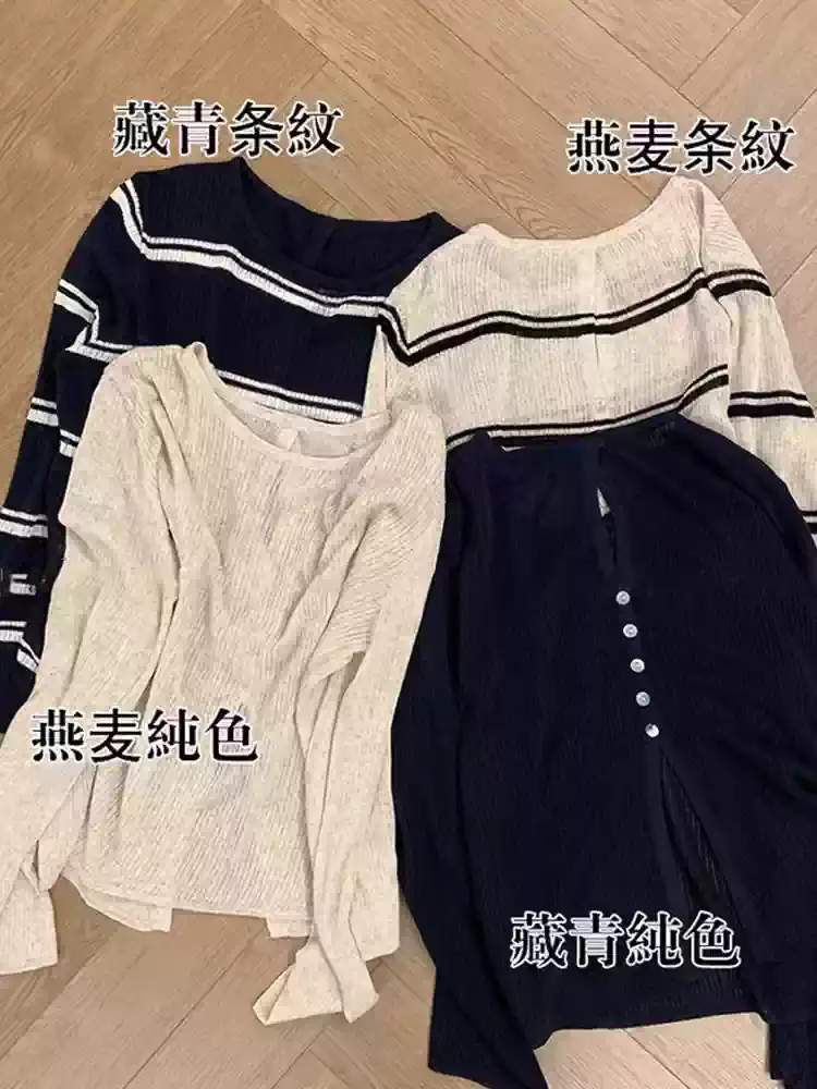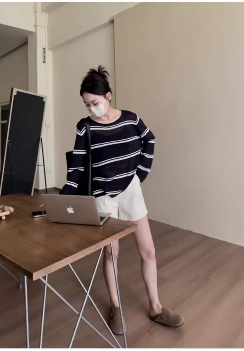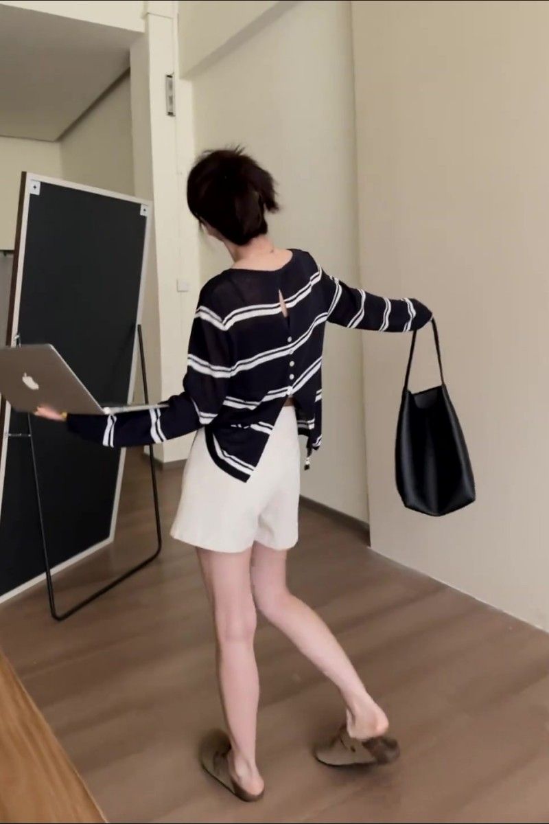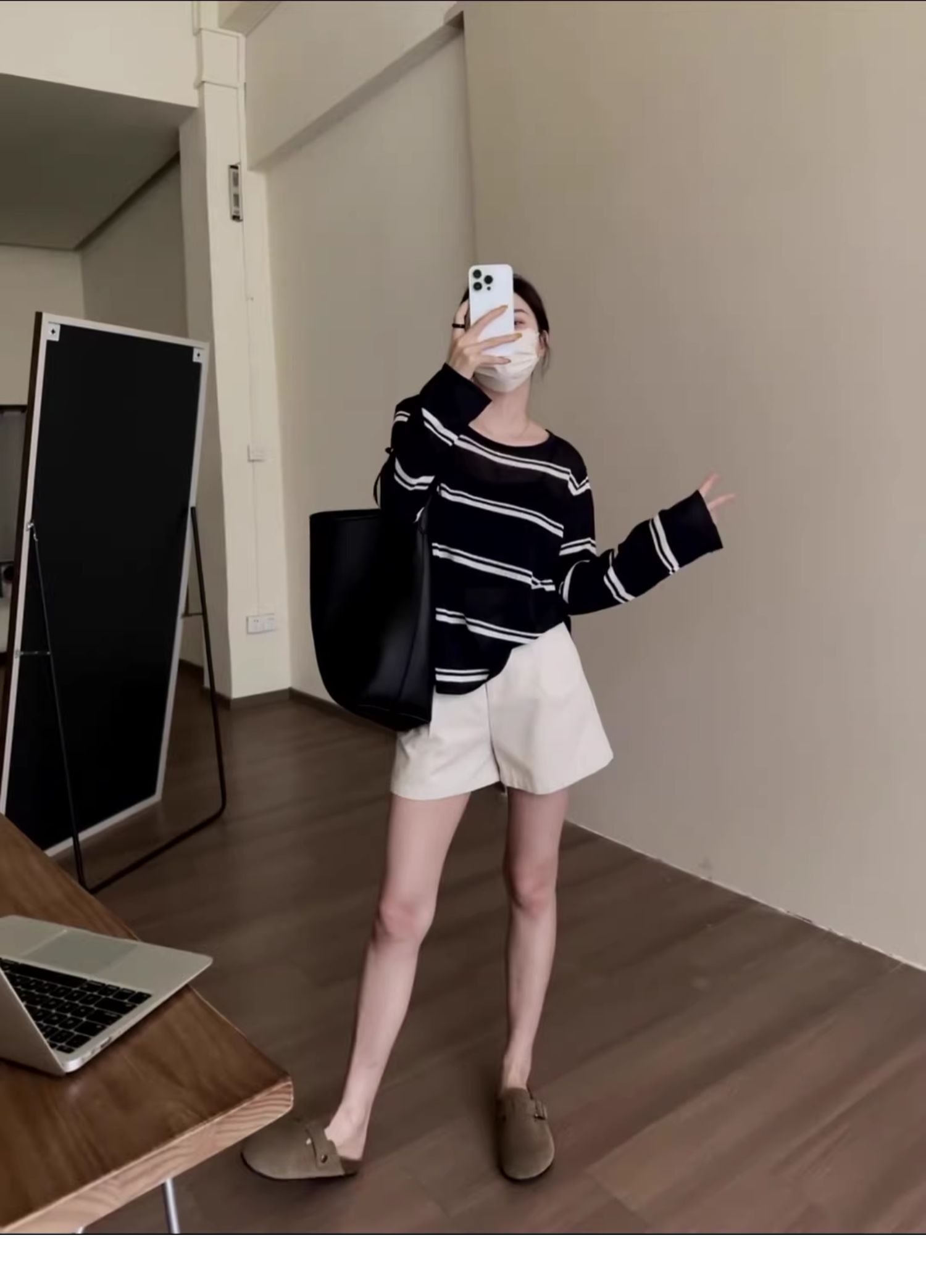韓繫條紋防曬長袖t恤罩衫女夏季後背鏤空小衫外搭正肩冰絲上衣薄