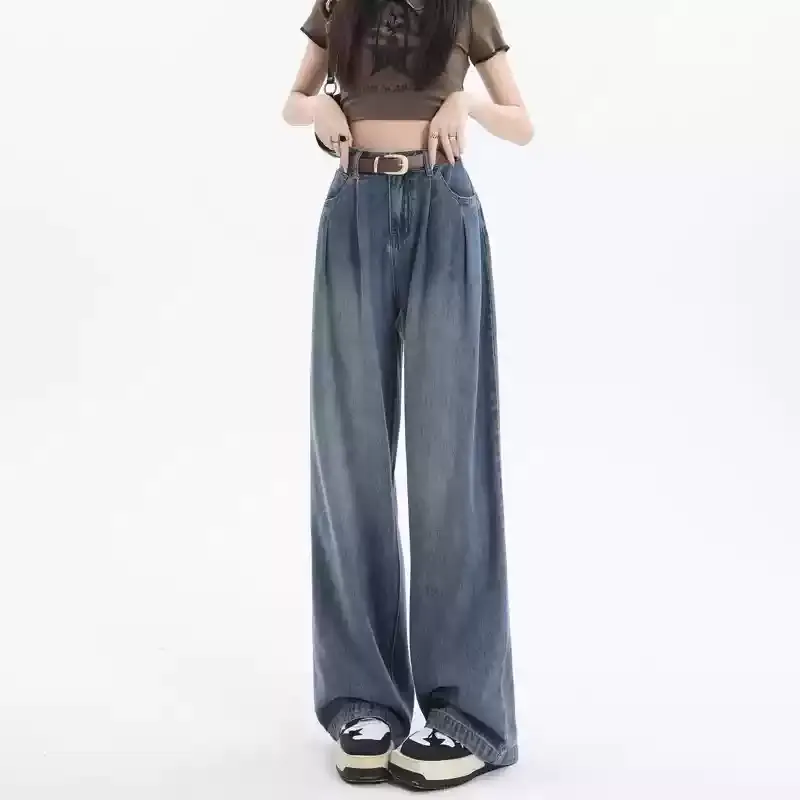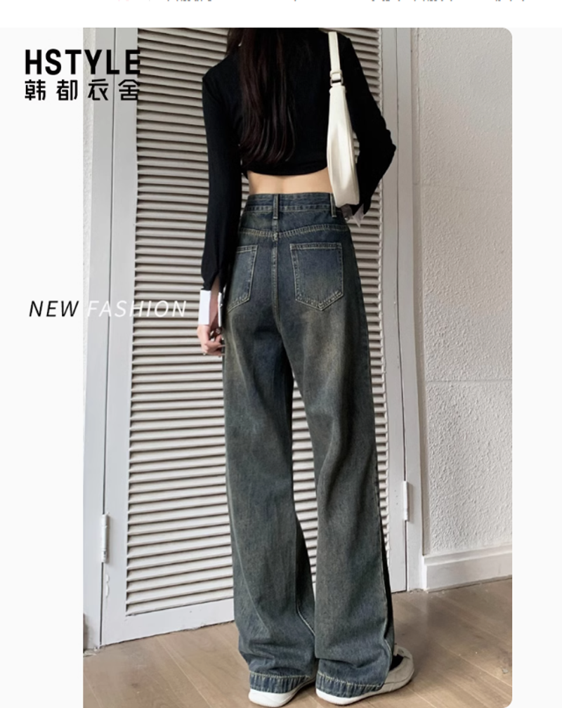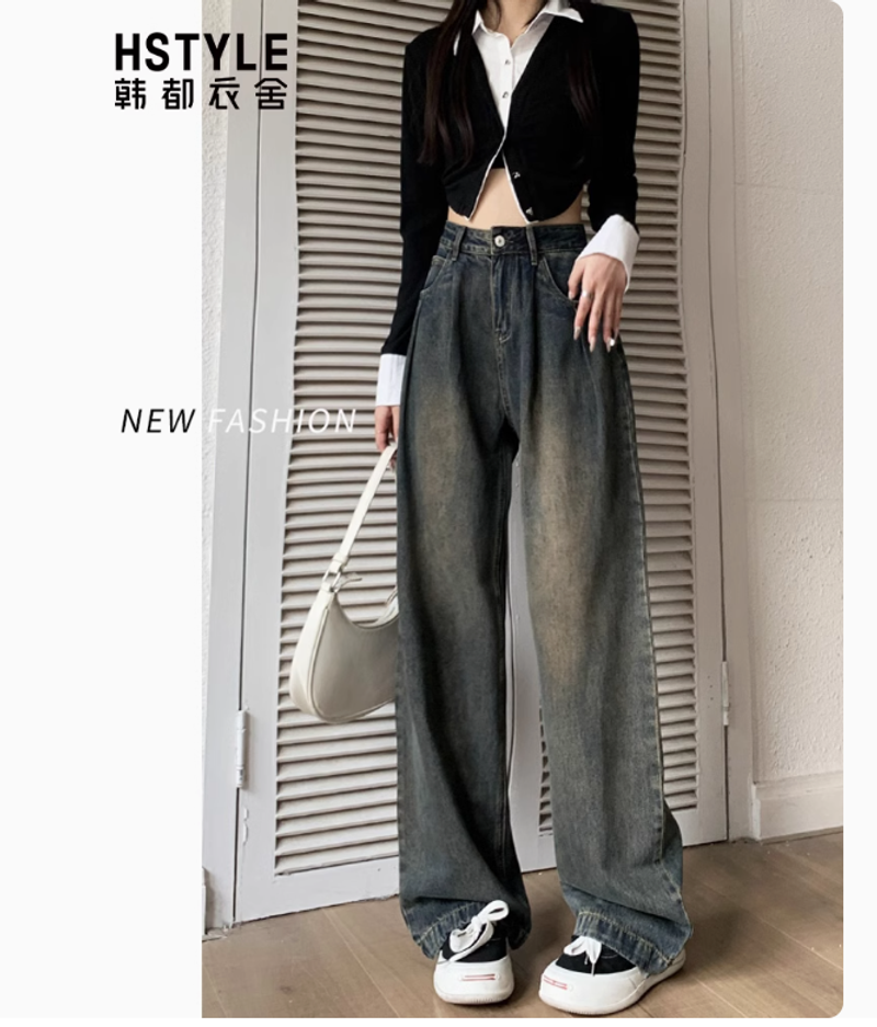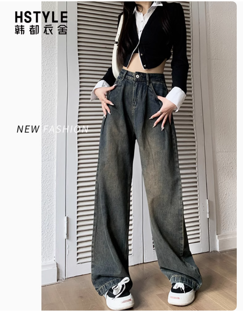 韓都衣舍闊腿牛仔褲女2025新款小個子高腰寬鬆垂感直筒褲子春秋款
