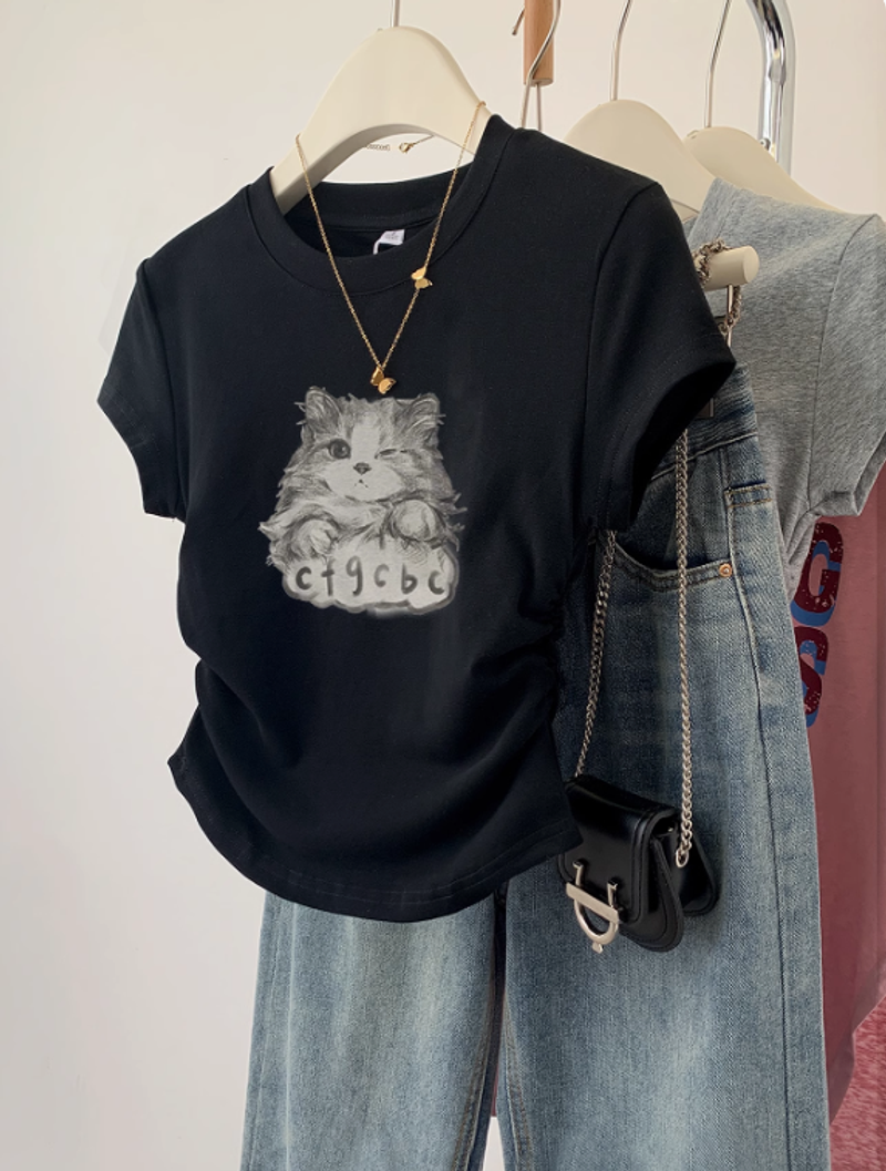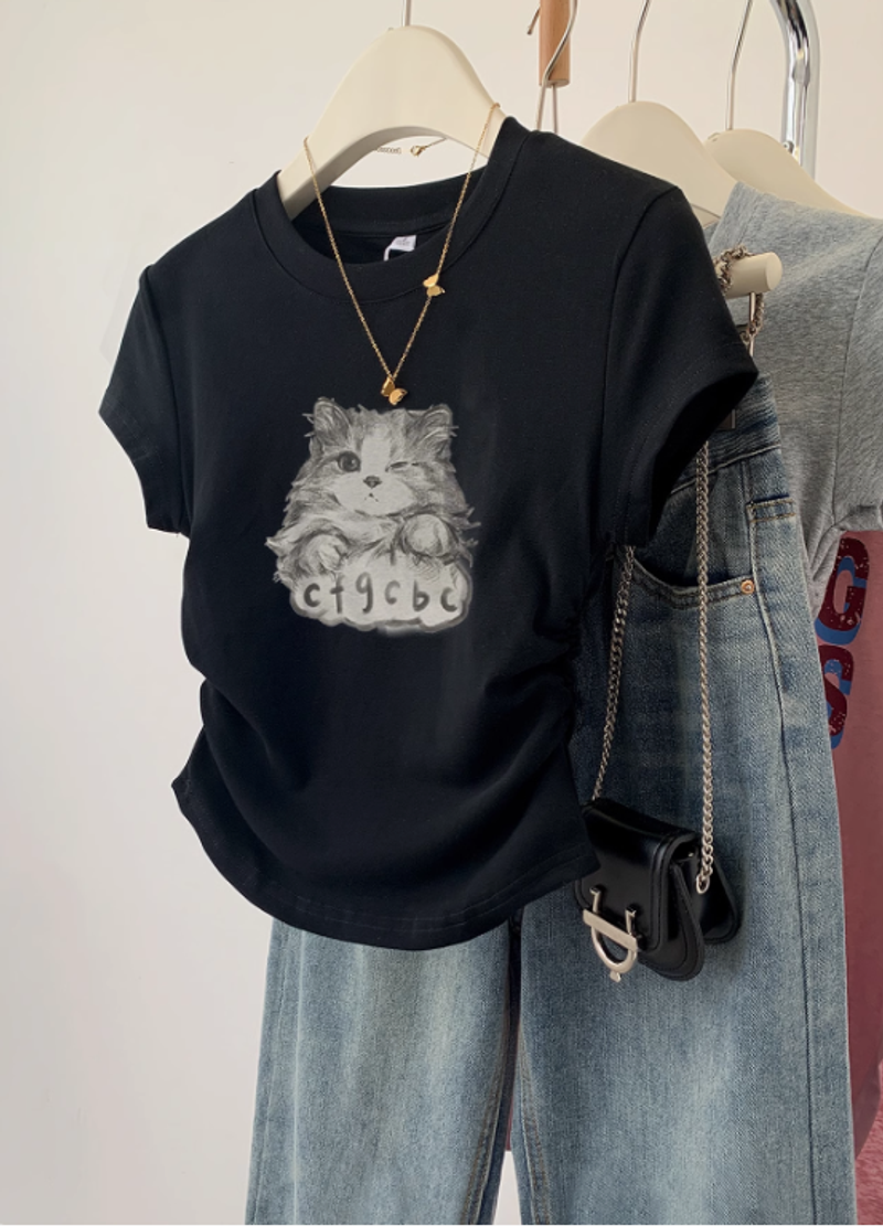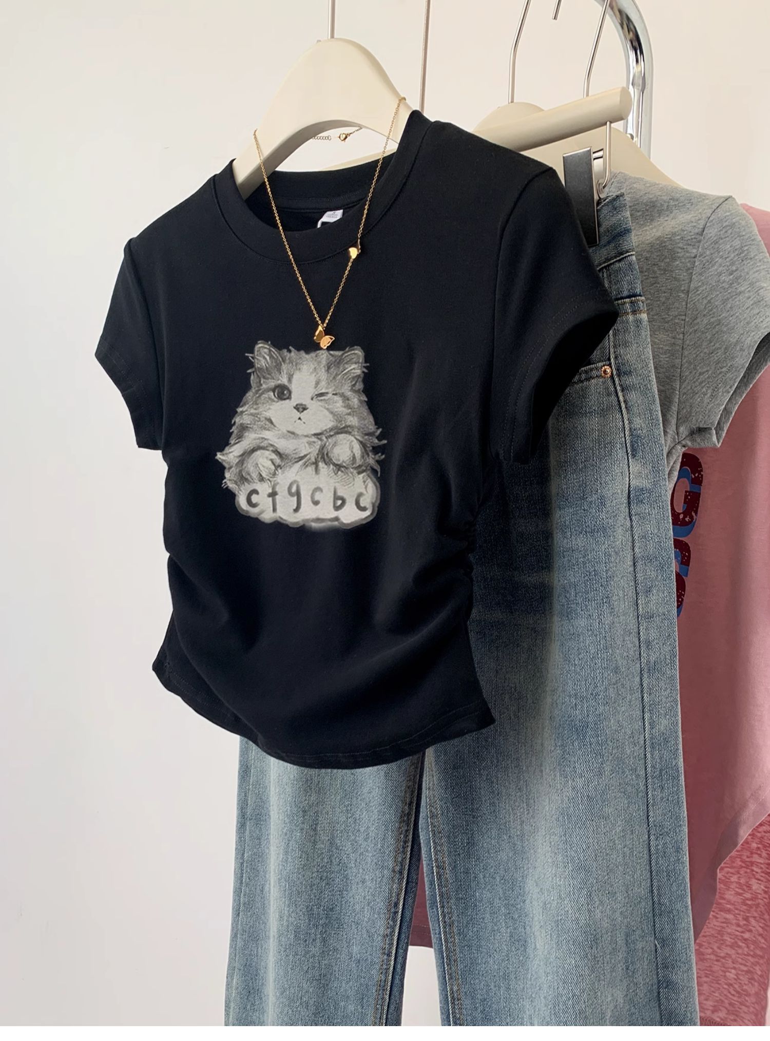 黑色貓咪正肩短袖t恤衫女夏季夏2025新款設計感小衆修身短款上衣