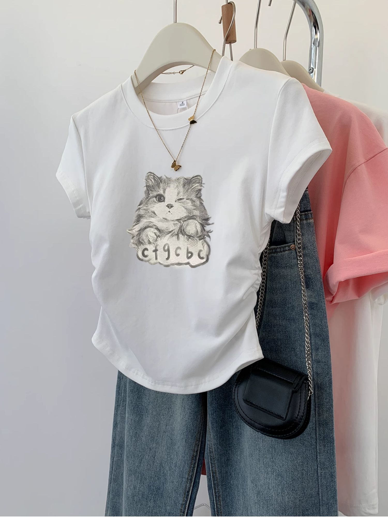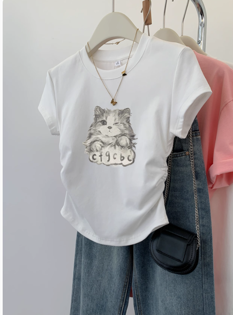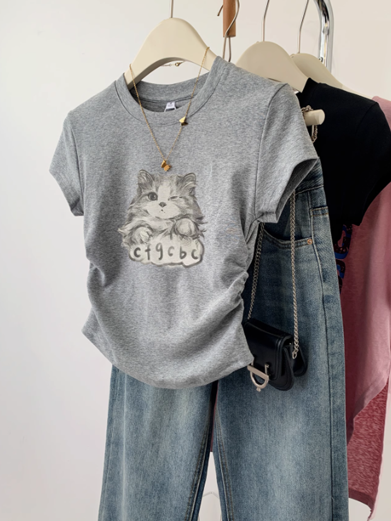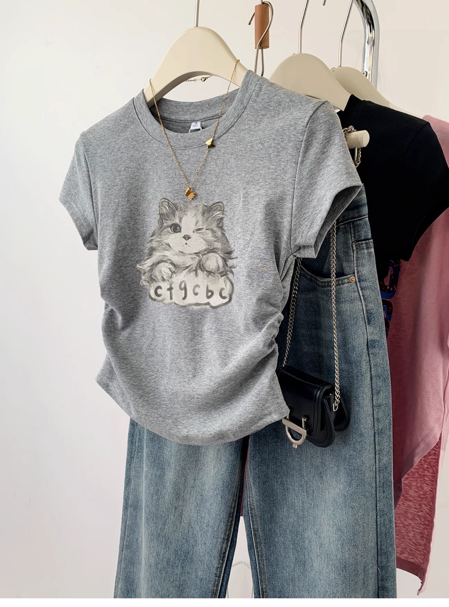 黑色貓咪正肩短袖t恤衫女夏季夏2025新款設計感小衆修身短款上衣