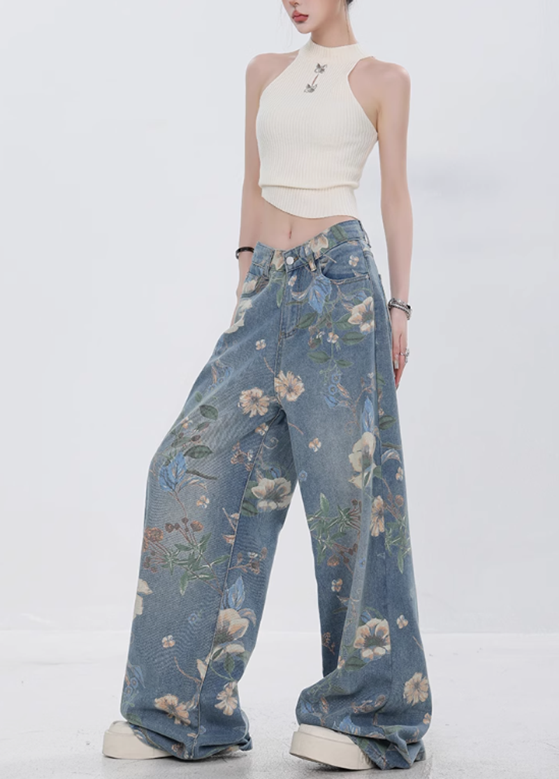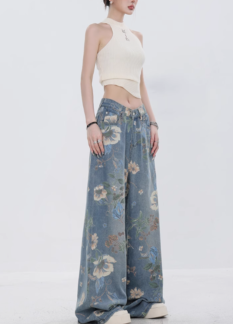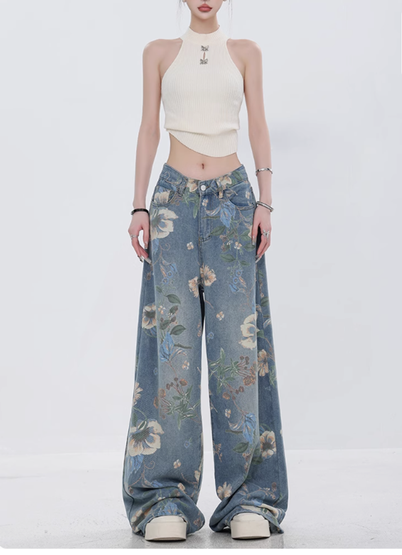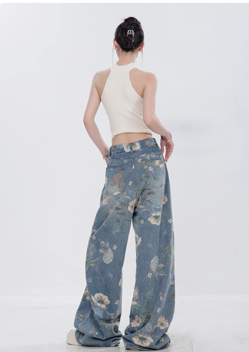 ABWEAR 2025年新款美式復古印花闊腿牛仔褲女小衆設計直筒拖地褲