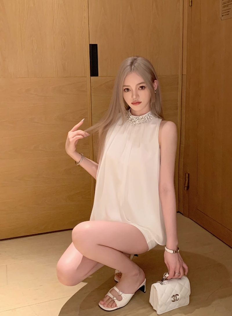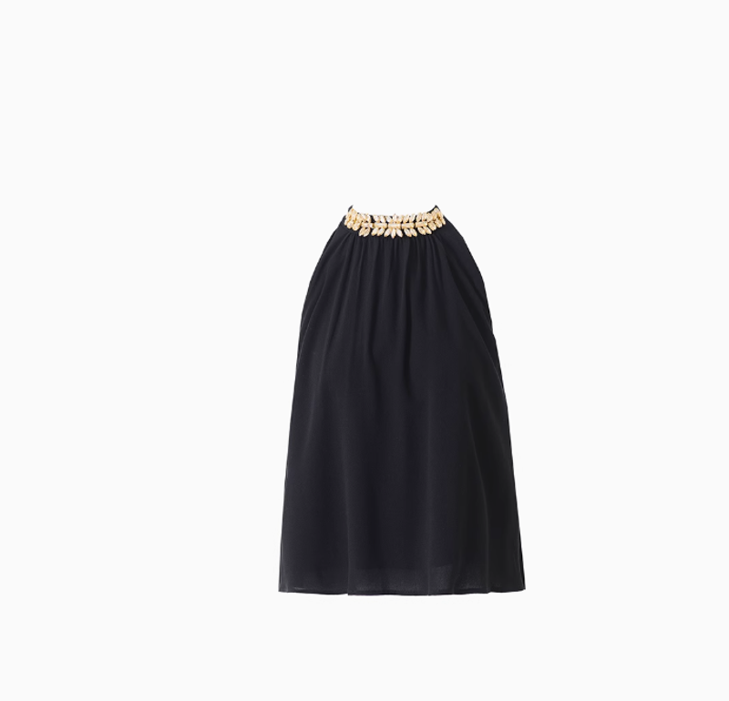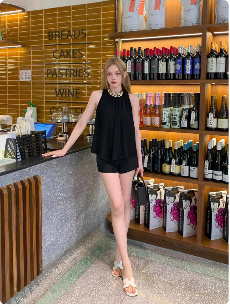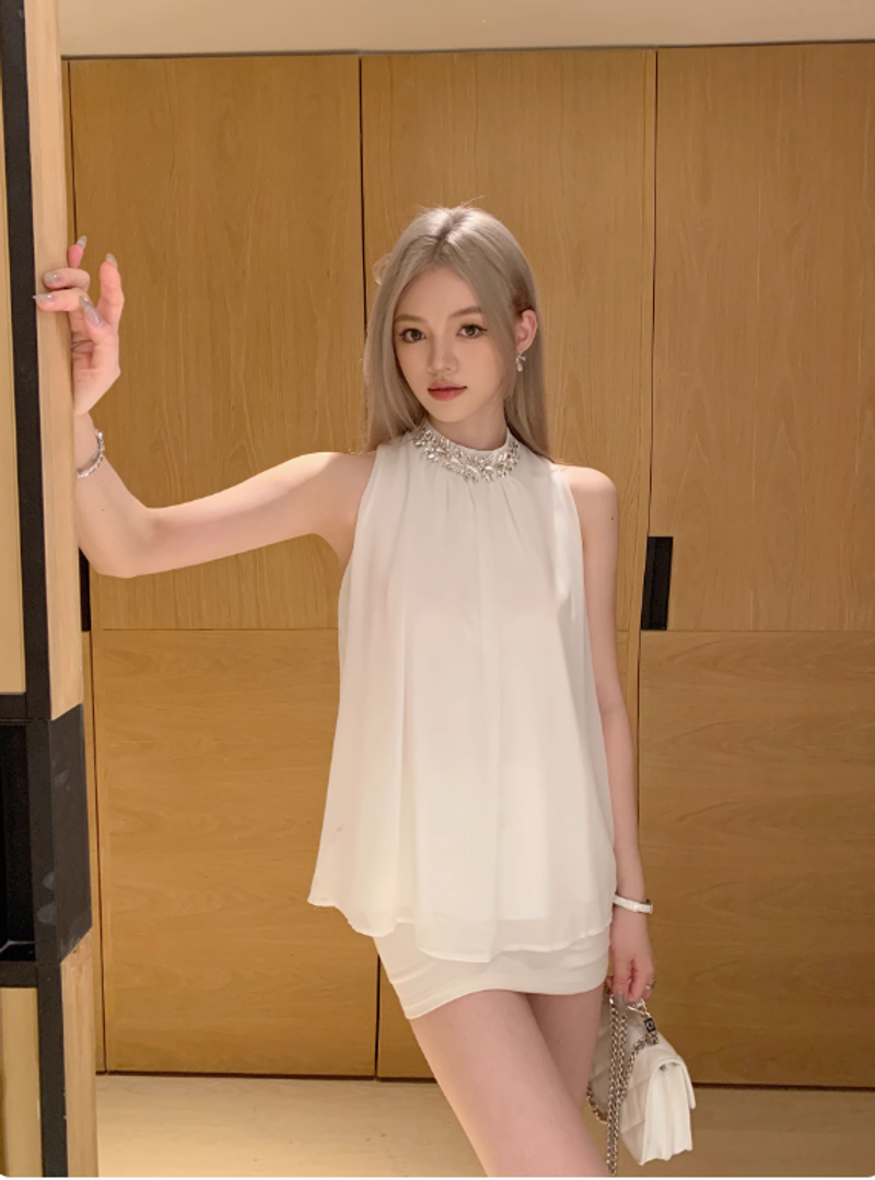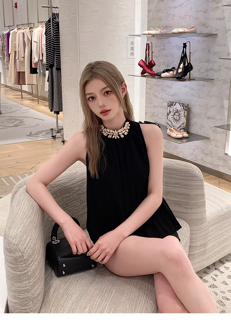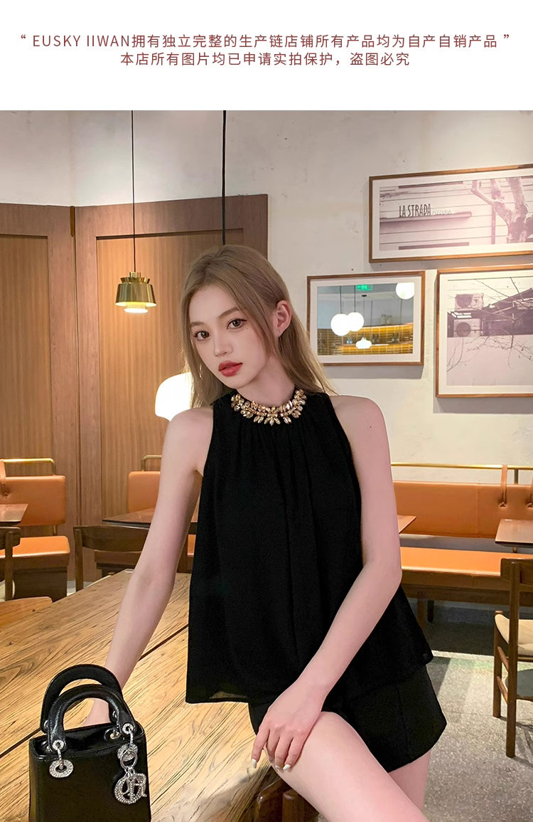EUSKY IIWAN 黑色法式高級感鑽鏈無袖掛脖上衣女辣妹寬松顯瘦小衫