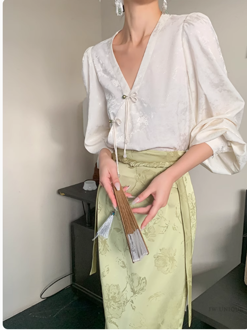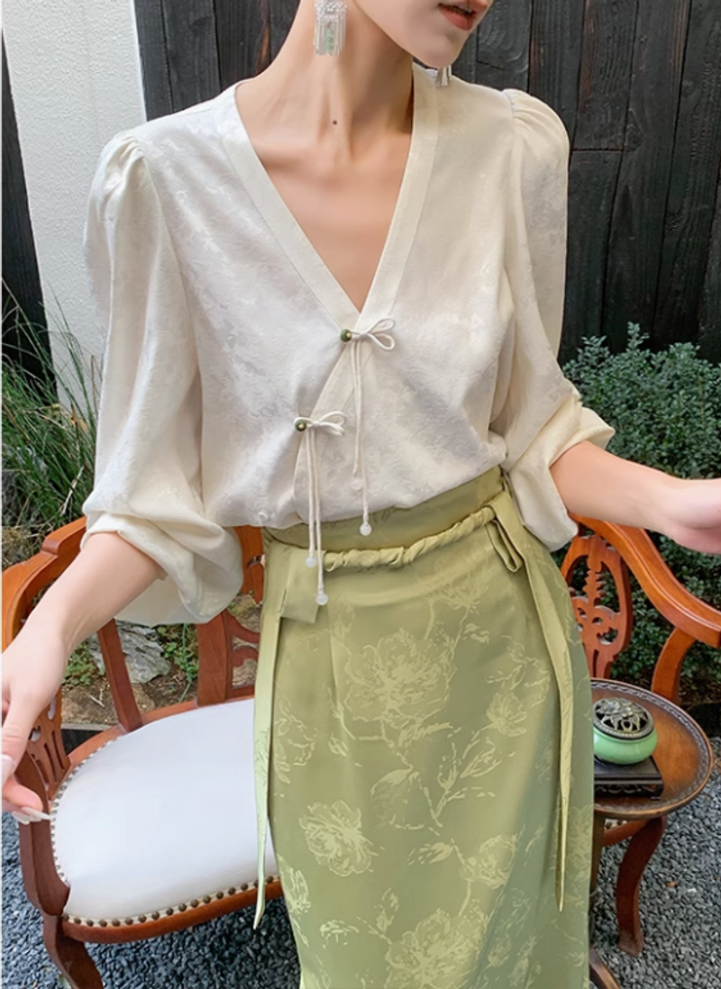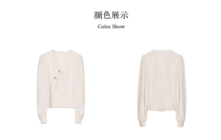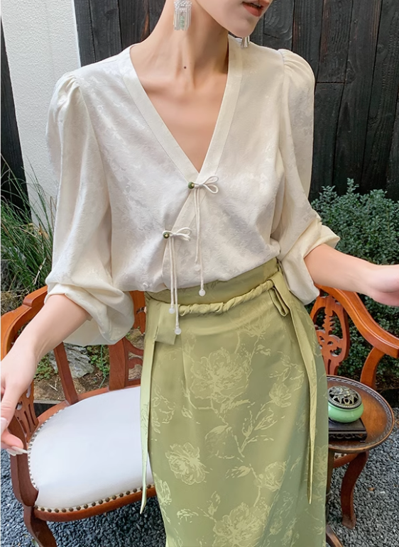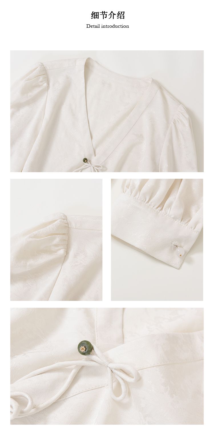 JWUNIQUE 米白色新中式國風泡泡袖長袖V領襯衫女2025新款休閒上衣