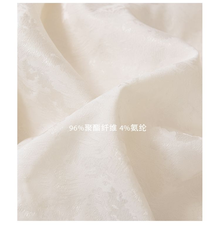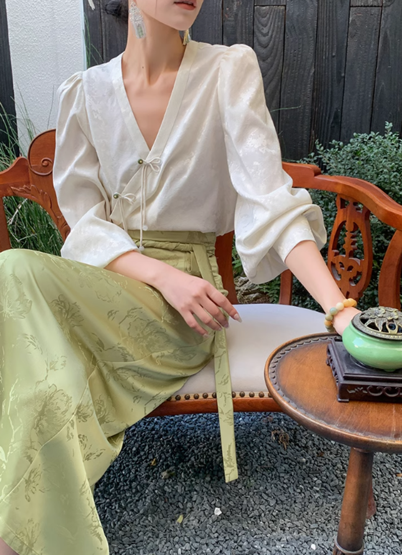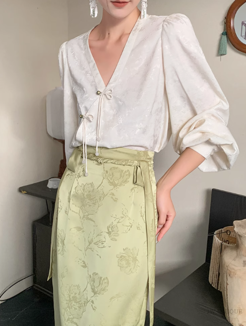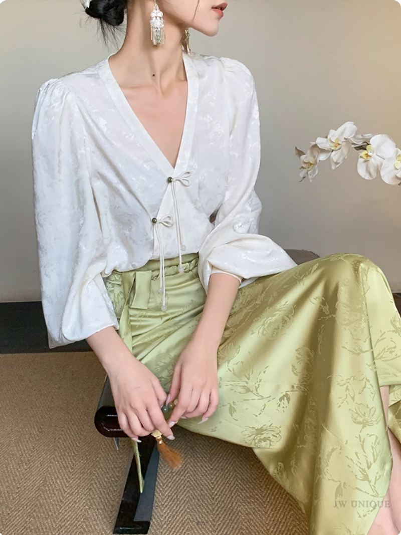 JWUNIQUE 米白色新中式國風泡泡袖長袖V領襯衫女2025新款休閒上衣