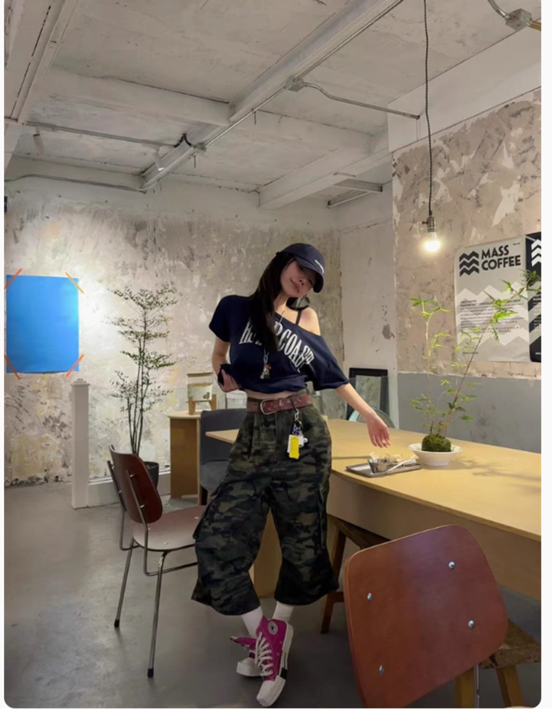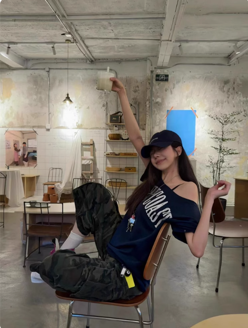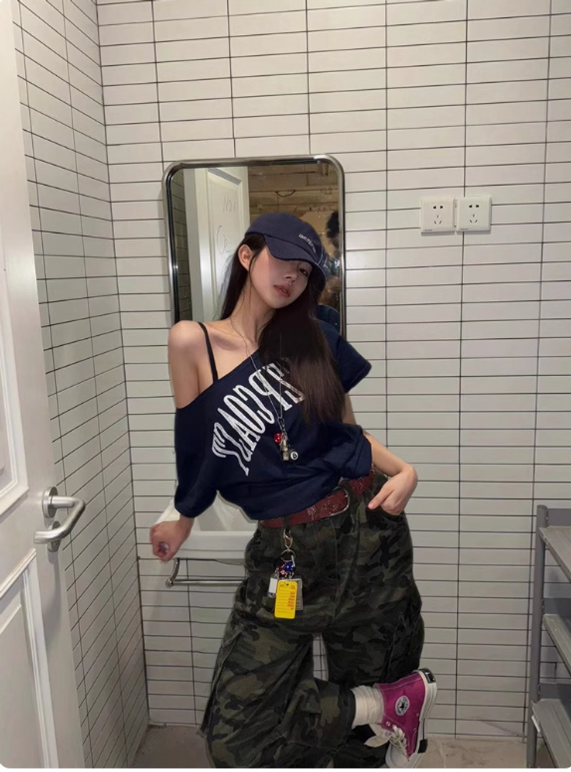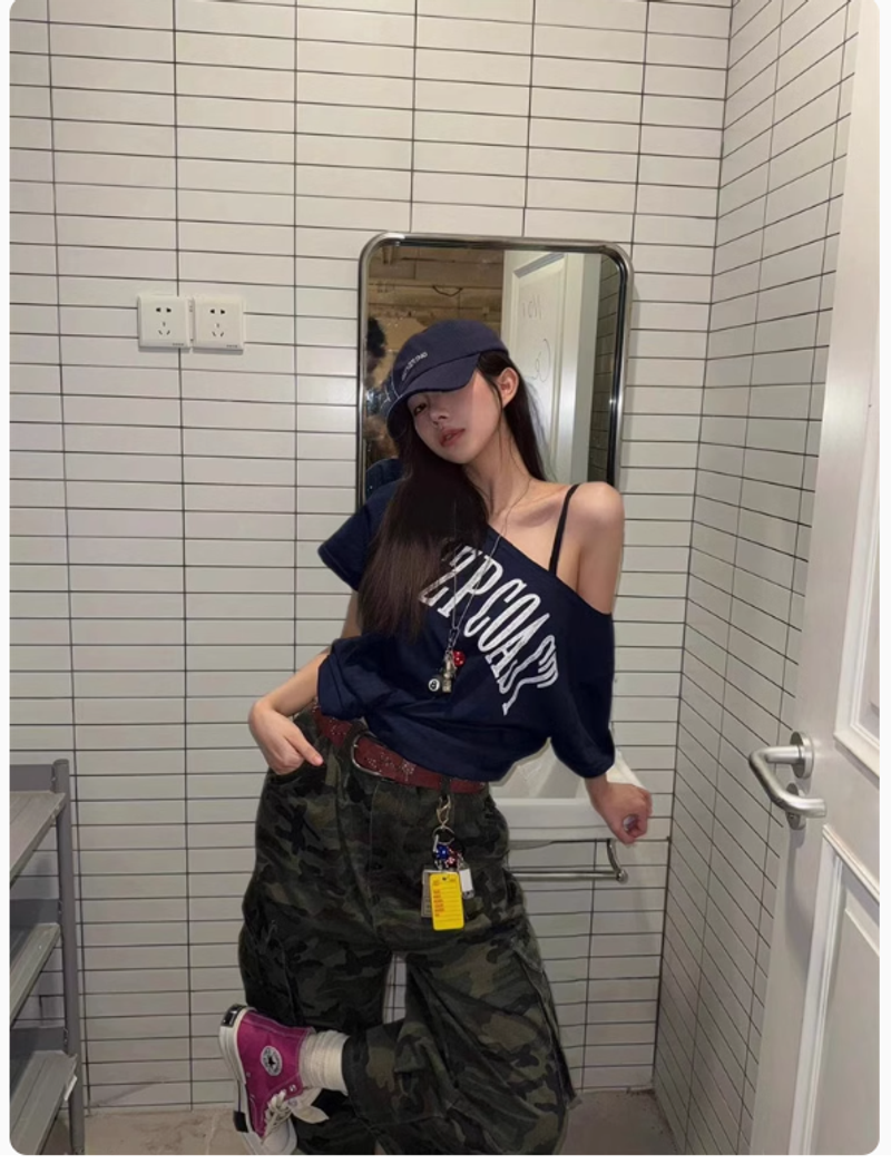 Pumpkin美式復古辣妹露肩斜肩新款短袖T恤女上衣女寬鬆夏季上衣