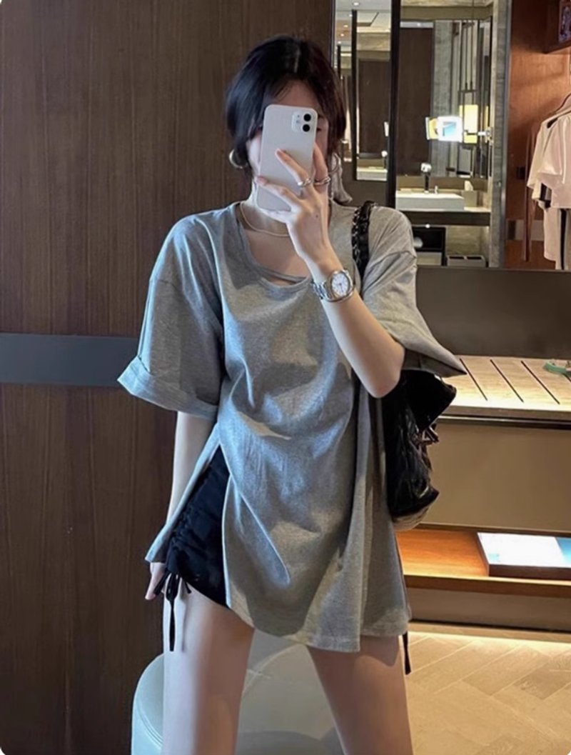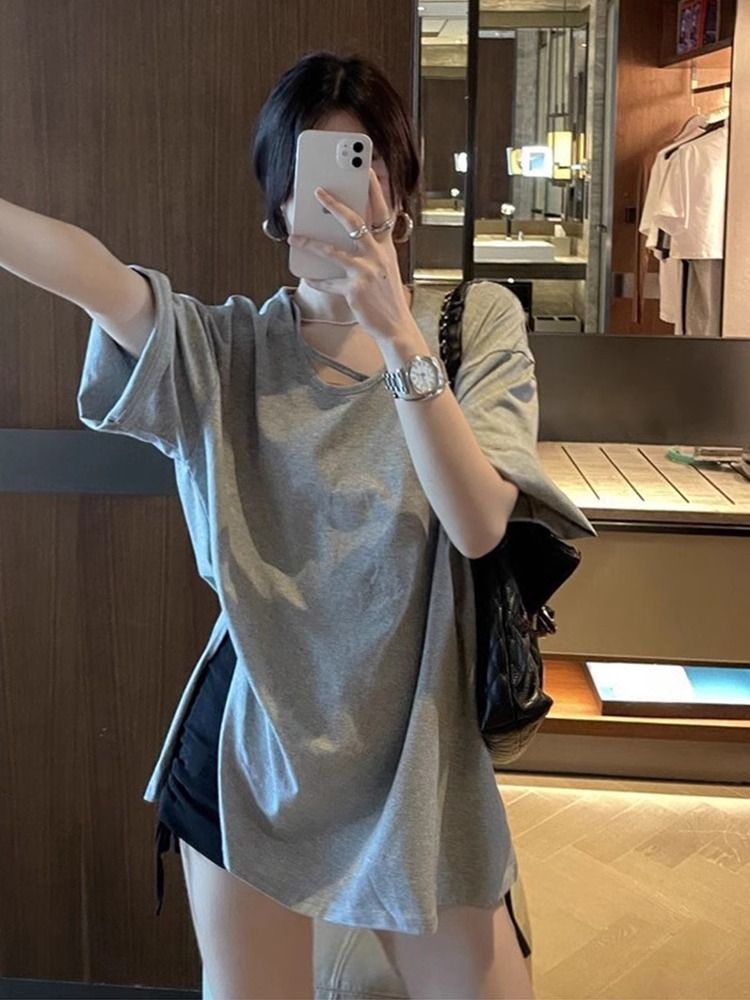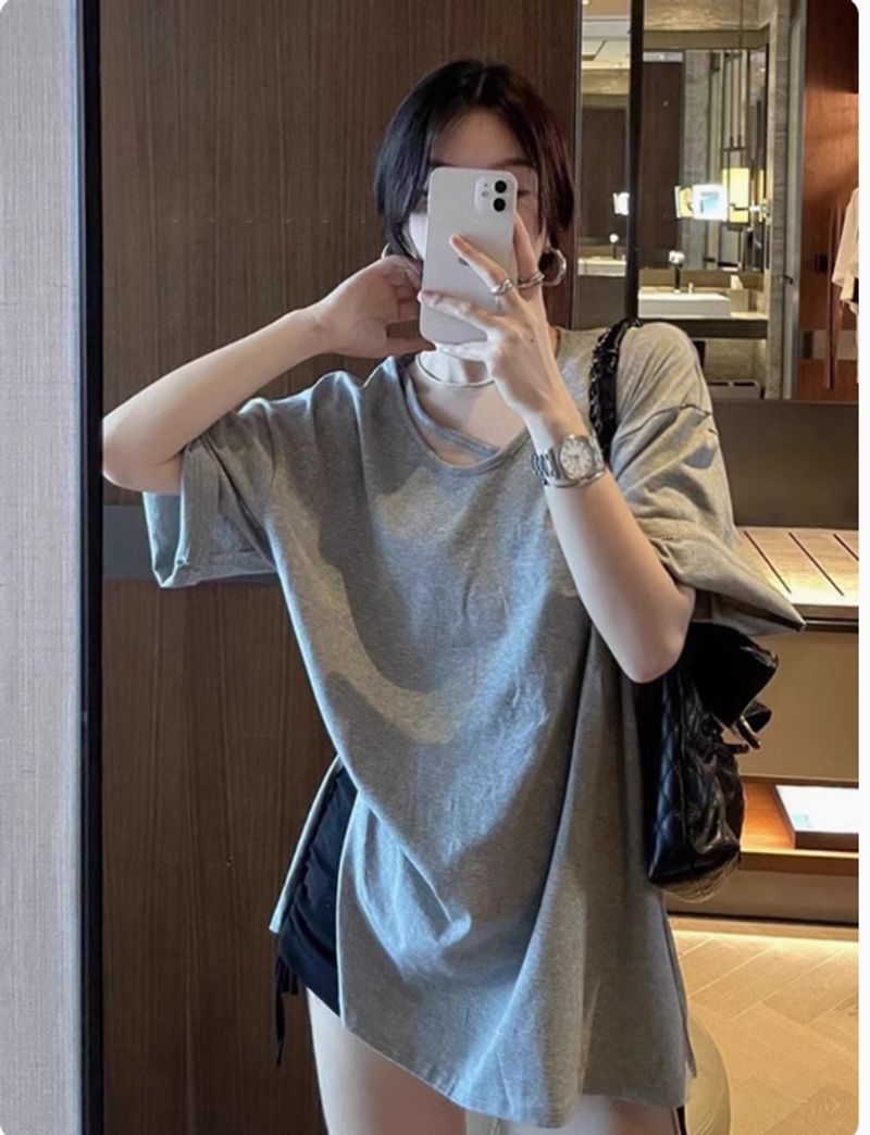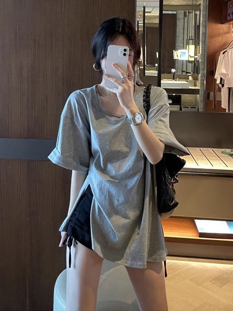 U領百搭短袖t恤女夏季寬鬆大碼純棉顯瘦中長款開叉半袖上衣設計感