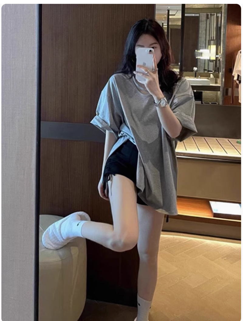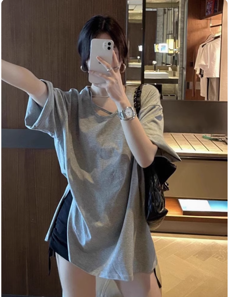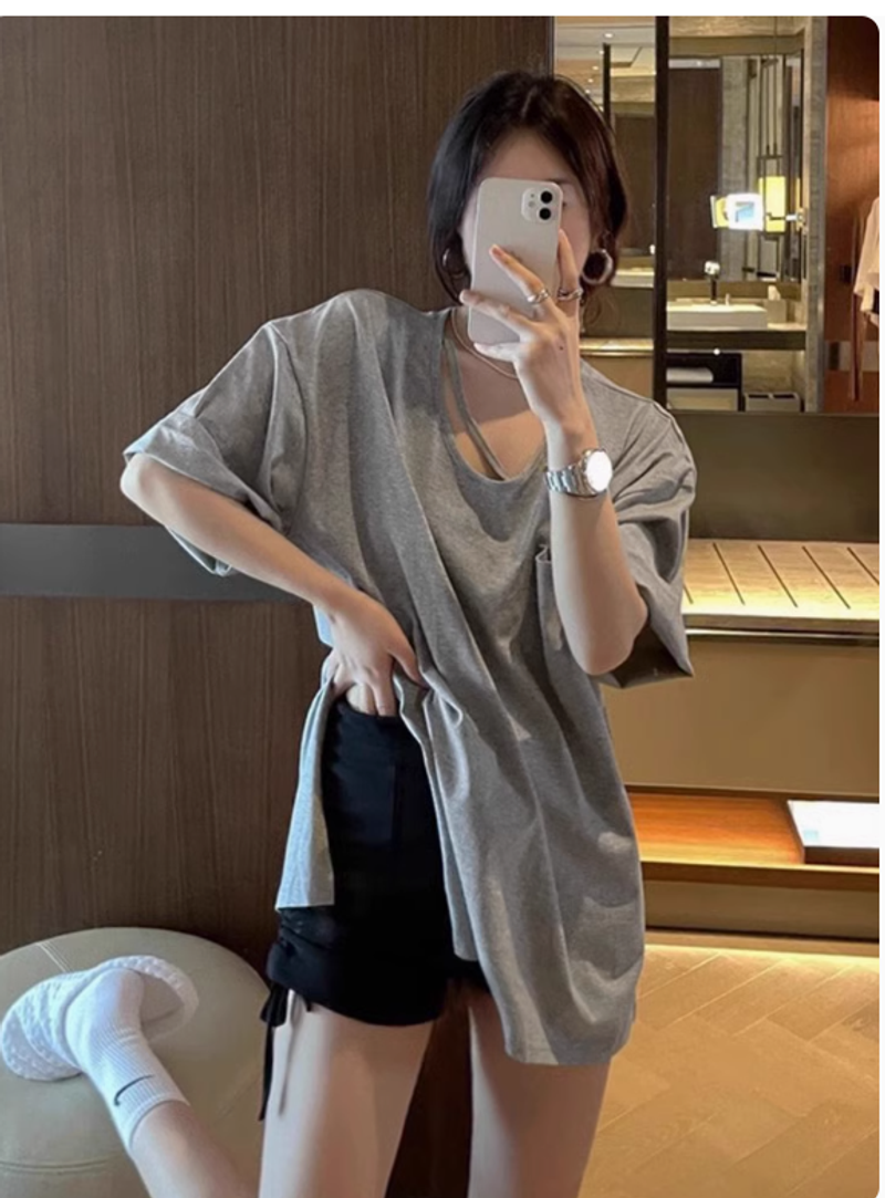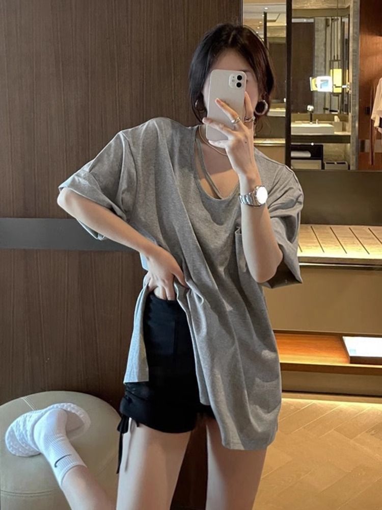 U領百搭短袖t恤女夏季寬鬆大碼純棉顯瘦中長款開叉半袖上衣設計感